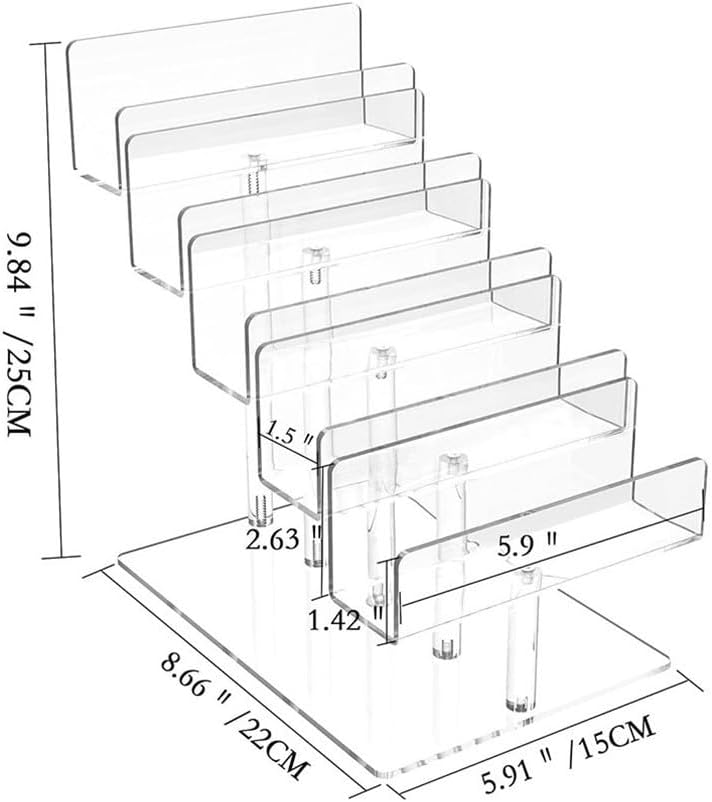 Materiale acrilico: realizzato in robusto acrilico da 3 mm, questo espositore offre una durata superiore rispetto al vetro o alla plastica, salvaguardando la tua collezione dai graffi durante il trasporto. Organizzatore a 5 livelli salvaspazio: con il suo design a più livelli, questo supporto ottimizza lo spazio verticale e crea un display attraente che mostra magnificamente i tuoi accessori preferiti. [Uso per tutti gli articoli] per esporre una gamma di oggetti come borse, gioielli e cosmetici, si adatta a vari ambienti, tra cui case e ambienti professionali. [Installazione rapida con assistenza clienti] Il prodotto include tutti gli strumenti necessari per il montaggio insieme a semplici istruzioni. Il nostro team di supporto dedicato è disponibile per qualsiasi domanda tu possa avere. Elegante display trasparente: l'elegante materiale acrilico non solo protegge i tuoi effetti personali, ma fornisce anche una visione chiara della tua collezione, migliorando l'estetica generale.