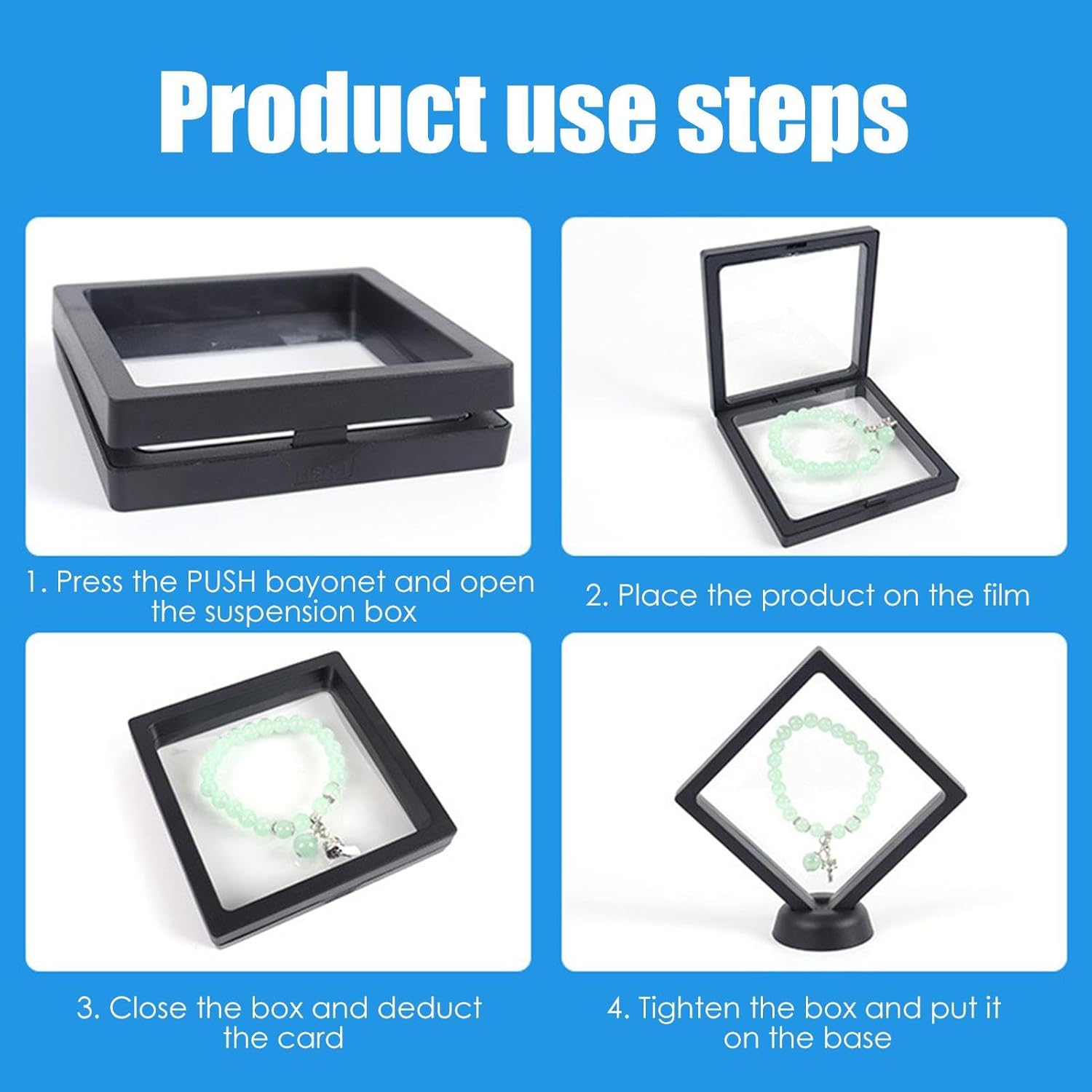 Alta trasparenza: il vantaggio del display con cornice è realizzato in materiale PP e pellicola flessibile in TPU, è leggero, molto forte, ha una buona elasticità e un'elevata trasparenza 3D fluttuante: il vantaggio del display a monete sospeso è che i vostri gioielli possono galleggiare tra due pellicole trasparenti flessibili, aggiungendo un effetto 3D. Sigillato per evitare ammaccature e graffi. Installazione rapida: la vetrina per monete non è solo facile da installare con il design della fibbia, ma apre anche la scatola portagioie, posiziona gli oggetti tra le parti trasparenti e regola la posizione, chiude la scatola e si blocca nel supporto del display. Forte protezione: la vetrina galleggiante 3D ha una forte chiusura che può proteggere i gioielli dai graffi dovuti allo stoccaggio all'aperto e dall'ossidazione causata dal contatto diretto con l'aria. Multiuso: il vantaggio di una cornice 3D sospesa è che è versatile e non solo adatto per anelli e bracciali, ma può anche essere utilizzato per esporre medaglie, monete, francobolli, gettoni e altri souvenir.