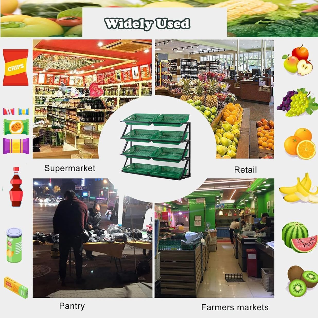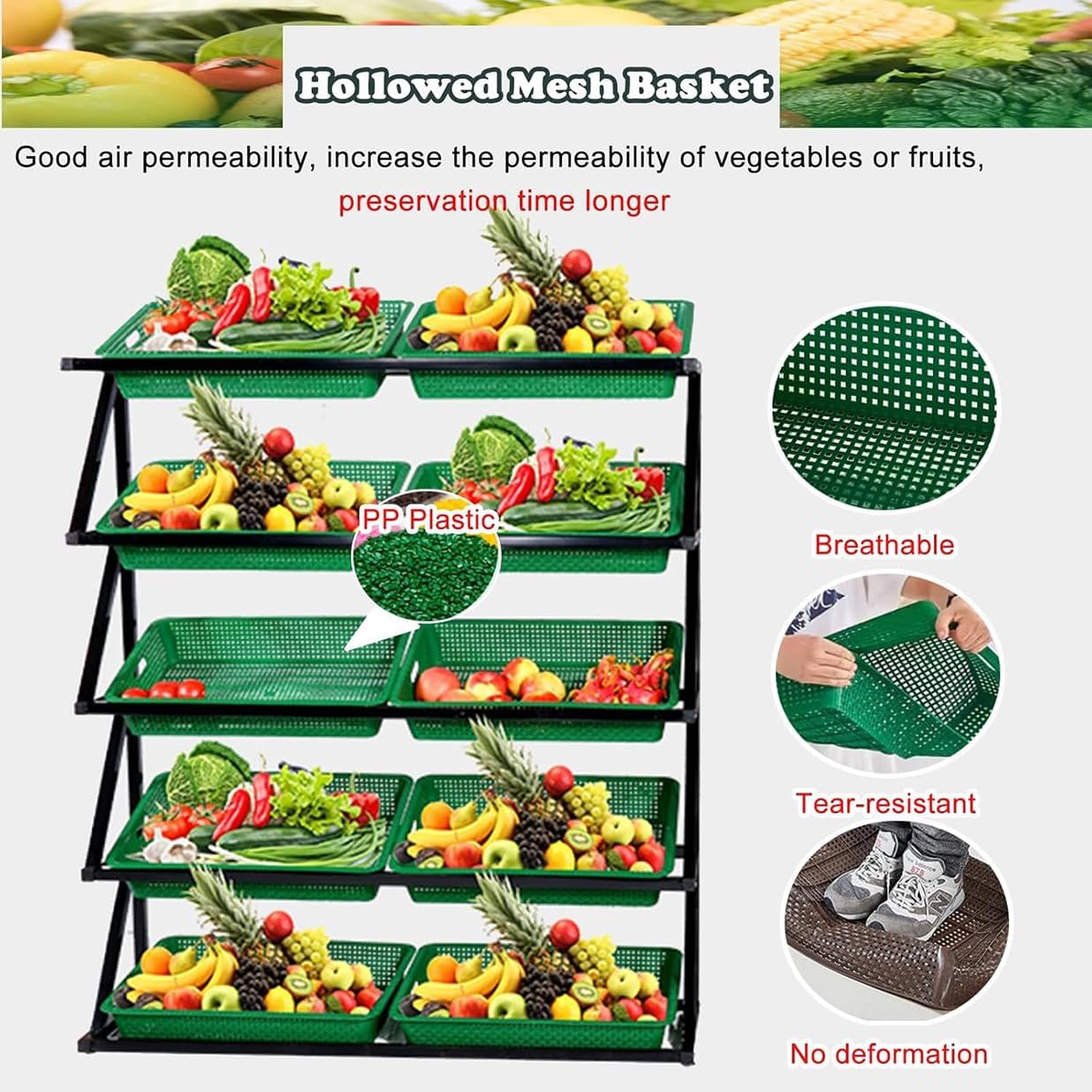 Base robusta: il nostro poggiapiedi dispone di una base robusta che impedisce lo scuotimento e supporta carichi pesanti senza danneggiare il pavimento. Ideale per accessori di mobili, garantisce stabilità e sicurezza in vari ambienti. Perfetta per uso domestico e ufficio, questa soluzione durevole è progettata per migliorare il tuo spazio fornendo un supporto affidabile per le tue esigenze. Installazione facile: lo scaffale di esposizione del supermercato può essere installato senza sforzo con gli accessori inclusi. Preparalo in pochi minuti per mostrare i tuoi snack e oggetti in modo efficace. Perfetto per migliorare la visibilità negli ambienti di vendita al dettaglio, questo versatile espositore è progettato per soddisfare tutte le vostre esigenze di merchandising. Grande capacità: il portafrutta supermercato dispone di guide laterali sicure, una parte anteriore bassa e uno schienale alto per un facile accesso. Offre spazio di archiviazione spazioso a più livelli organizzato e classificato in modo efficiente per un rapido recupero, mantenendo l'area in ordine. Perfetto per negozi di alimentari, cucine e supporti per frutta, questo rack migliora il display massimizzando lo spazio. Multi-Layer-Displaykorb: Dieser ausgewählte einteilige PP-Kunststoff besteht aus ausgewählten einteiligen PP-Kunststoff, der gegen Beschädigungen resistent ist. Es verfügt über eine tragende Kapazität von 18 kg/20 Pfund und kann eine Vielzahl von Snacks, Obst und Gemüse aufbewahren. Große Kapazität: Der Supermarkt -Obstregal verfügt über sicherere Schienen an den Seiten, eine niedrige Front und einen hohen Rücken, um einen einfachen Zugang zu erhalten. Es bietet geräumige, geschichtete Lagerung, effizient organisiert und kategorisiert für das einfache Abrufen und hält Ihre Region aufgeräumt.