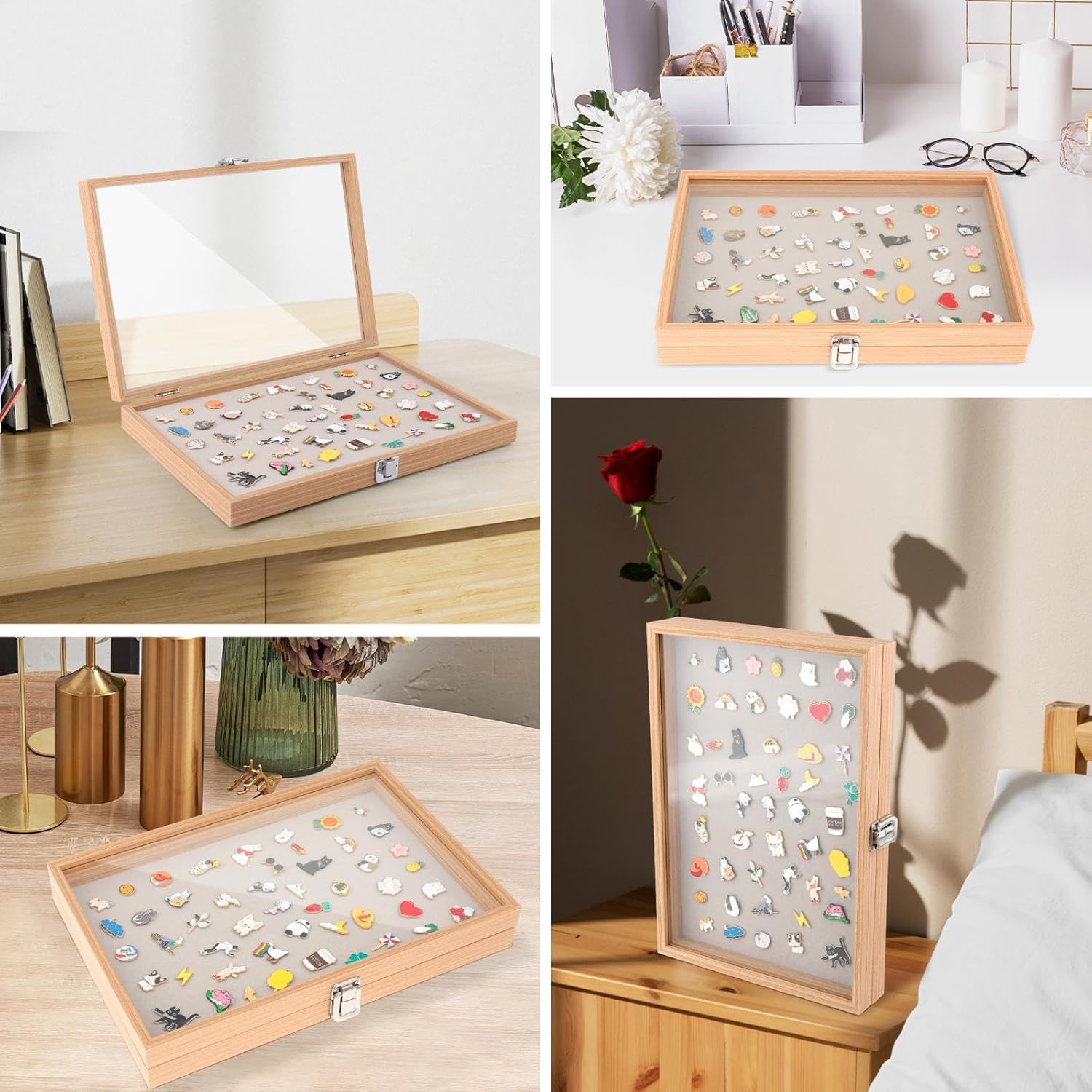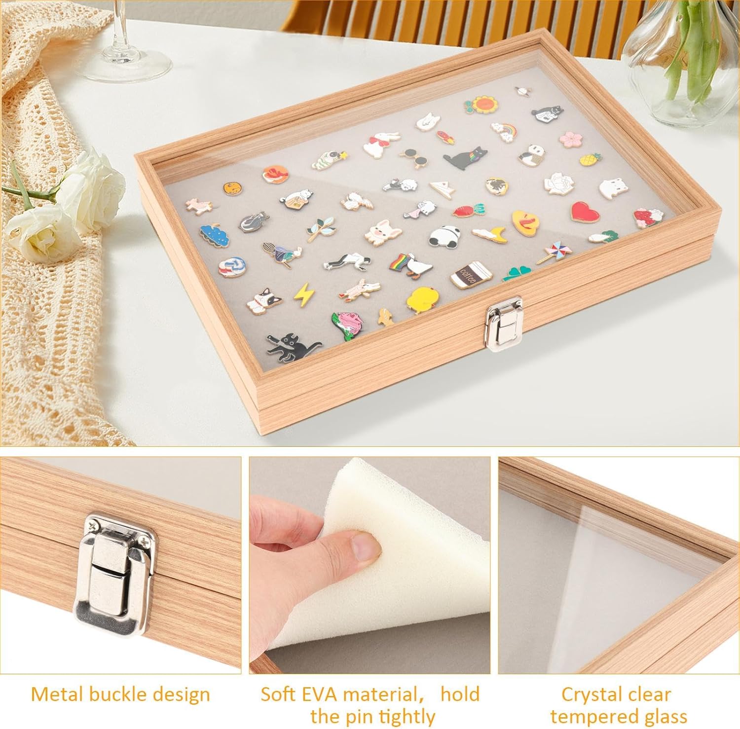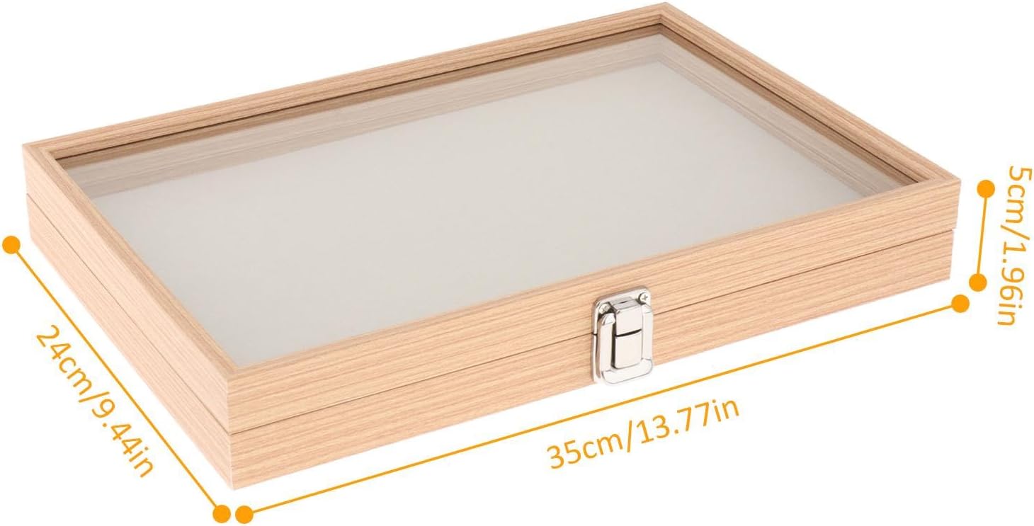 Dimensioni del prodotto: la vetrina per badge misura 35 x 24 x 5 cm, fornendo ampio spazio per riporre ed esporre la tua collezione di medaglie e distintivi. Antipolvere e durevole: il materiale in vetro non è solo antipolvere, ma anche resistente alle cadute, garantendo la sicurezza dei tuoi oggetti preziosi. Venature del legno: la vetrina è realizzata in legno di alta qualità, aggiungendo un tocco di eleganza e durata al design complessivo. Uso versatile: questa scatola è perfetta per riporre medaglie, distintivi, spille e altri piccoli oggetti, rendendola una scelta ideale per collezionisti e appassionati. Coperchio trasparente: questa scatola per medaglie è realizzata in legno, vetro e spugna, offrendo un'elevata trasparenza per mostrare chiaramente badge e medaglie.