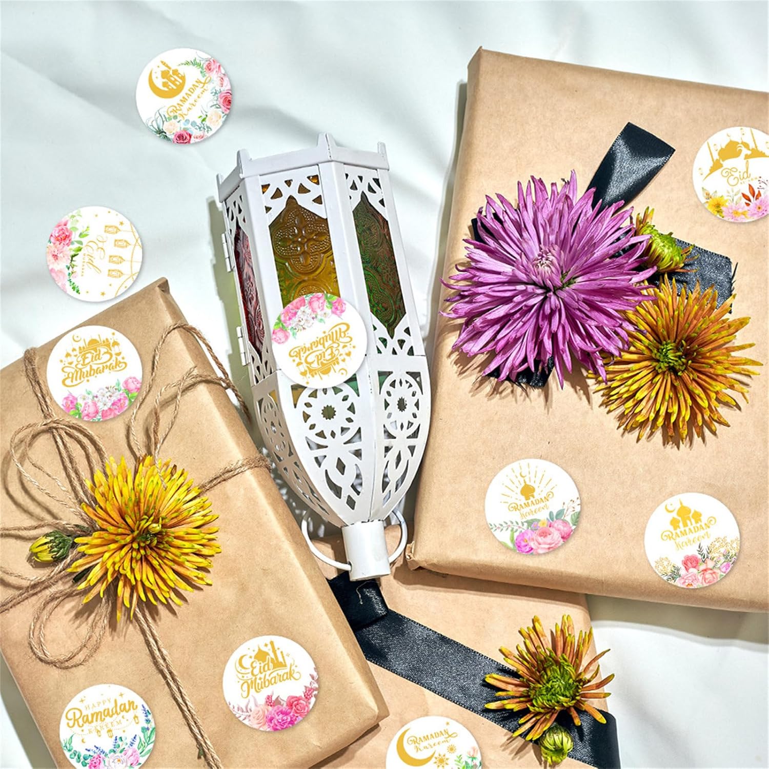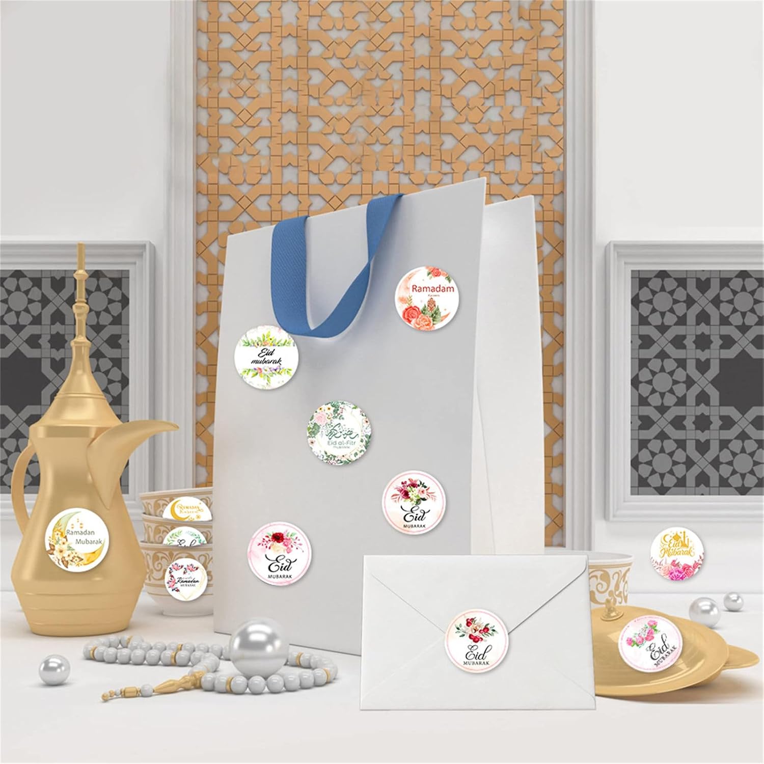 Usali per decorare scatole regalo, sacchetti di caramelle, buste sigillate, inviti a feste o come decorazioni per feste per aggiungere un tocco di eleganza e fascino al tuo incontro. Questi adesivi rotondi offrono opportunità di creatività, rendendoli un'aggiunta essenziale alla decorazione della tua festa e festival Eid. Festeggia il festival Eid con i nostri 90 adesivi festival Eid, perfetti per aggiungere un tocco festoso alla tua decorazione Eid. Questi adesivi di carta presentano disegni floreali e simboli tradizionali per garantire che siano adatti a varie decorazioni di festival. Molto adatte a bambini e adulti, queste etichette autoadesive rotonde sono perfette per valorizzare le tue forniture per feste Eid o creare buste uniche
