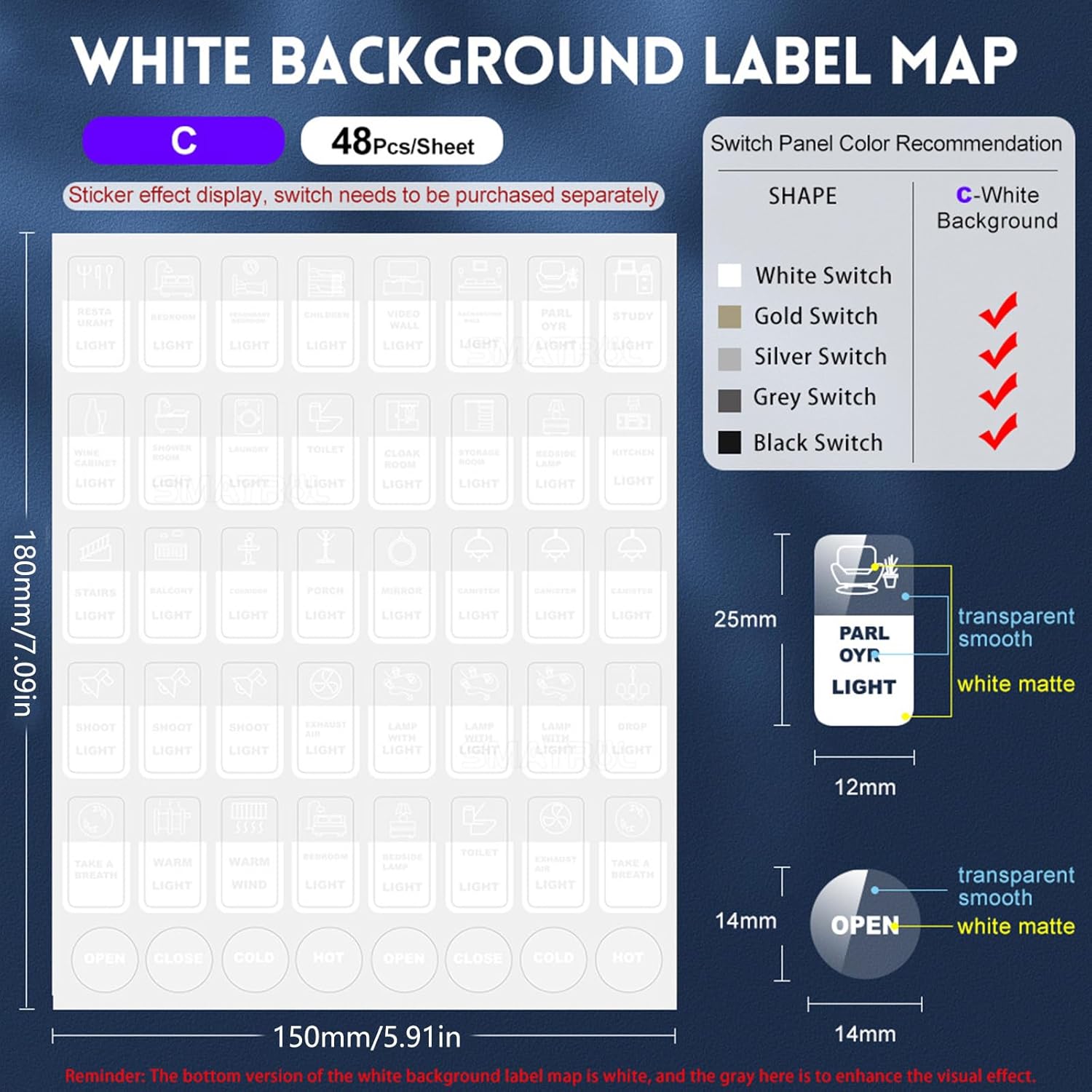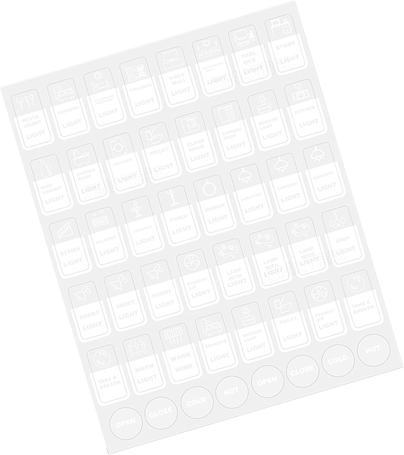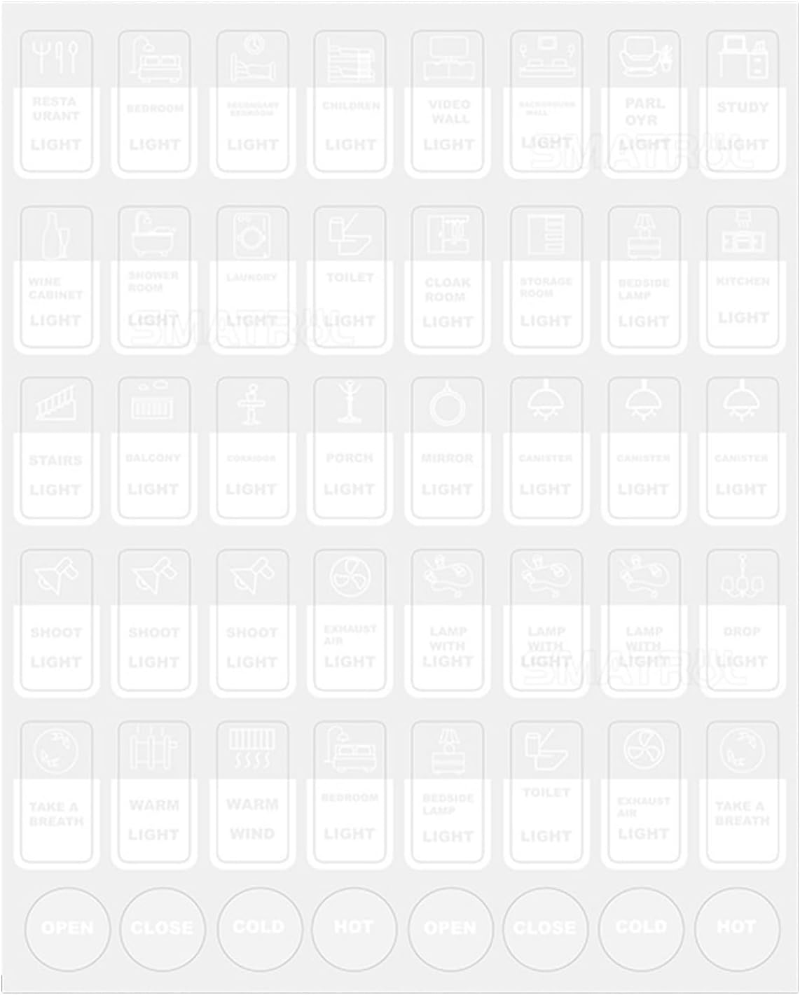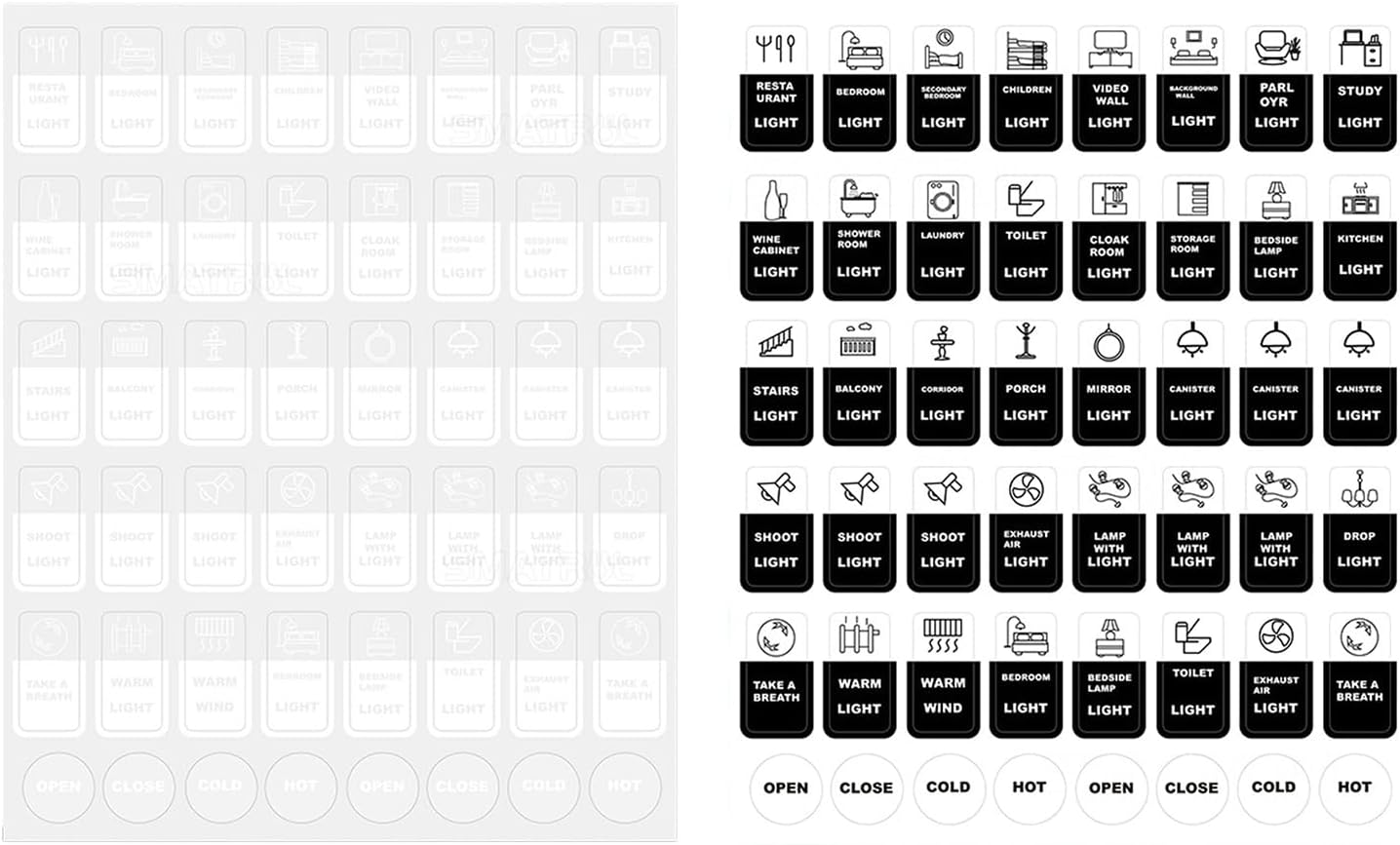 Migliora la funzionalità della tua casa con i nostri adesivi per interruttori touch, con etichette inglesi chiare per una facile identificazione e una maggiore comodità. Realizzato con materiali durevoli e resistenti alle intemperie. Questi adesivi sono dotati di un forte supporto autoadesivo che garantisce che rimangano saldamente in posizione ma possano essere rimossi senza lasciare residui. Etichetta gli elettrodomestici da cucina come cuociriso e forni a microonde, interruttori dell'illuminazione della camera da letto e controlli dell'acqua del bagno per garantirne una facile gestione. Anche in un ambiente umido, l'adesivo dell'interruttore è molto solido e non cade facilmente. Il quadrato è stato pretagliato, facile da staccare, e ha della colla sopra. 48 piccoli adesivi ciascuno, che coprono quasi l'80% degli elettrodomestici per il tempo libero che le persone utilizzano spesso, come interruttori, elettrodomestici e prese, per soddisfare le esigenze familiari.