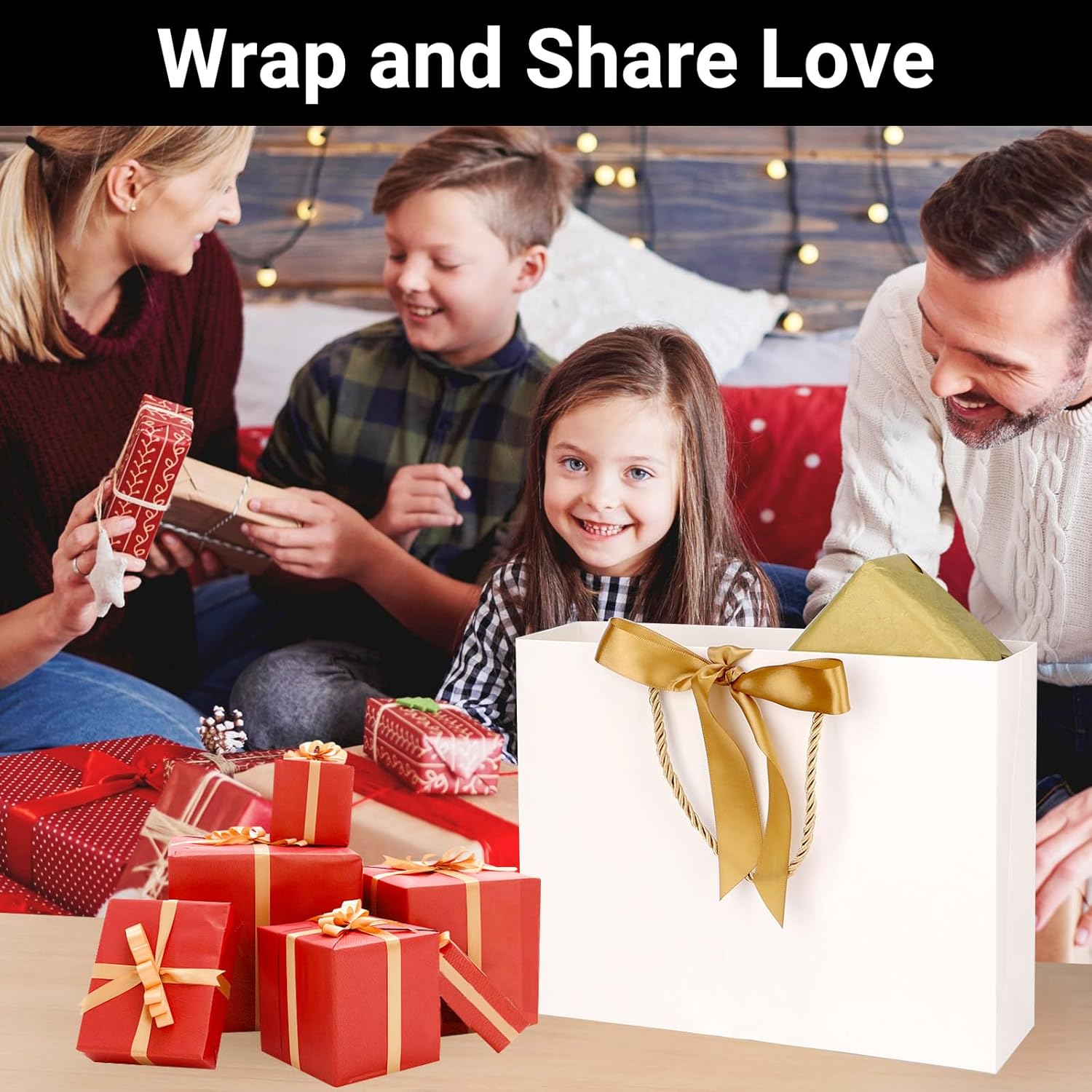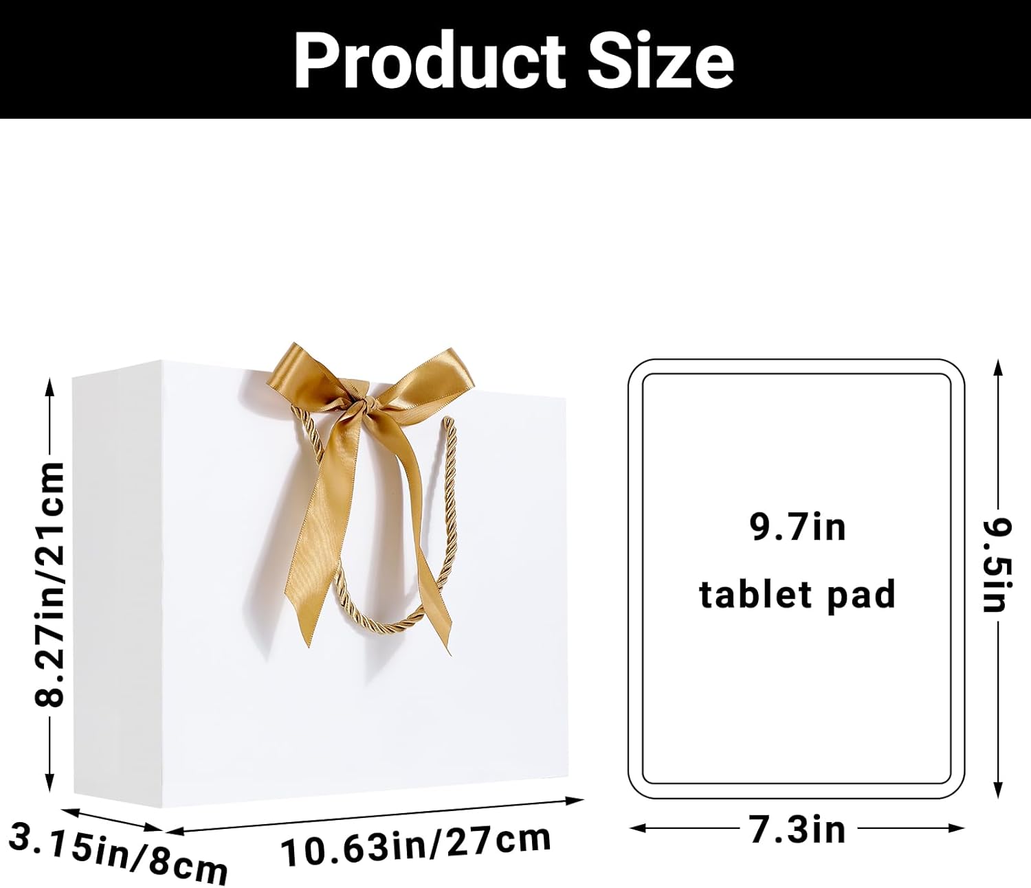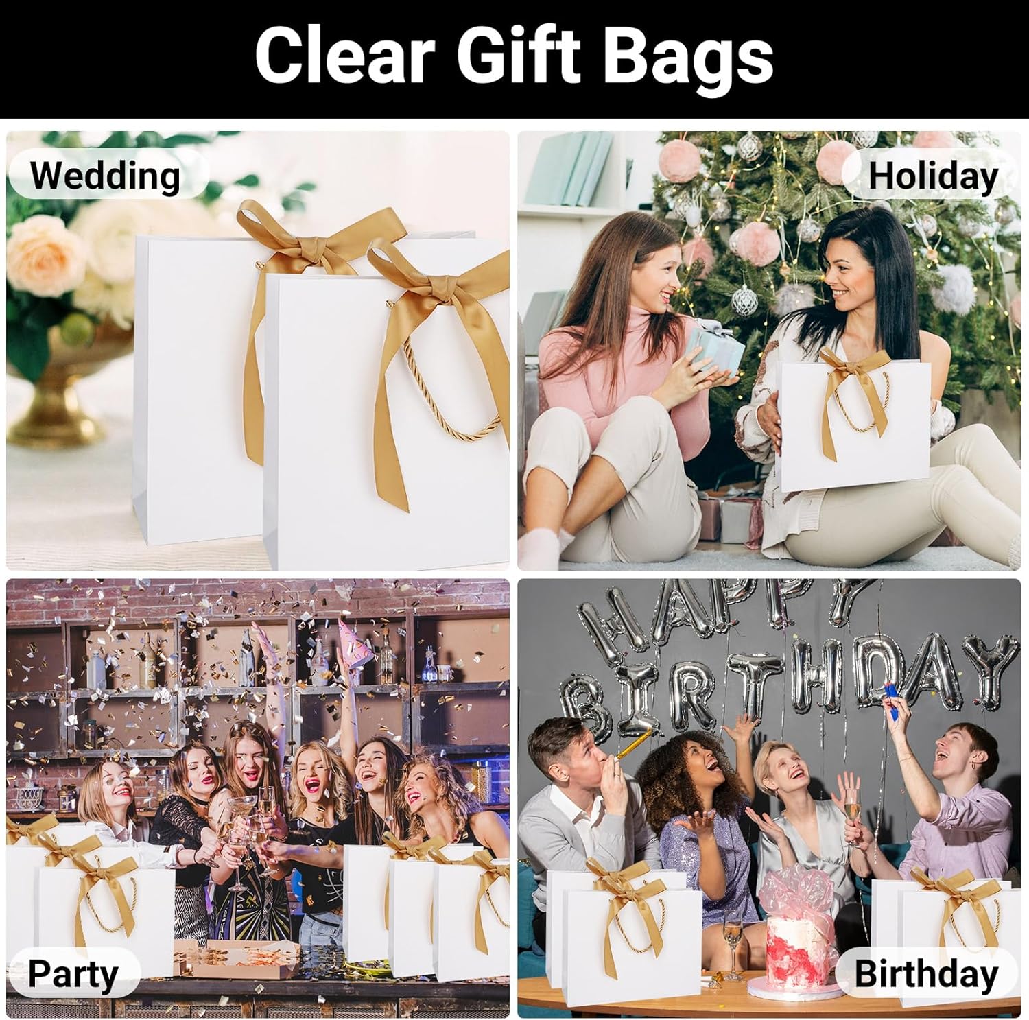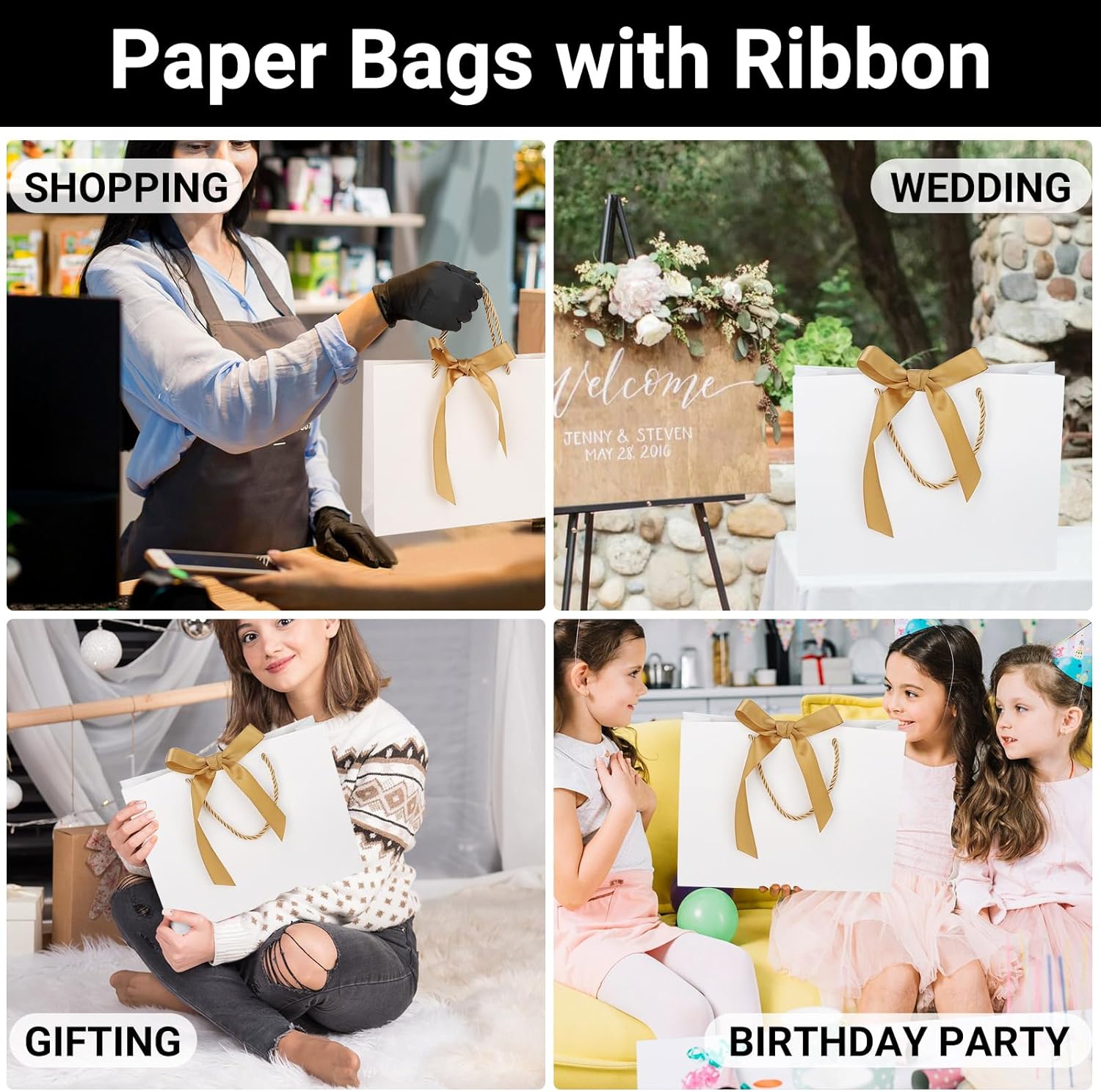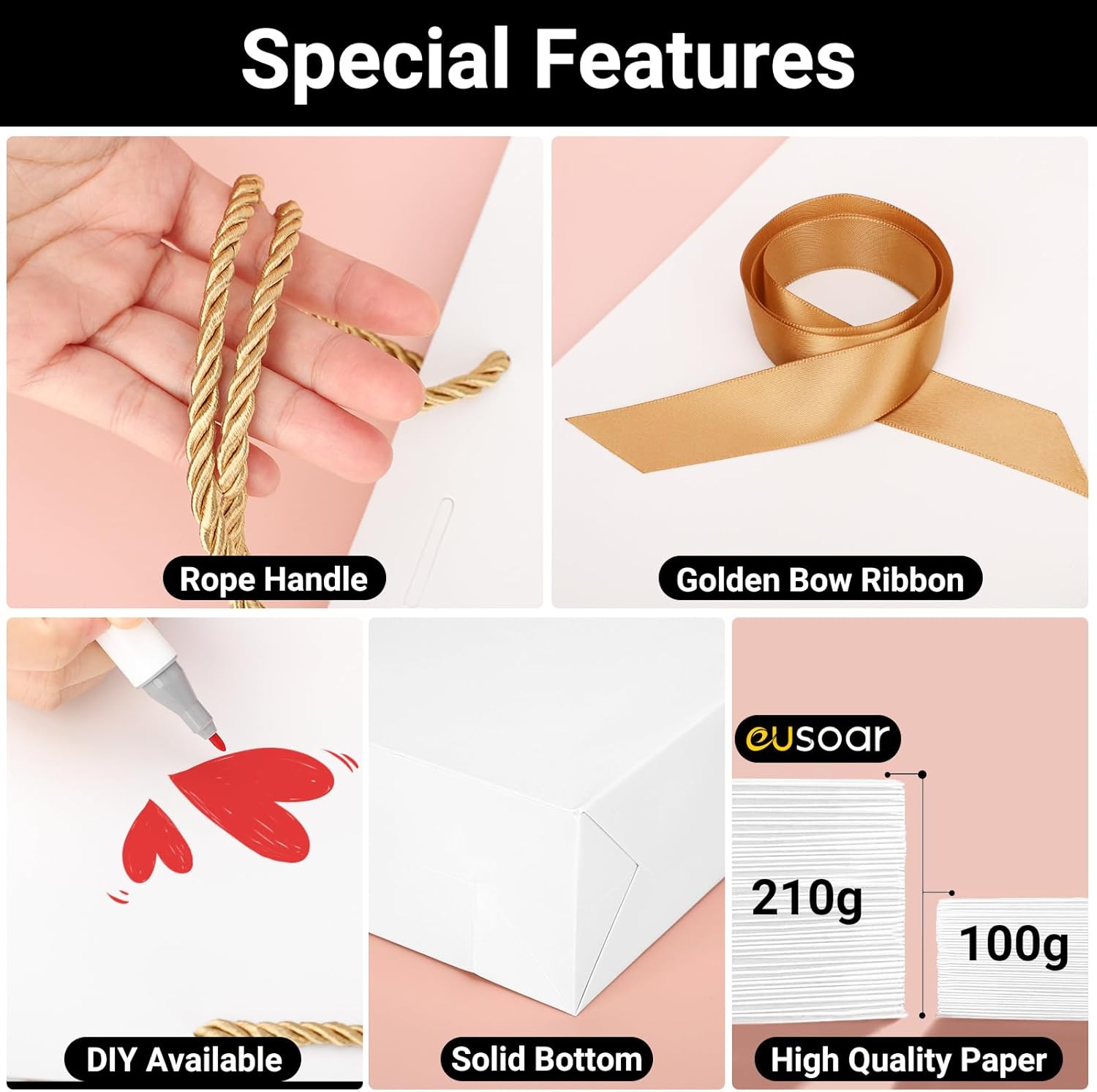 Sacchetti di carta robusti --- La confezione contiene 20 sacchetti regalo di carta da 27x8x21 cm. Realizzati con materiali di alta qualità, questi sacchetti regalo bianchi sono durevoli e resistenti agli strappi, garantendo una lunga durata. Carico pesante --- Questi sacchetti di carta da 210 g/m² sono in grado di contenere oggetti più pesanti o più oggetti, il che è l'ideale per presentare facilmente regali sostanziali. Sacchetti regalo speciali --- Ogni borsa viene fornita con un bellissimo fiocco dorato che aggiunge un tocco di eleganza ai tuoi regali ed è perfetto per fare bomboniere e regali. Fai da te possibile --- Queste borse possono essere personalizzate con disegni, adesivi, timbri e decorazioni uniche secondo i tuoi desideri. Versatilità --- Questi sacchetti regalo sono adatti per una varietà di occasioni e possono essere utilizzati per compleanni, matrimoni, anniversari, vacanze e molto altro.