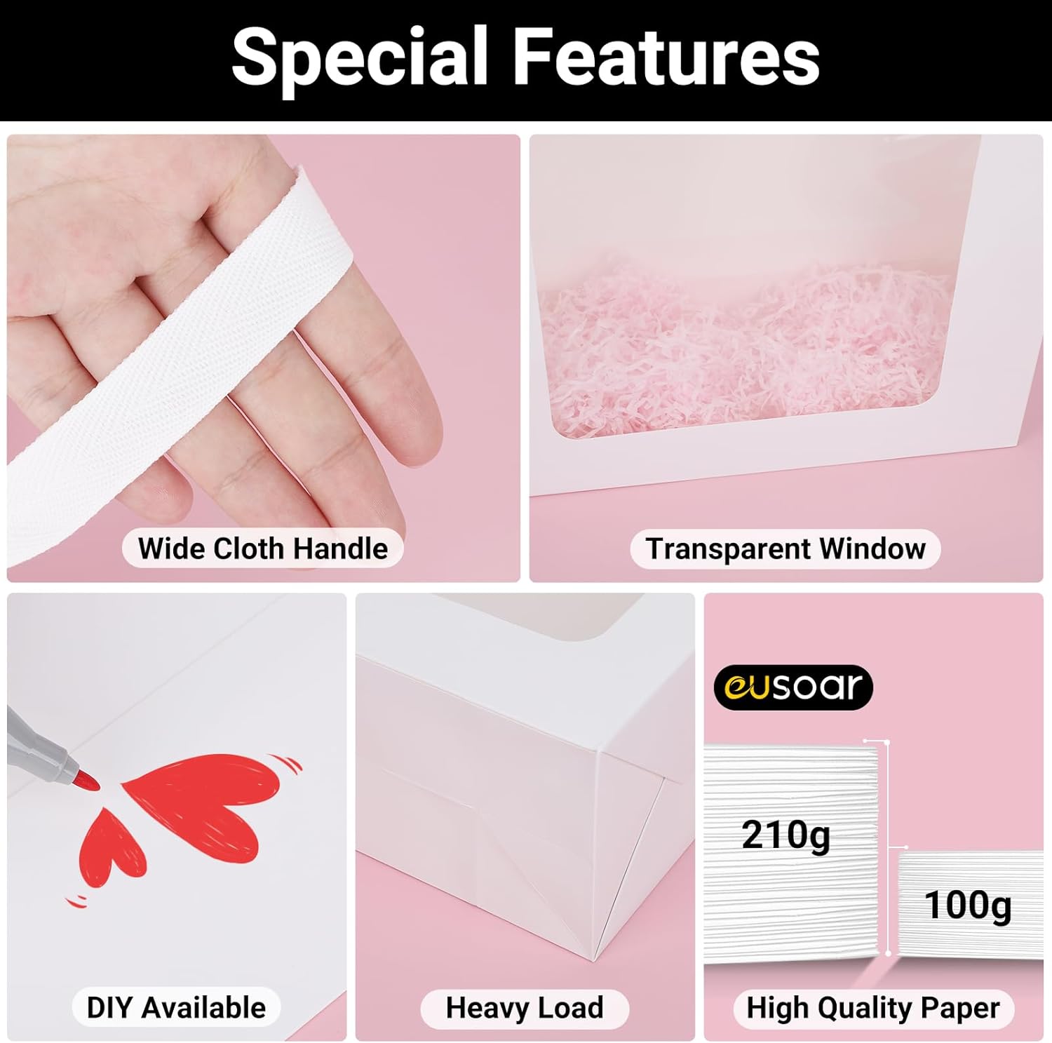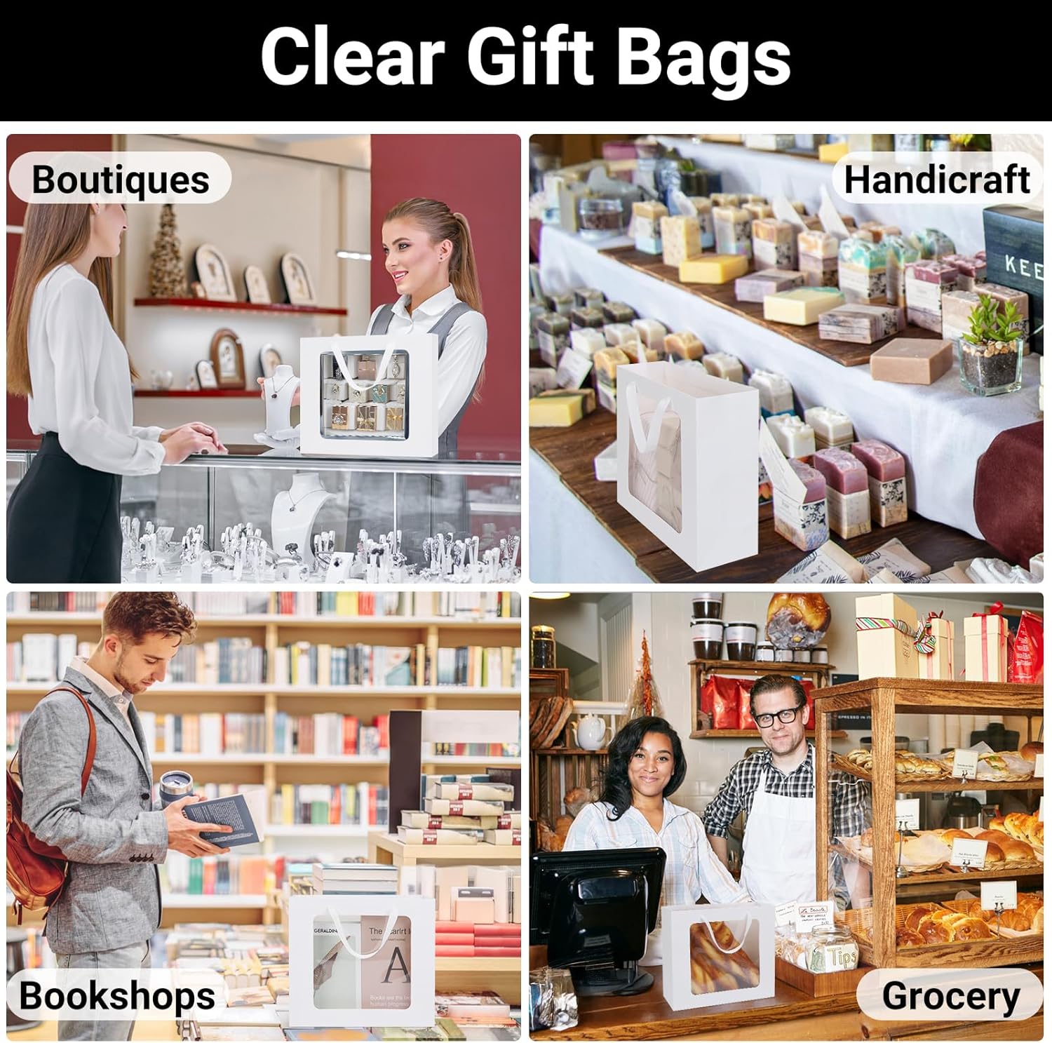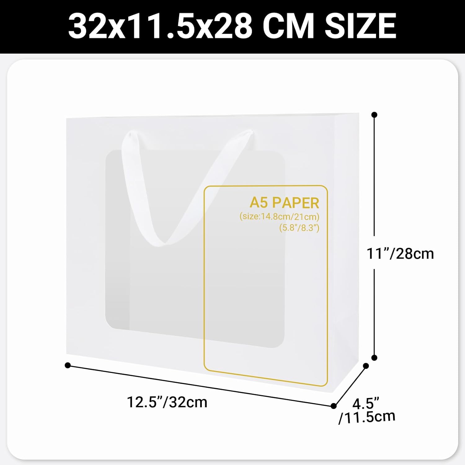 Sacchetti regalo con finestra --- La confezione contiene 10 sacchetti regalo in carta L 32x11,5x28 cm/12,5 x 4,5 x 11 pollici. Realizzati con materiali di prima qualità, questi sacchetti di carta bianca sono durevoli e resistenti agli strappi, garantendo una lunga durata. Resistente --- Questi sacchetti di carta da 210 g/m² sono realizzati con carta spessa di alta qualità in modo che possano sopportare carichi pesanti quando appesi o esposti. Ampie maniglie in tessuto --- Le robuste maniglie sono rinforzate per aumentare la resistenza e supportare carichi pesanti. Garantiscono una vestibilità comoda offrendo allo stesso tempo un tocco di eleganza. Finestra trasparente --- I sacchetti regalo con finestre trasparenti aumentano l'attrattiva visiva del regalo, rendendoli ideali per varie occasioni e migliorando l'esperienza di fare regali. Sacchetti regalo speciali --- Adatti a varie occasioni come compleanni, feste, matrimoni e altro, i nostri sacchetti regalo possono essere utilizzati anche per confezionare regali e bomboniere.