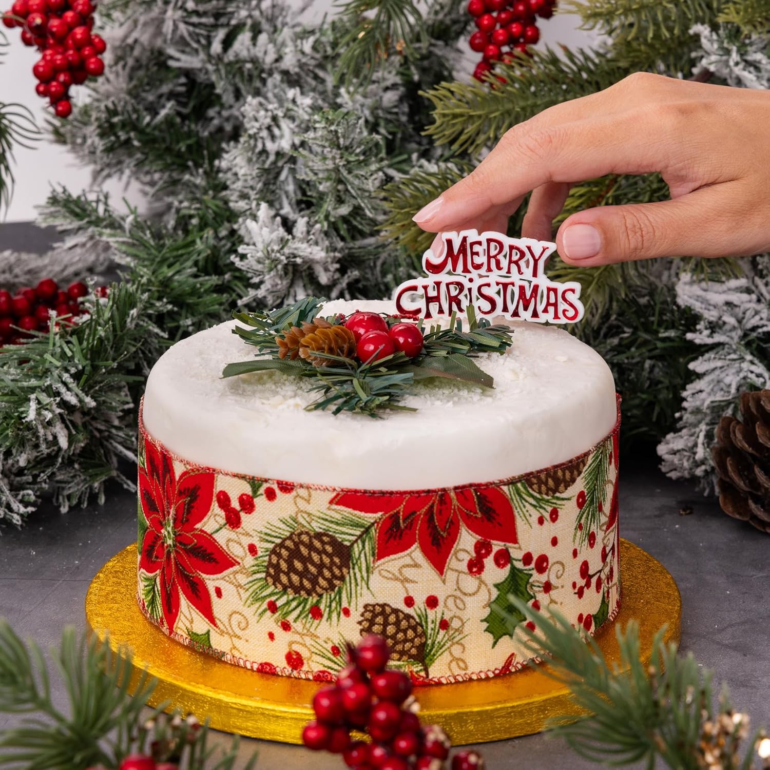 Contenuto della confezione: 1 cartello di Buon Natale e 1 fogliame di cono di abete e bacche Incluso anche un nastro con bordo in filo metallico da 90 cm L'articolo è riutilizzabile: puoi riutilizzarlo di nuovo Basta posizionarlo sopra per un aspetto istantaneo e professionale Rendi i tuoi dolci natalizi il fulcro della festa