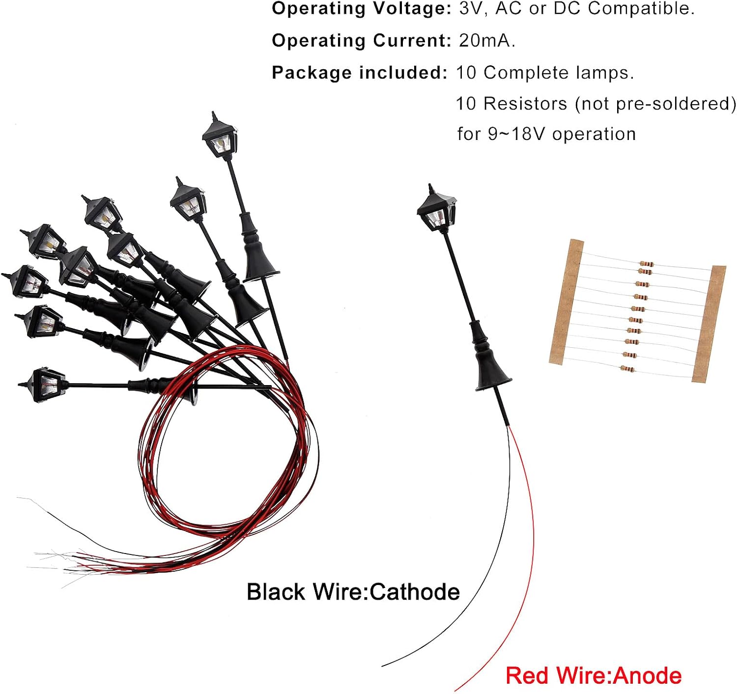 Contenuto della confezione: 10 lampade e 10 resistenze per il collegamento a 12-16 V. Scala: 1:87, adatto per pista H0. 3 V, 20 mA. Il prodotto è alimentato da batterie. Realizzato con LED.