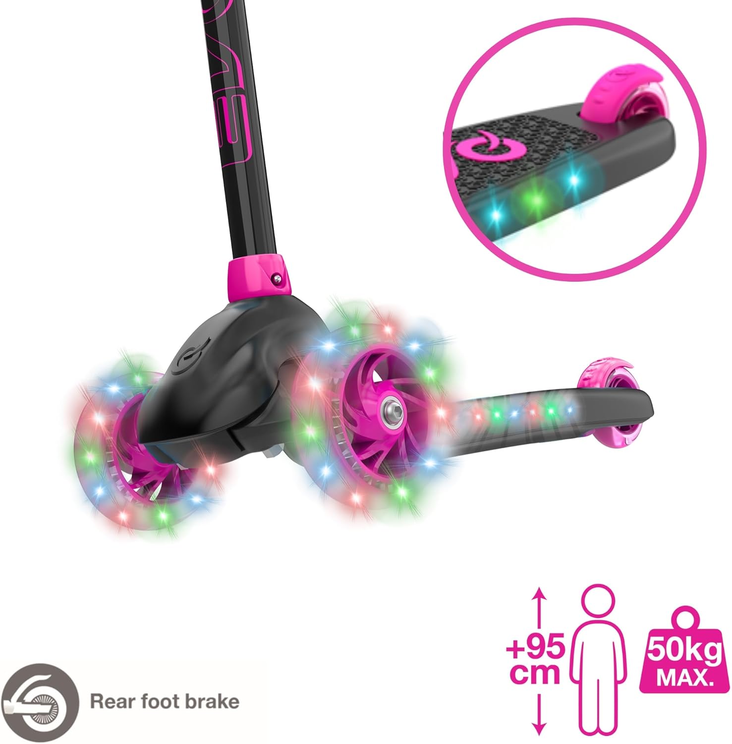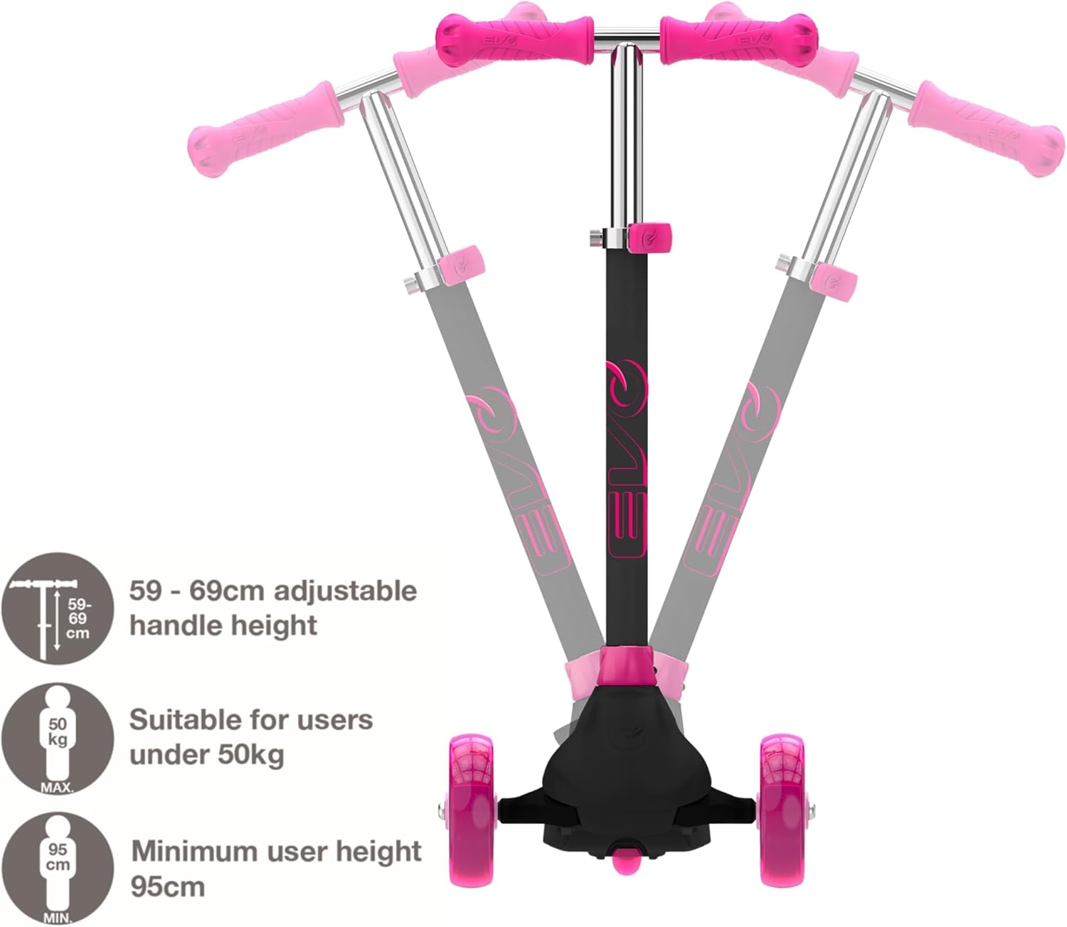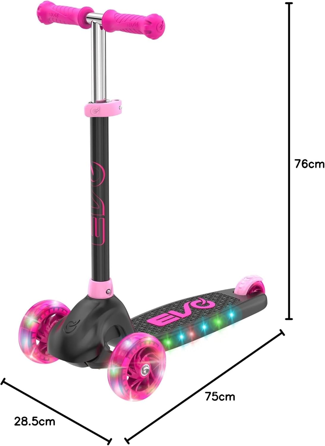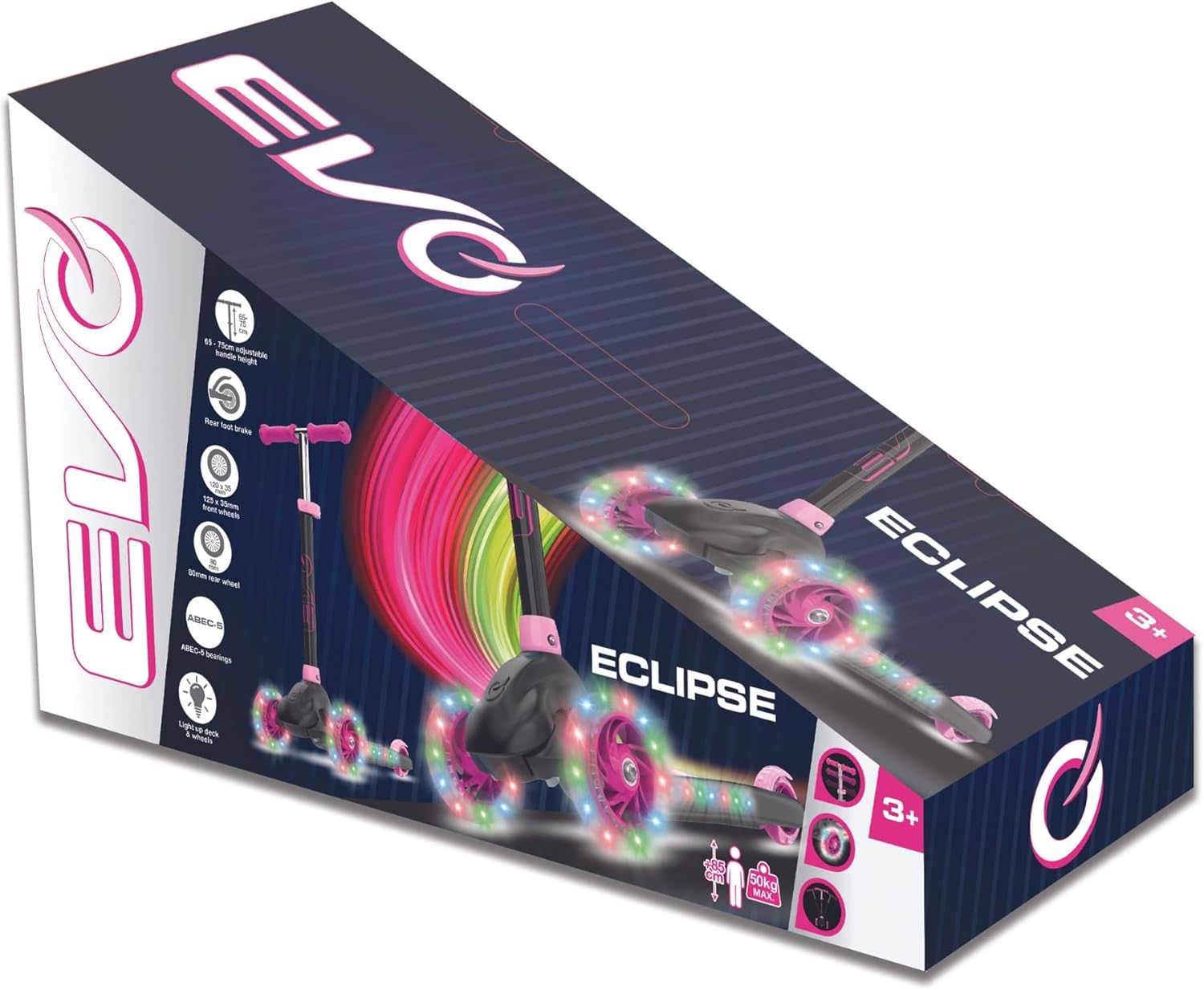EVO ECLIPSE LIGHT-UP TRI SCOOTER - L'ultimo scooter a 3 ruote per bambini dai 3 ai 12 anni Preparati a guidare con stile con il monopattino Evo Eclipse Light-Up Tri Scooter - un divertente, colorato e ad alte prestazioni scooter a 3 ruote costruito per bambini attivi, bambini, ragazzi e ragazze. Con le sue ruote luminose e il ponte, questo vibrante scooter a spinta catturerà l'immaginazione e scintilla l'avventura. Sia che il tuo bambino sia un principiante o un pilota esperto, lo scooter Eclipse lo aiuta a passare con sicurezza da un monopattino per bambini a un fantastico monopattino micro-stile. Progettato per crescere con il tuo bambino, questo monopattino è adatto per bambini dai 3 ai 12 anni e supporta piloti fino a 50 kg. Ideale per sviluppare le capacità motorie, l'equilibrio e la coordinazione, è il giocattolo cavalcabile perfetto per portare il bambino all'aperto e fuori dagli schermi. Caratteristiche e vantaggi: design luminoso a 3 ruote: due ruote anteriori a LED da 125 mm e una ruota posteriore da 100 mm con cuscinetti ABEC-5 per una guida fluida e luminosa. Deck illuminato: aggiunge un ulteriore livello di eccitazione a ogni scooter. Sistema inclinabile per sterzare: incoraggia l'equilibrio e la coordinazione con un manubrio inclinabile facile. Altezza del manubrio regolabile: da 66 cm a 76 cm per crescere con il tuo bambino. Impugnature in PVC: antiscivolo e comode per mani piccole. Freno posteriore: freno a pedale facile per arresto sicuro e controllato. Pieghevole e portatile: dispone di un manubrio rimovibile per piegare, riporre e trasportare. Realizzato per il comfort, il controllo e la durata, lo scooter Eclipse è un'ottima scelta per giochi all'aperto, passeggiate nel parco e avventure quotidiane. Regalo ideale per ragazzi e ragazze. Cerchi il regalo perfetto di compleanno, regalo di Natale o un regalo semplicemente perché? Lo scooter Evo Eclipse Light-Up è una scelta brillante per i bambini amanti dello scooter. Con il suo design fresco, ruote luminose e telaio leggero, questo monopattino da bambino a bambino è ideale sia per il divertimento che per lo sviluppo. Ideale per incoraggiare l'esercizio fisico, l'indipendenza e l'apprendimento in stile bici per i bambini più piccoli. Perfetto per ogni piccolo che sogna uno scooter con unicorno, un dinosauro cavalcabile o anche uno scooter a tema sirena! Specifiche del prodotto: 1 maniglia per monopattino Evo Eclipse Light-Up a tre ruote. Altezza: regolabile da 66 cm a 76 cm. Peso massimo del pilota: 50 kg. Cuscinetti: ABEC-5. Manubrio rimovibile per riporlo in modo compatto e da viaggio. Dimensioni del prodotto: 75 cm x 28,5 cm x 56 cm (altezza x larghezza x profondità). Adatto per bambini dai 3 anni in su, compresi bambini piccoli, bambini in età prescolare e primi adolescenti ESPLORA LA GAMMA Evo BY HTI Unisciti all'avventura con l'intera gamma Evo - una gamma di monopattini, skateboard, cavalcabili e molto altro ancora! Dai micro scooter agli scooter acrobatici, agli scooter elettrici (escooter), agli scooter pieghevoli, agli hoverboard e persino ai tricicli gemelli, c'è qualcosa per ogni ciclista. Sia che il tuo bambino ami i camion dei pompieri, le auto della polizia, gli unicorni o i passeggini, la gamma Evo ha il miglior giocattolo all'aperto per ispirare la loro prossima avventura. Costruito per bambini dai 2 anni in su, Evo offre scooter leggeri, durevoli e ricchi di funzionalità di cui i genitori si fidano e che i bambini amano.
