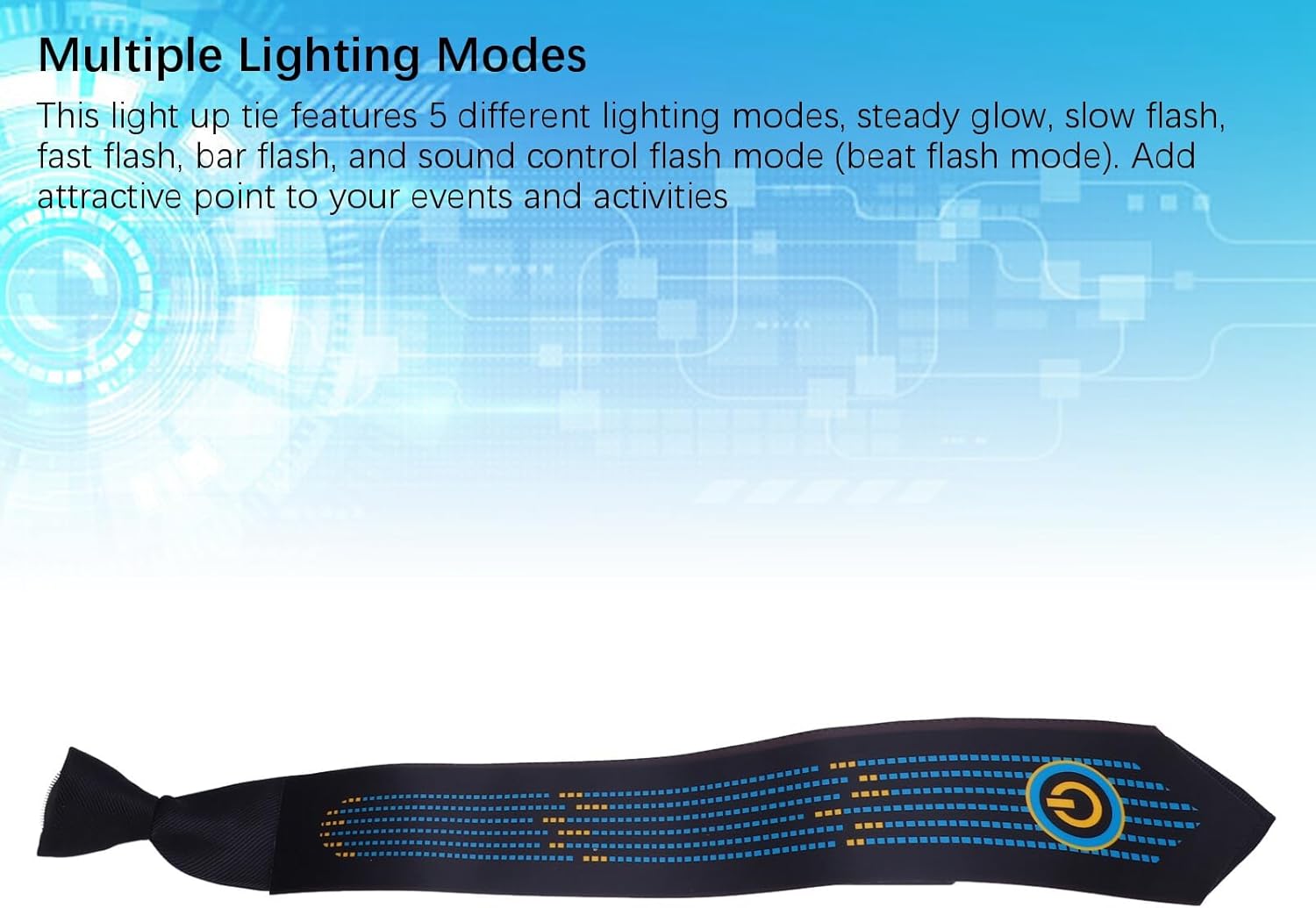 [illumina la notte] illumina il tuo look con questa cravatta a LED attivata dalla voce, per feste, concerti ed eventi speciali. Sincronizzando con la tua voce, crea uno spettacolo di luci abbagliante. [Party Game Changer] Distinguere in qualsiasi raduno con questa cravatta luminosa che aggiunge talento e divertimento. Adatto per feste, matrimoni o notti casuali fuori, sarai al centro dell'attenzione. [illuminazione versatile] con 5 modalità di illuminazione tra cui bagliore costante, flash lento, flash veloce, flash a barre e flash battito, questa cravatta eleva il tuo stile e aggiunge un punto attraente ai tuoi eventi. [ampia applicazione] idone per l'interno o per spettacoli outdoor, questi cravatte a LED sono i conti, i passi diventi per i feste. Fai una dichiarazione in occasioni speciali con questo accessorio luminoso. [Easy Regolament] con un controller on/off e regolazione della sensibilità, questa cravatta è facile indossare e si adatta a diversi stili musicali. Adatto a tutti, è l'accessorio per qualsiasi evento. Spec: Tipo di oggetto: LID LIGHT UP TIE Batteria: 2 Batteria alcali AAA AAA (non inclusa) 5 modalità di illuminazione: luce costante, flash lento, flash veloce, flash a barra e modalità flash attivata (modalità flash battito). La modalità BEAT Flash è attivata dal suono, creando una modalità lampeggiante unica che risponde al volume ambientale circostante Elenco dei pacchetti : 1 x Light up tie Nota : Misura manuale, dimensioni 1-3cm.