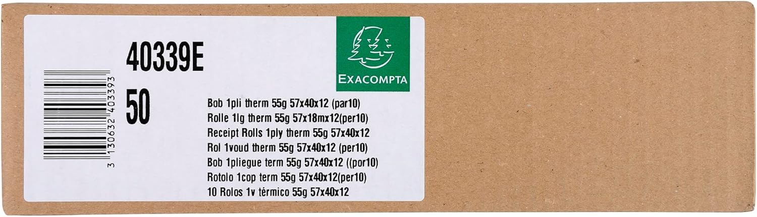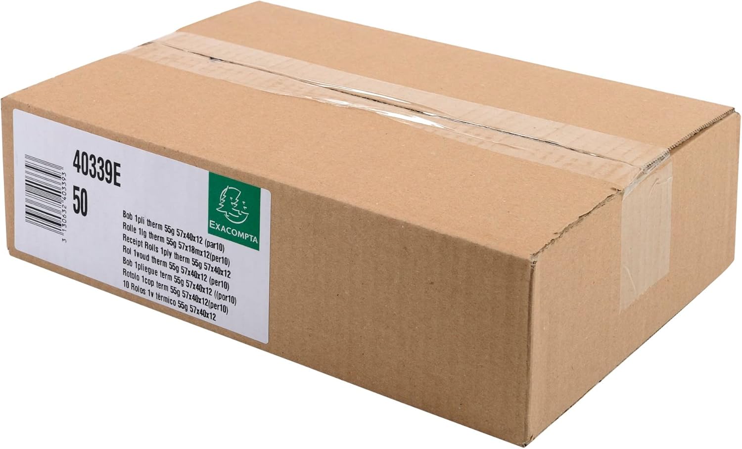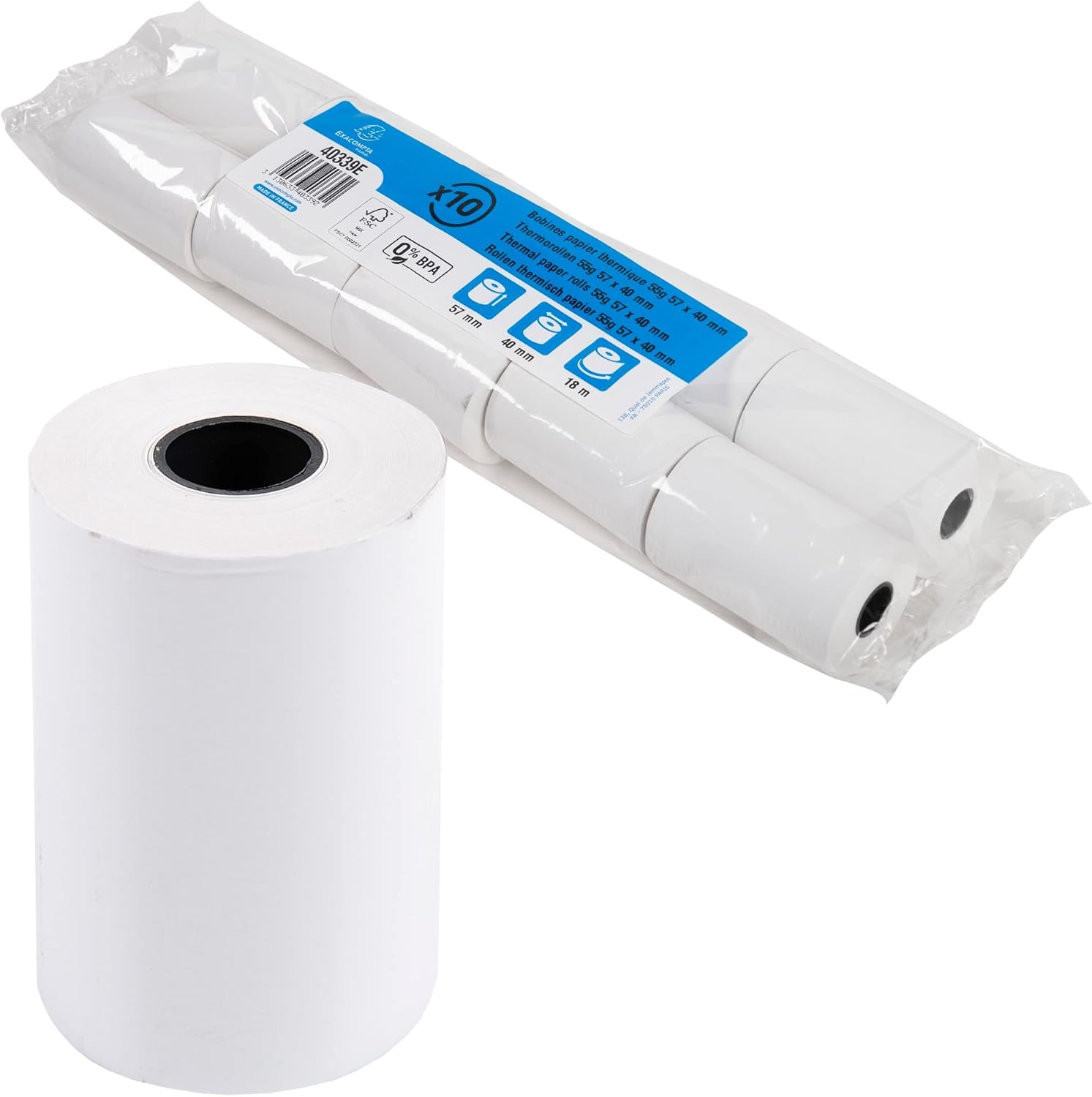 Formato bobina: 57 mm di larghezza (larghezza) e 40 mm di diametro. Lunghezza (+ o - 2 m): 18 m, mandrino standard da 12 mm Carta garantita senza Bisfenolo A, quindi conforme alle normative europee che vietano le carte termiche con BPA dal 1 gennaio 2020 Carta ad alta sensibilità che garantisce una buona leggibilità di stampa. Avviso di fine rollio. Scatola da 50 bobine, avvolto da 10. Certificato FSC
