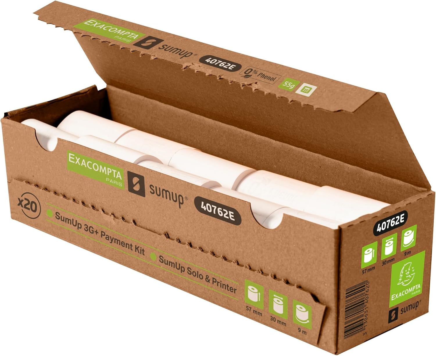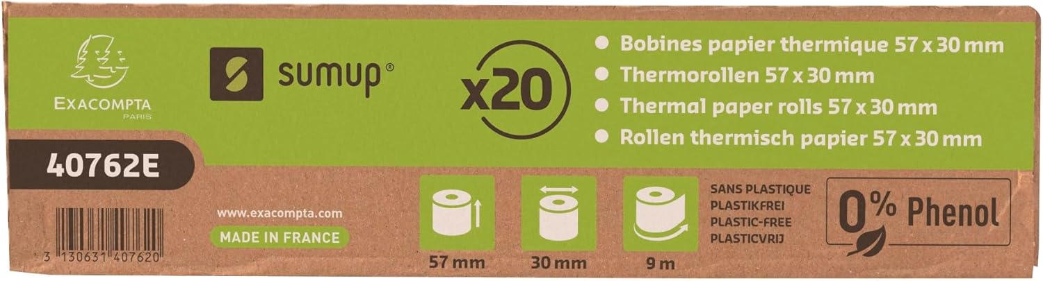 1 copia carta termica 55 g/mq : Larghezza 57mm - Diametro 30mm. Metratura (+/- 2mt) : 9 mt. Senza anima, zero plastica Compatibile con stampante SumUp (SumUp 3G+ Payment Kit / SumUp Solo & stampante). Non viene utilizzata plastica ne per l'anima ne per l'imballo per ridurre al massimo i rifiuti mantenendo la stessa efficienza Carta garantita senza fenolo, cioè priva di Bisfenolo A e S, in conformità con le normative europee di Gennaio 2020. Le diciture 0% fenolo, FSC, Exacompta e SumUp sono stampati sul retro della carta Carta di qualità resistente e di lunga durata, garantendo una stampa nitida. Avviso di fine rotolo. Prodotto in Francia. Scatola cartone da 20 rotoli