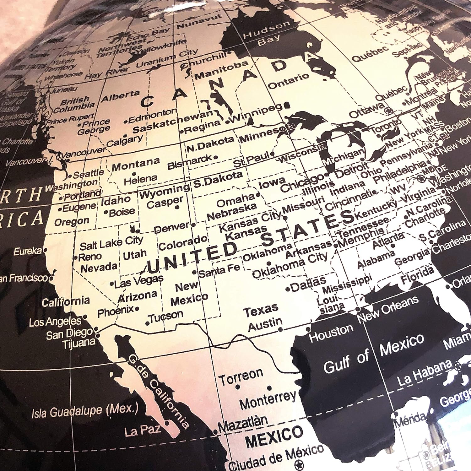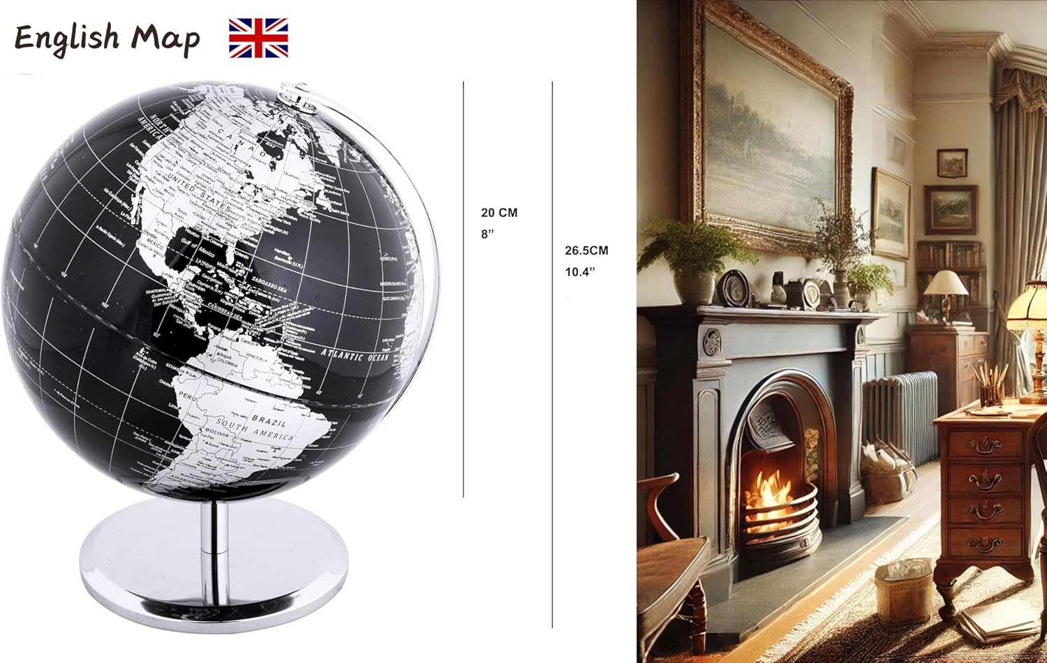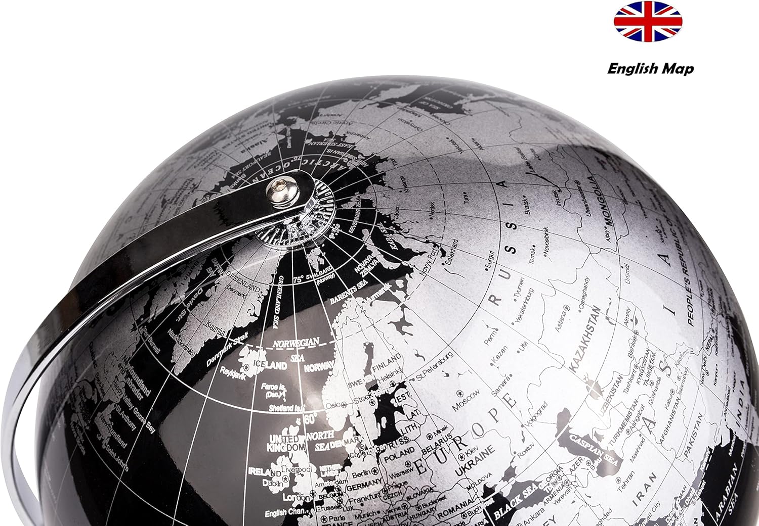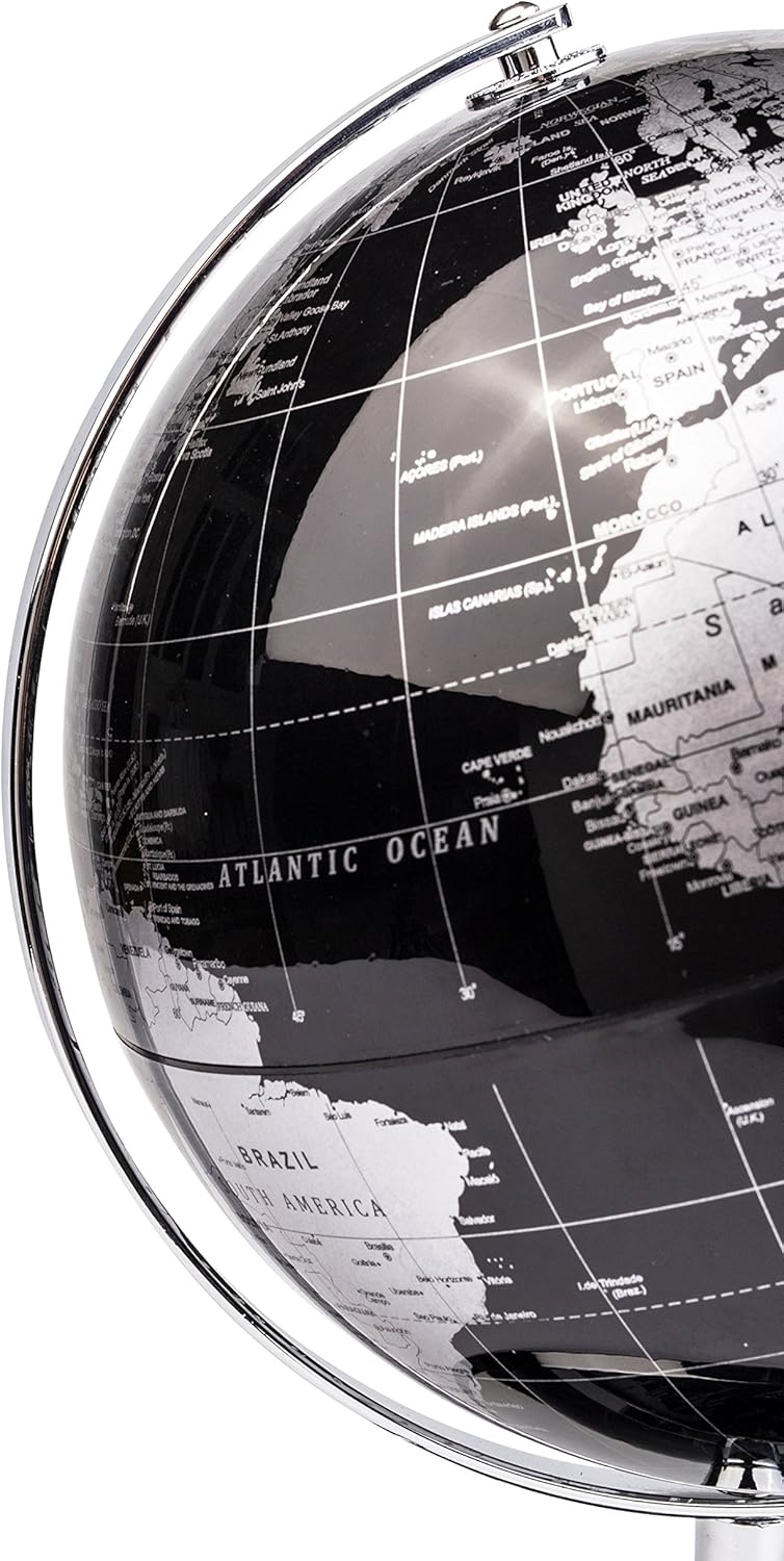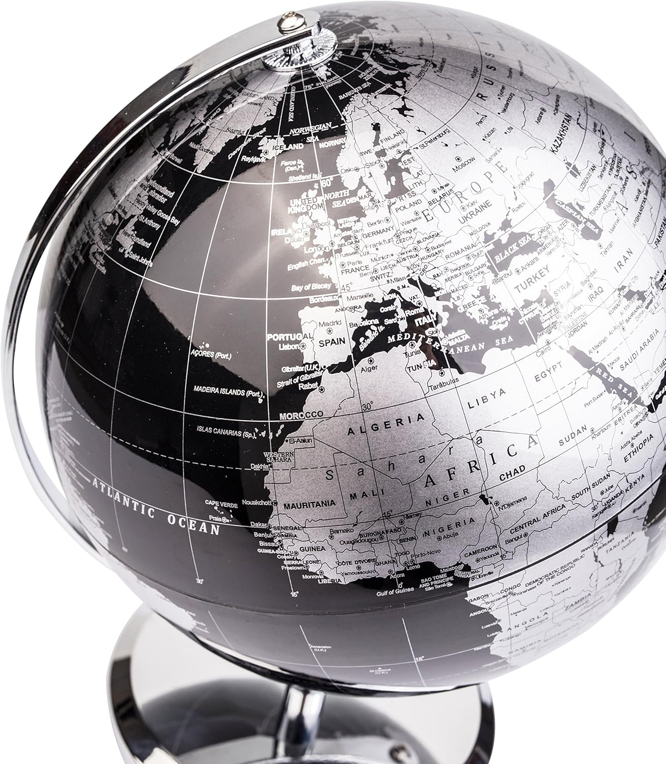 Exerz Globo metallico in nero e argento (20 cm di diametro), altezza Incluso Stand: 25,5 cm / 10 pollici, ruota su un supporto metallico stabile; Facile da leggere la sfera geografica, il Globe mostra nomi di paesi, confini politici, capitali, grandi città e altro; Divertente ed educativo: incoraggiare i bambini curiosi ad esplorare il mondo della scienza; regalo perfetto ed ideale per la decorazione domestica e dell'ufficio; Non adatto per bambini sotto i 3 anni; La mappa è in inglese, non italiano.