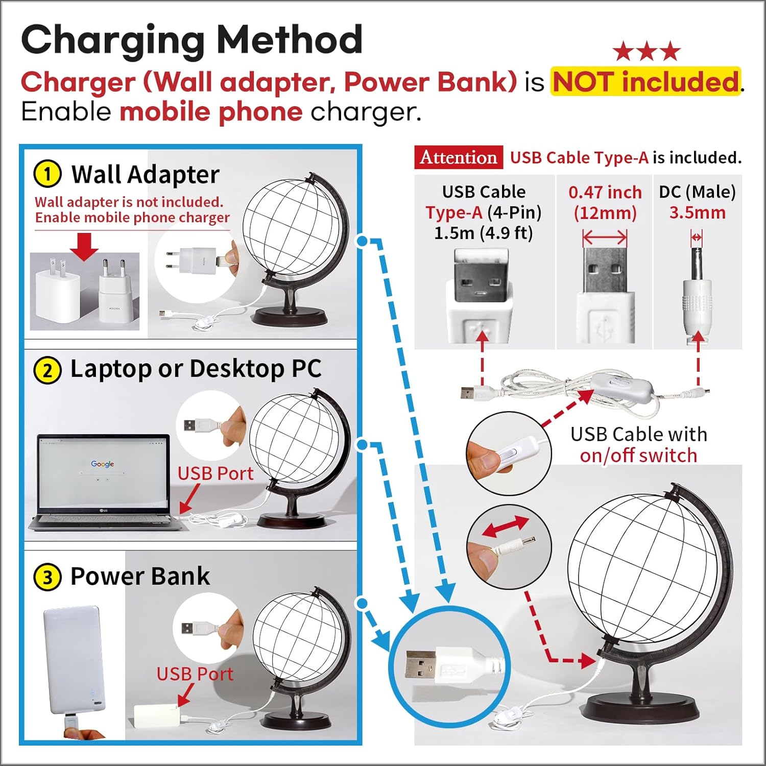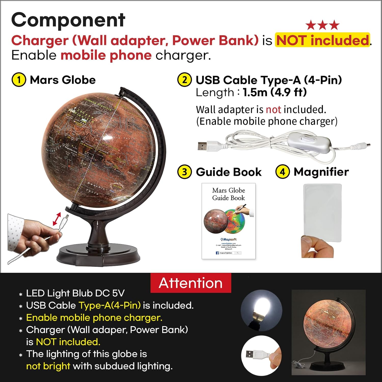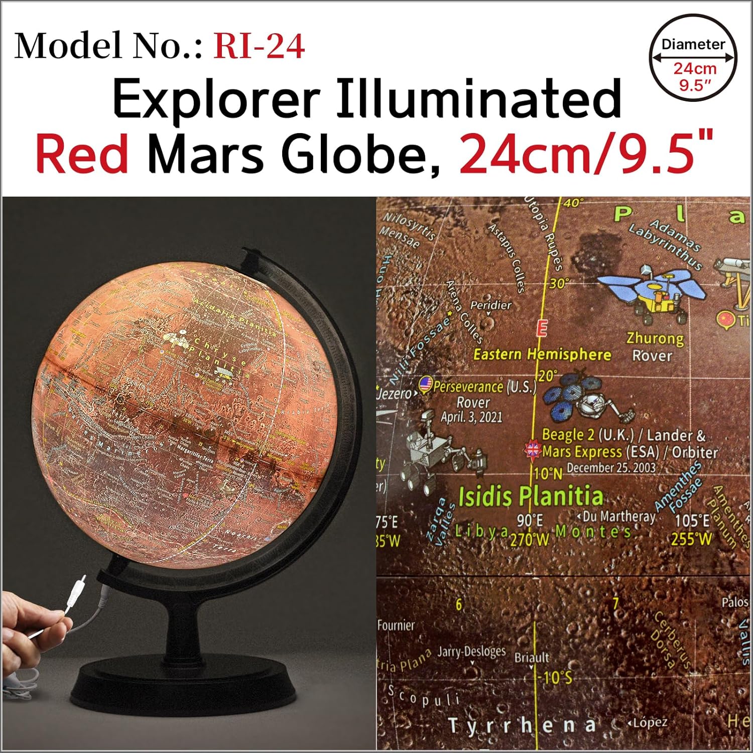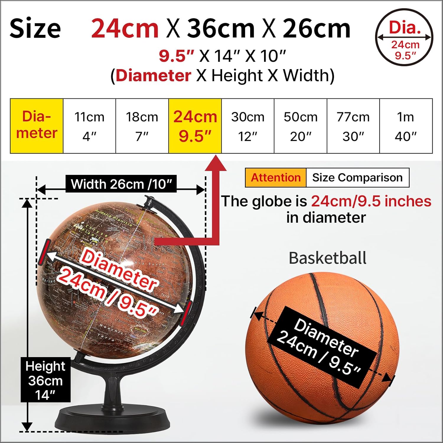 Diametro Del Globo : 24cm/24.9cm Dimensioni dell'articolo: 24 cm x 36 cm x 26 cm (diametro x altezza x larghezza) Illuminato: Sì (LED Light Blub DC 5V, cavo USB Type-A (4-Pin) è incluso.) Attenzione! : Caricatore (adattatore a parete) non è incluso. Abilita caricabatterie per cellulare. L'illuminazione di questo globo non è luminosa con illuminazione soffusa. Consigliato a studenti, professori, astronomi e scienziati. Materiale di base: Plastica Marrone Scuro (ABS) & Tecnica: Vacuum formato