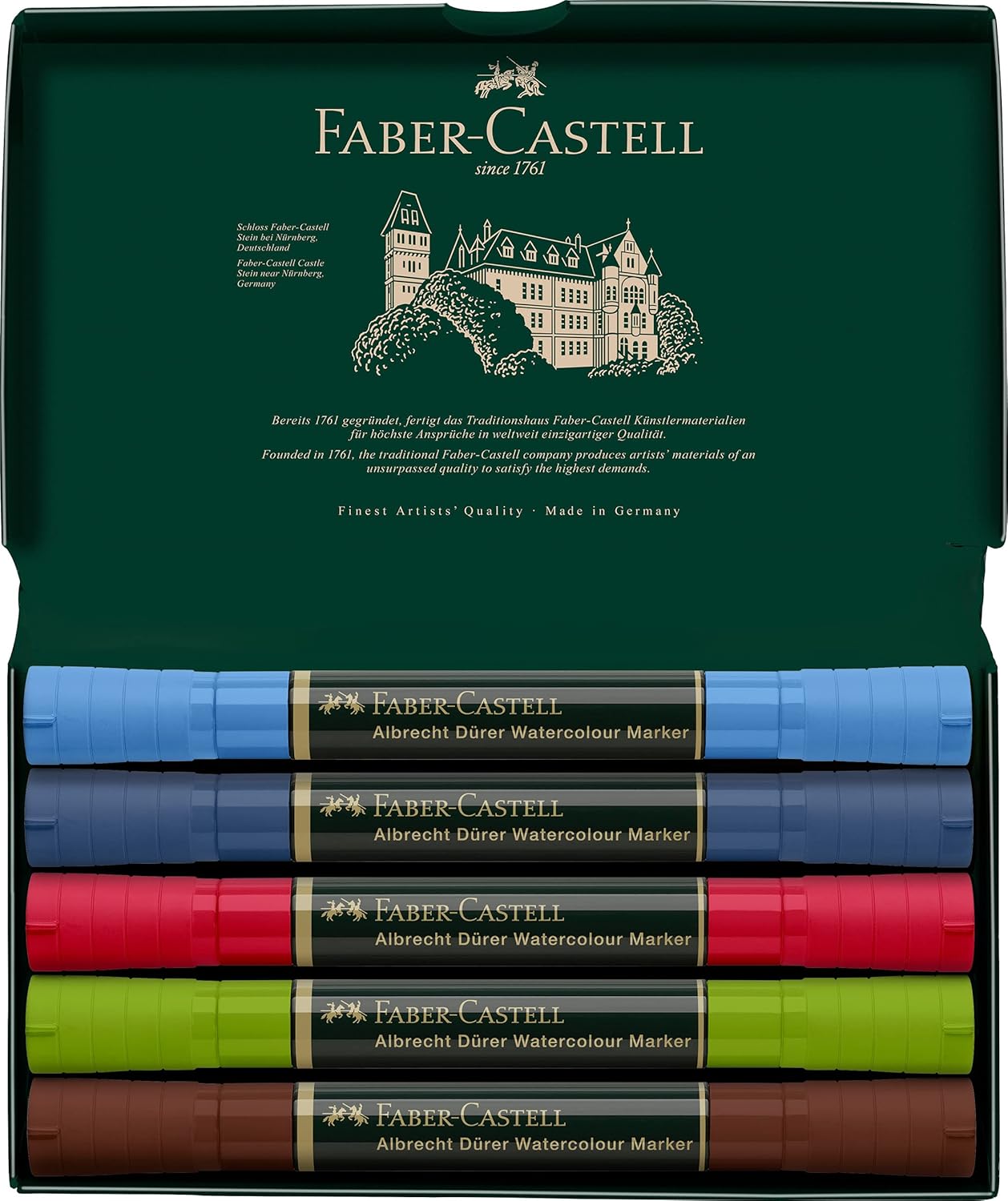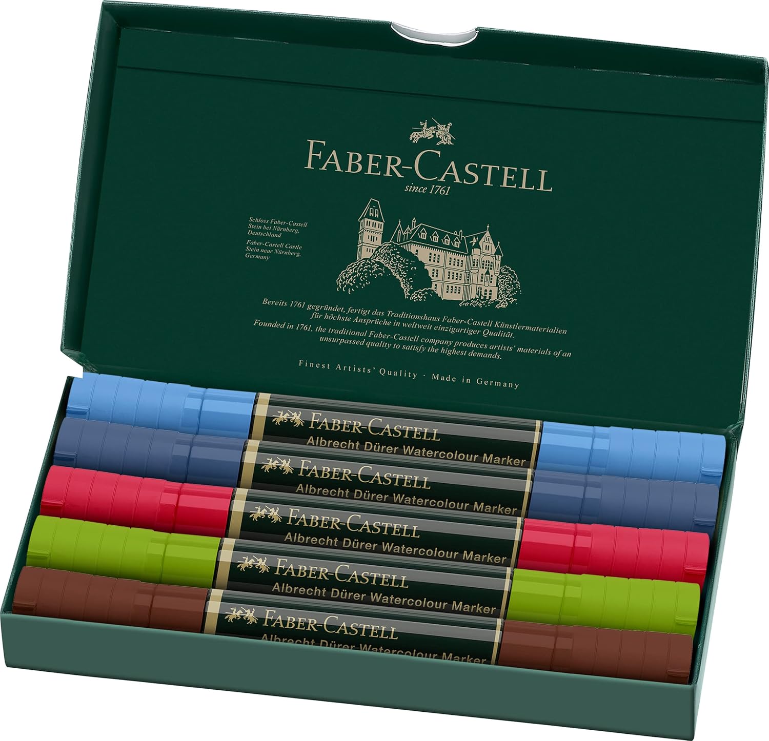 PREMIUM Faber-Castell sono conosciuti e amati in tutto il mondo. Sono il produttore leader mondiale di materiali artistici innovativi di alta qualità. Sono diventati il marchio di riferimento per gli artisti per secoli, sia professionisti che hobbisti. UTILIZZO I pennarelli a doppia punta a base d'acqua sono dotati di un pennino flessibile per colori e schizzi e una punta in fibra stabile per contorni e linee di precisione. Le penne PITT Artist hanno un flusso di inchiostro affidabile e uniforme, con la punta che scivola dolcemente e senza intoppi sulla carta. L'inchiostro è di ottima qualità, inchiostro indiano permanente, privo di acidi e archivio. INCHIOSTRO L'inchiostro altamente pigmentato è solubile in acqua e non sanguina attraverso la carta Regalo Questo set è un regalo meraviglioso per qualsiasi appassionato d'arte o hobbista. Questa pratica custodia è perfetta per viaggi, vacanze, escursioni e molto altro ancora Contenuto della confezione: 5 pennarelli Albrecht Durer Watercolour in una varietà di tonalità Urban Sketch: Ultramarine 120, Indanthrene Blue 247, Deep Scarlet Red 219, May Green 170 e Dark Sepia 175. La custodia compatta è dotata di un coperchio ribaltabile per un facile accesso. I pennarelli scivolano semplicemente all'interno e dopo l'uso fungono da contenitore sicuro, proteggendo i pennarelli dall'usura durante i viaggi e quando l'artista è in movimento.