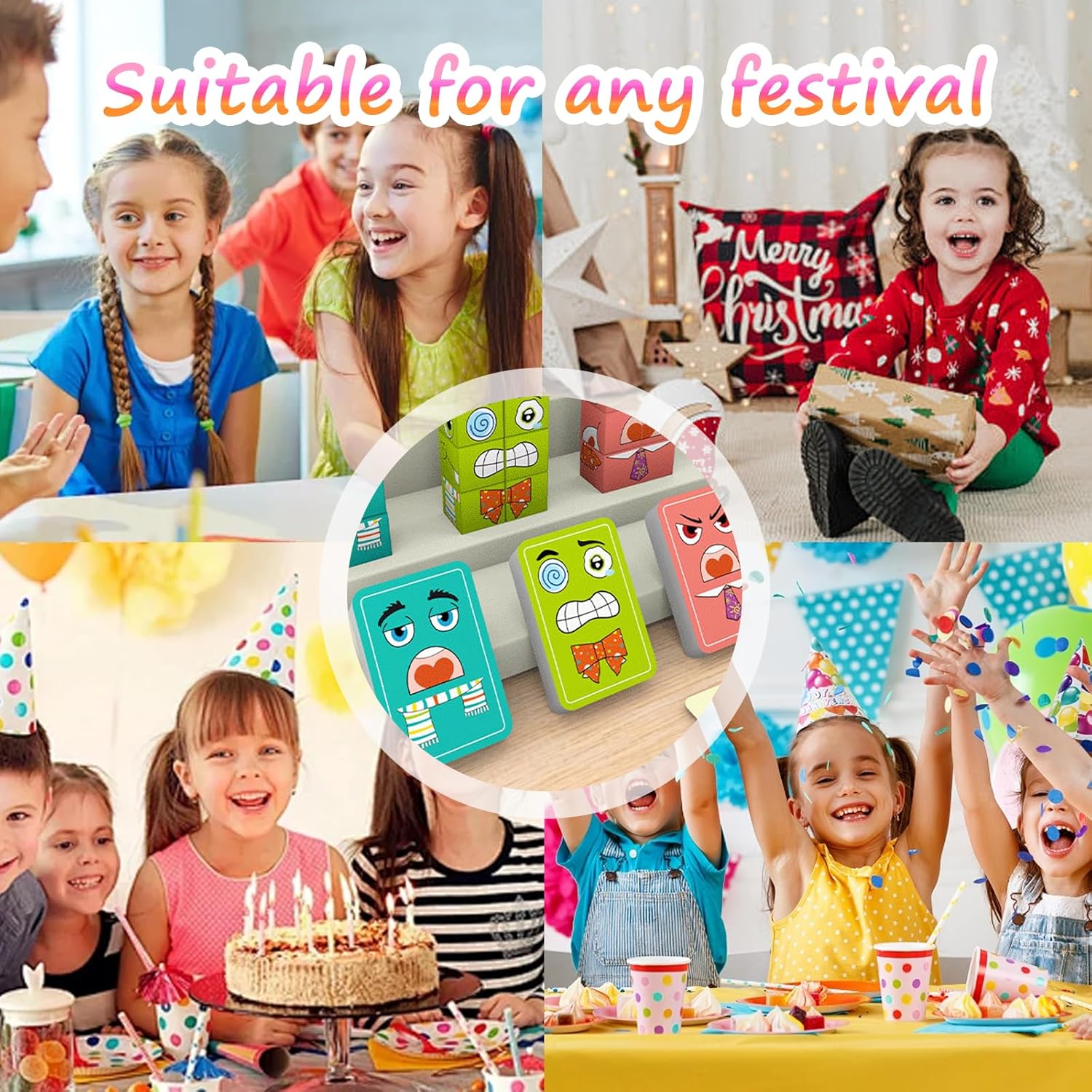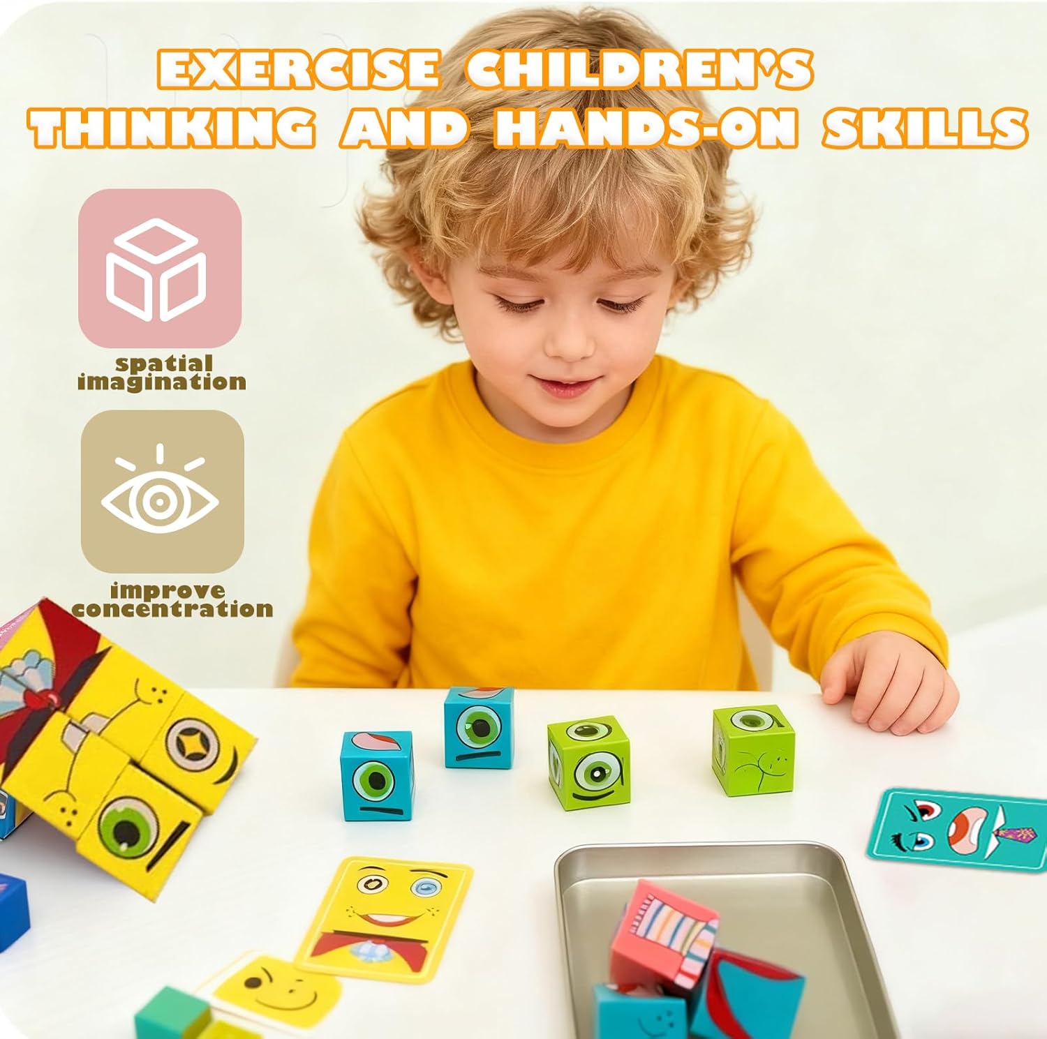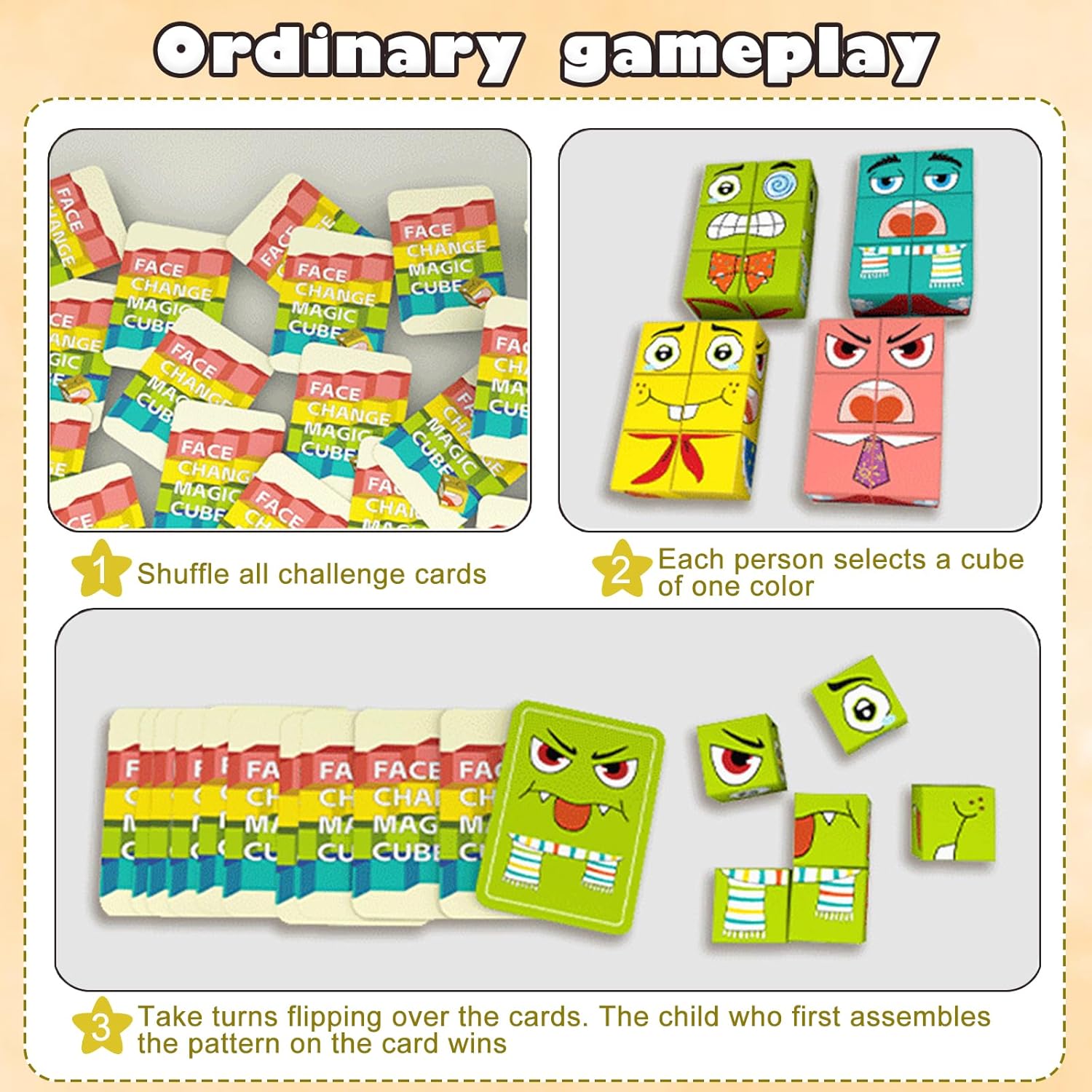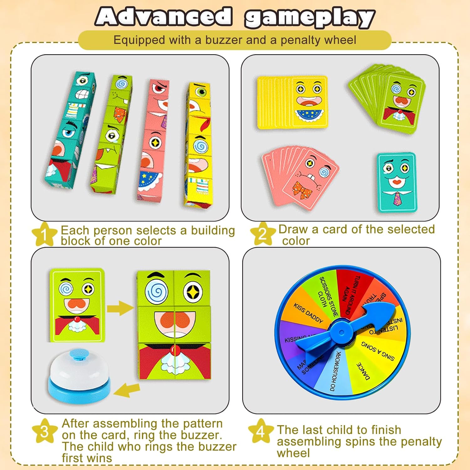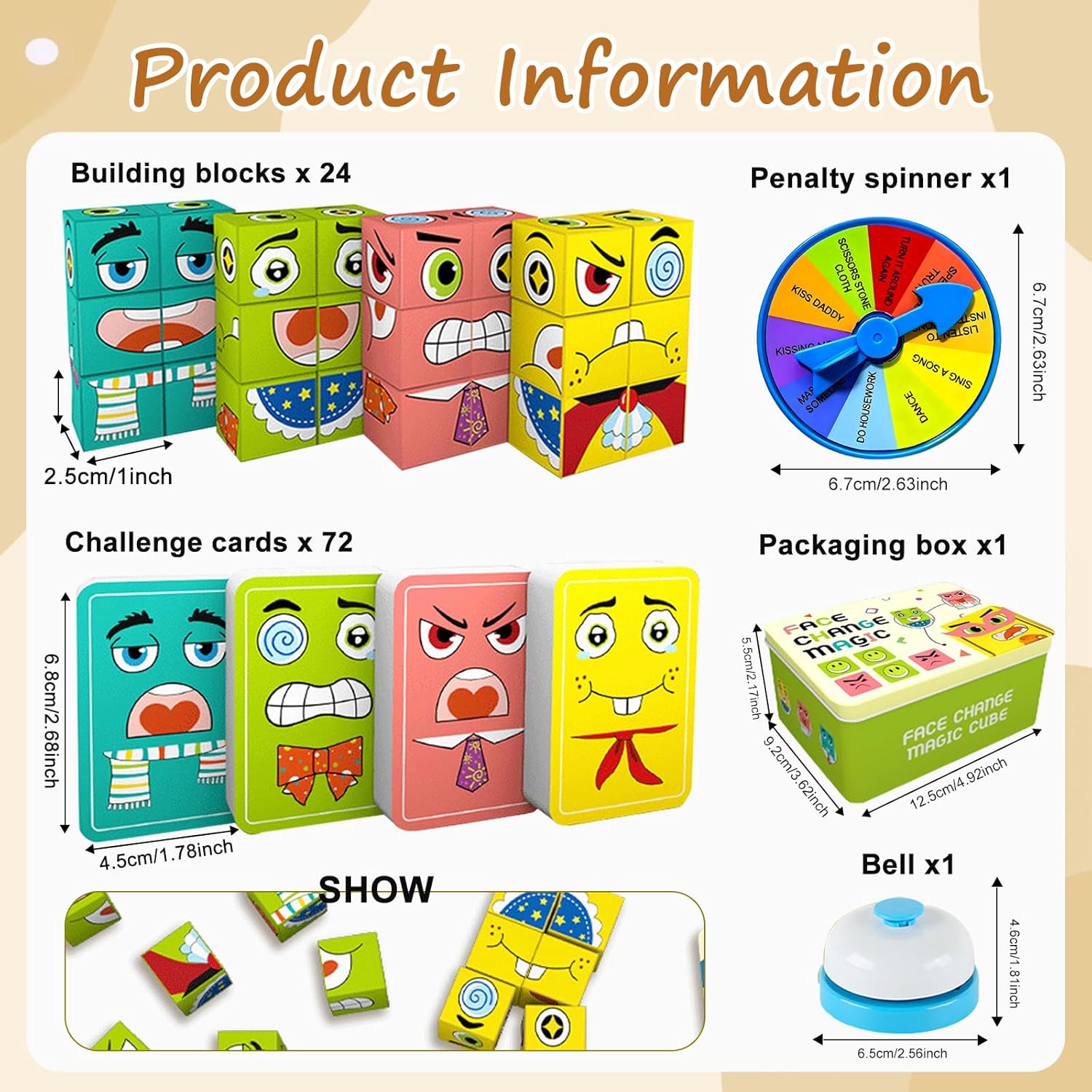 Face Changing Magic Cube Set: questo set include 4 set di cubi di diversi colori con facce che cambiano (24 pezzi) e 74 carte di cambio viso (4 colori). Nella confezione sono inclusi 1 campana e 1 giradischi, adatto per 1-4 bambini che possono giocare contemporaneamente. Materiali di alta qualità: i nostri cubi con facce mutevoli sono realizzati in legno di alta qualità e sono caratterizzati da colori vivaci e resistenti allo sbiadimento e bordi lisci che non graffiano le mani dei bambini. Attirano immediatamente l'attenzione dei bambini, stimolano la loro iniziativa e la loro gioia di giocare e risvegliare il loro interesse per il gioco. Story Cube: questo cubo di cambio viso è perfetto per 1-4 giocatori e offre una forte interattività per soddisfare le esigenze dei bambini di diverse età. Allena la loro capacità di pensiero e reazione ed è quindi una scelta ineguagliabile sia per il legame genitore-figlio che per il gioco di gruppo tra amici. Principio di gioco semplice: mescola prima tutte le carte. Ogni giocatore seleziona un blocco di colore. Quando una carta viene rivelata, vince il primo giocatore che mette insieme il modello e suona la campana. Le semplici regole assicurano che il gioco sia veloce e senza sforzo da imparare. Regalo ideale: questo cubo 3D interattivo con facce mutevoli è adatto a bambini di tutte le età. È ideale per legami genitore-figlio o giochi di gruppo ed è il regalo perfetto per compleanni, feste, Natale, Pasqua e altre occasioni di festa.