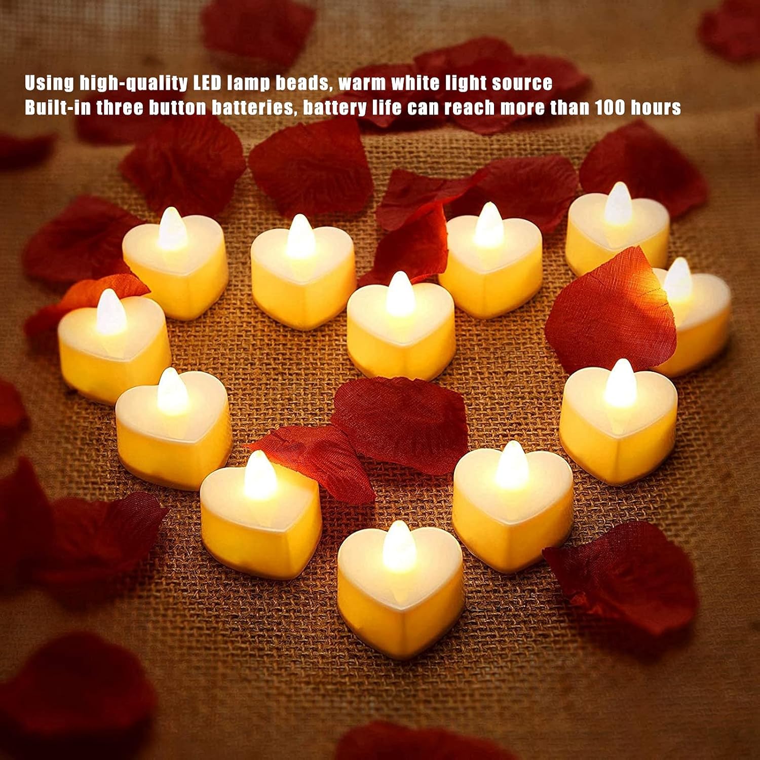 [Fonte luminosa a LED di alta qualità] Queste luci di candela a LED a forma di cuore dispongono di perle di lampada a LED premium che emettono un bagliore bianco caldo, creando un'atmosfera accogliente e romantica. [Design romantico a forma di cuore] Progettato con amore in mente, queste candele a forma di cuore sono un'alternativa bellissima e unica alle tealights tradizionali. [Adatto per occasioni speciali] Eleva le tue celebrazioni con queste versatili candele decorative. [Facile da usare e gestiti a batteria] Accendere o disattivare il pulsante in basso per l'illuminazione istantanea. [Efficienza energetica e ] Queste candele a LED a bassa tensione sono energetiche ed ecofrierevoli, alimentate da batterie (non incluse).