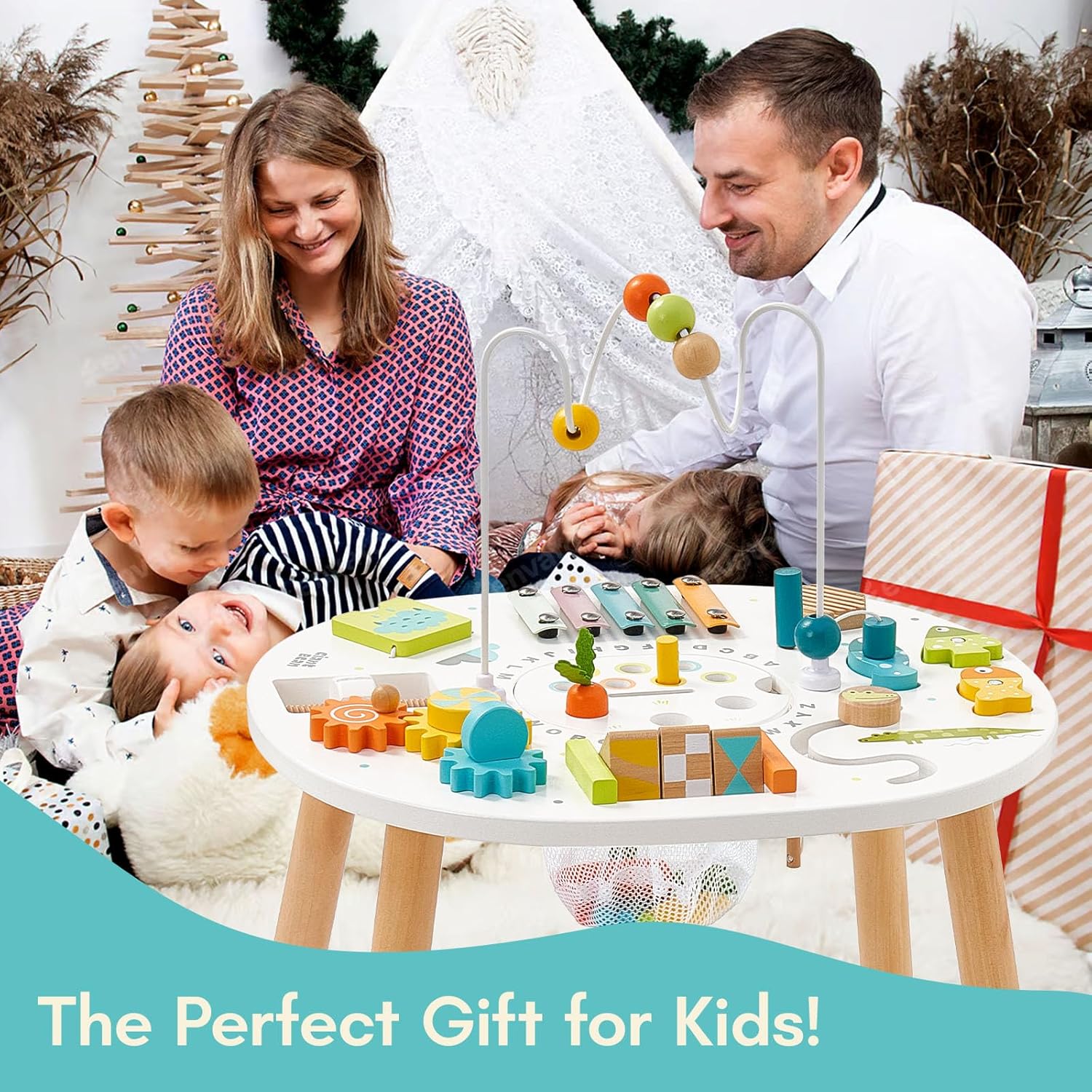 Tavolo di attività 11 in 1: questo tavolo di apprendimento offre 11 attività coinvolgenti: ordinamento delle forme, ordinamento dei colori, gioco di pesca, labirinto di perline, ingranaggi rotanti, xilofono, puzzle con motivi, gioco del cucù, inserimento di perline, rotazione della vite e guiro. Ideale per lo sviluppo delle capacità motorie, della crescita cognitiva e della creatività, offre un'esperienza di apprendimento divertente e sensoriale che incoraggia i più piccoli a esplorare e progredire attraverso il gioco. Design ispirato a Montessori: progettato appositamente per bambini da 1 a 3 anni, questo tavolo di attività promuove l'apprendimento pratico e il gioco interattivo. Attività come l'ordinamento delle forme, la pesca e i labirinti di perline migliorano le capacità motorie e la coordinazione occhio-mano, stimolando la risoluzione dei problemi e lo sviluppo cognitivo. Costruzione sicura e durevole: realizzato in legno di alta qualità con bordi lisci e arrotondati, questo tavolo è costruito per resistere all'uso quotidiano intenso. La sua struttura robusta garantisce una stabilità ottimale, mentre i suoi materiali atossici e adatti ai bambini garantiscono tranquillità ai genitori. Incoraggia l'indipendenza: questo tavolo di attività in legno incoraggia i più piccoli a esplorare e giocare in modo indipendente. Con attività adattate al loro ritmo, coltiva l'indipendenza, accresce la fiducia in se stessi e promuove l'apprendimento autodiretto e la risoluzione dei problemi. Regalo perfetto: questo centro attività in legno è un regalo ideale per compleanni, vacanze (Natale, Pasqua) e altre occasioni speciali. Grazie alle sue attività educative e di intrattenimento, unisce perfettamente apprendimento e gioco. Accuratamente confezionato, promette ore di divertimento sostenendo lo sviluppo del tuo bambino!