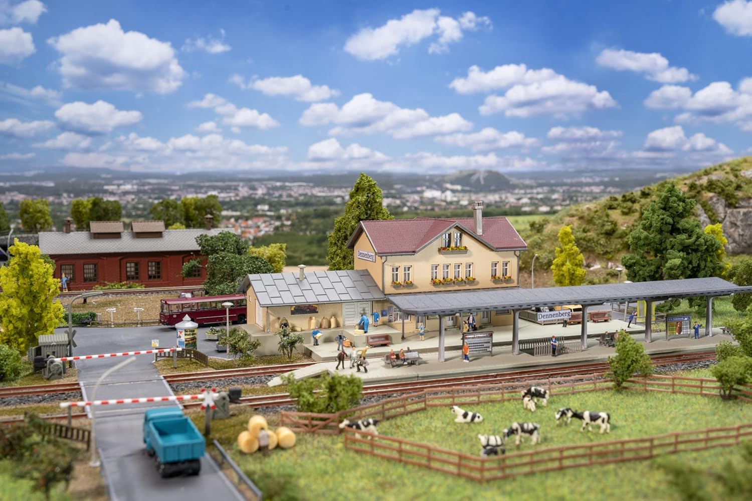 FALLER 239007 N Action Set Stazione Dennenberg Scala N Questo kit contiene: 217 parti singole in 14 colori, pellicola per finestre, 2 decorazioni e 3 istruzioni per la costruzione. Usa la colla per plastica FALLER EXPERT per il fai da te.