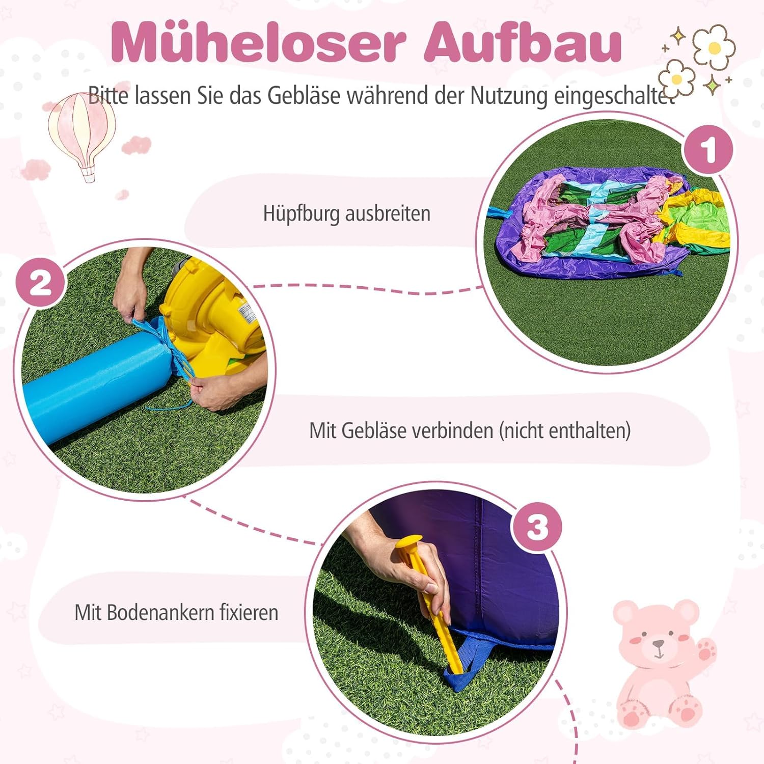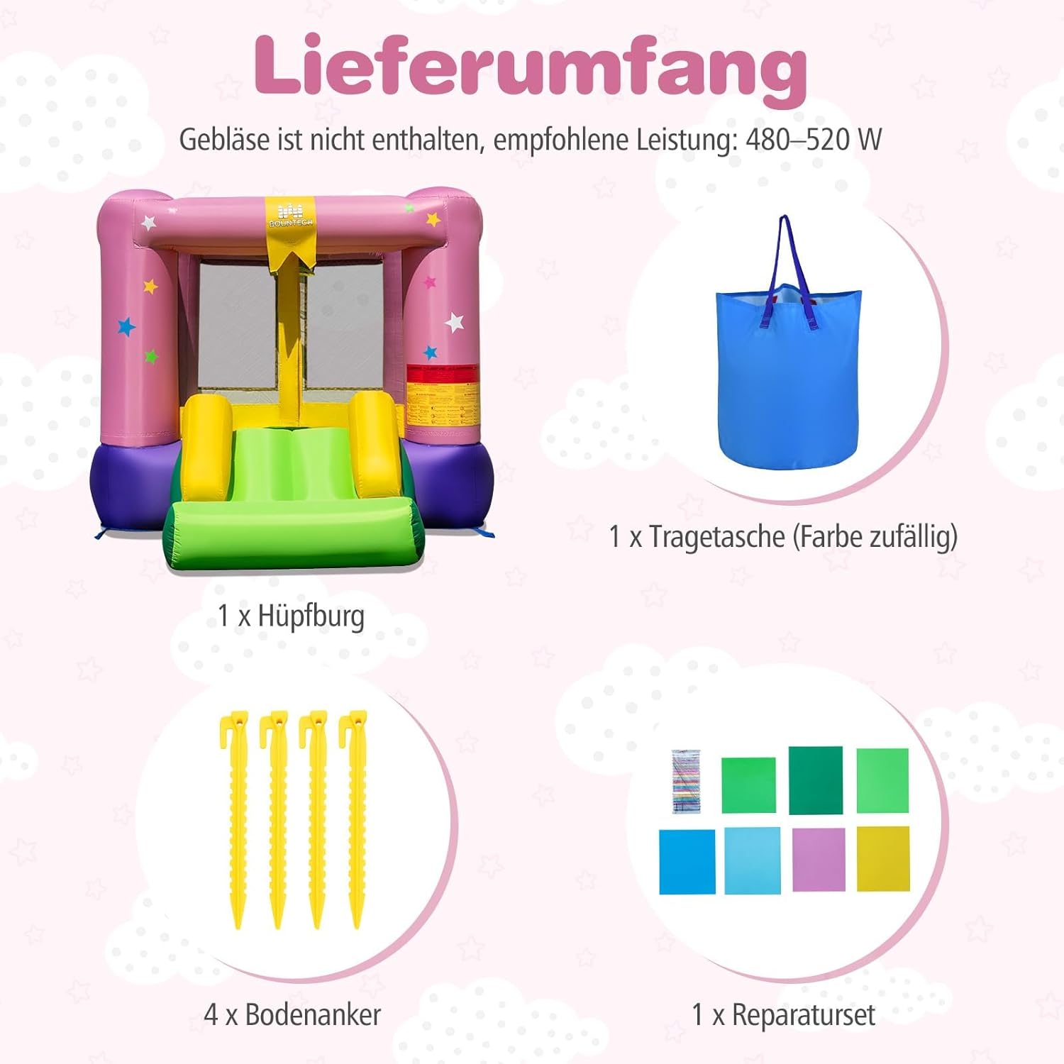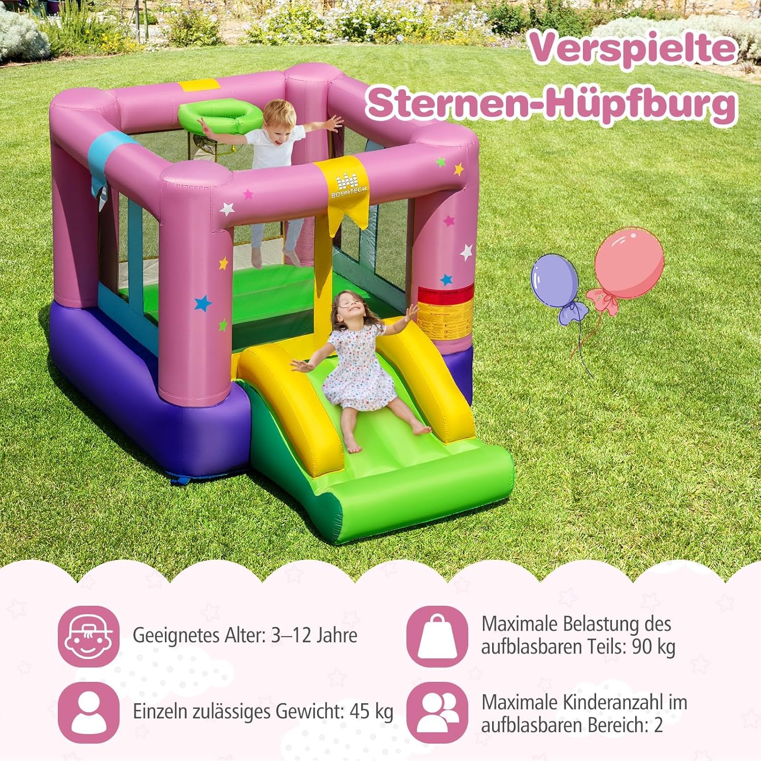Materiali premium per una lunga durata: realizzati in resistente tessuto Oxford, noto per le sue proprietà antistrappo, resistenti all'usura, allo sbiadimento e all'acqua. Completo di doppie cuciture senza cuciture e di un robusto tappetino da salto in PVC, questo castello gonfiabile garantisce una lunga durata. MOLTE OPPORTUNITÀ DI DIVERTIMENTO: scatena le risate con il nostro divertente castello Progettato per creare un divertimento senza fine, il castello gonfiabile offre una spaziosa superficie per saltare, un emozionante canestro da basket e uno scivolo emozionante. Un'avventura perfetta per bambini dai 3 ai 12 anni. CARATTERISTICHE DI SICUREZZA AVANZATE: Tempo di gioco sicuro garantito. Il castello gonfiabile è dotato di fitte pareti in rete protettiva e cuscinetti antiscivolo alti 6" per proteggere in modo ottimale i tuoi bambini durante il gioco. Montaggio semplice e accessori pratici: l'installazione del castello gonfiabile è un gioco da ragazzi e include ancoraggi a terra per un fissaggio sicuro e un kit di riparazione per una facile manutenzione. Con il tuo ventilatore (non incluso nella consegna), puoi iniziare subito! Assicurati che il ventilatore rimanga acceso durante il gioco. Design affascinante e applicabilità da tutti i lati: con il suo design magicamente stellato, il castello gonfiabile aggiunge un tocco di magia in ogni mondo di gioco Ideale per uso interno ed esterno, offre divertimento tutto l'anno in qualsiasi ambiente.