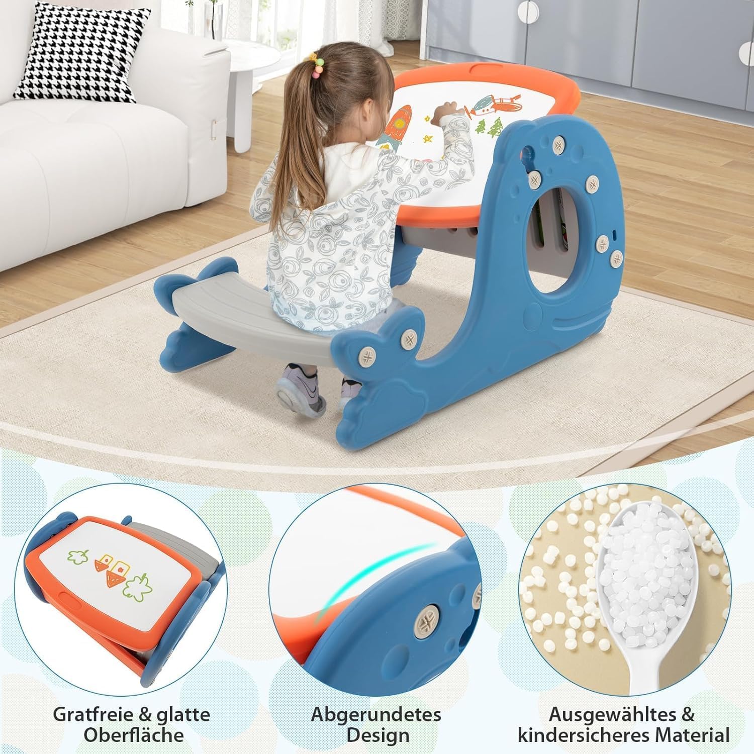 Multifunzionale 4 in 1: il tavolo per bambini può essere utilizzato come tavolo da apprendimento, tavolo da pranzo, cavalletto o libreria ed è ottimo per riporre libri per bambini o disegni. Il piano del tavolo a doppia faccia soddisfa le diverse esigenze dei bambini. Pratico spazio e panchina: il tavolo è dotato di un porta libri, due portabicchieri e una pratica fessura per penne. Inoltre, il cavalletto è collegato a una panca liscia su cui il bambino può rilassarsi. Lavagna regolabile in angolo: la lavagna può essere regolata fino a 30 gradi, consentendo ai bambini di trovare la posizione più comoda per disegnare le loro idee creative. Inoltre, la lavagna è molto facile da pulire. Materiale selezionato: il robusto tavolo da disegno e sedia sono realizzati con materiali sicuri e sicuri. Gli angoli arrotondati e i bordi senza sbavature assicurano che la pelle delicata dei bambini non venga graffiata. Opzione regalo ideale: la forma della balena e i colori vivaci attireranno l'attenzione dei bambini. Con un'altezza di seduta di 15 cm e un'altezza del tavolo di 56 cm, il set è ideale per bambini a partire da 1 anno.