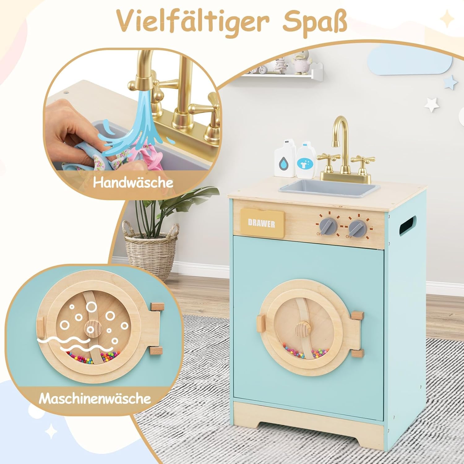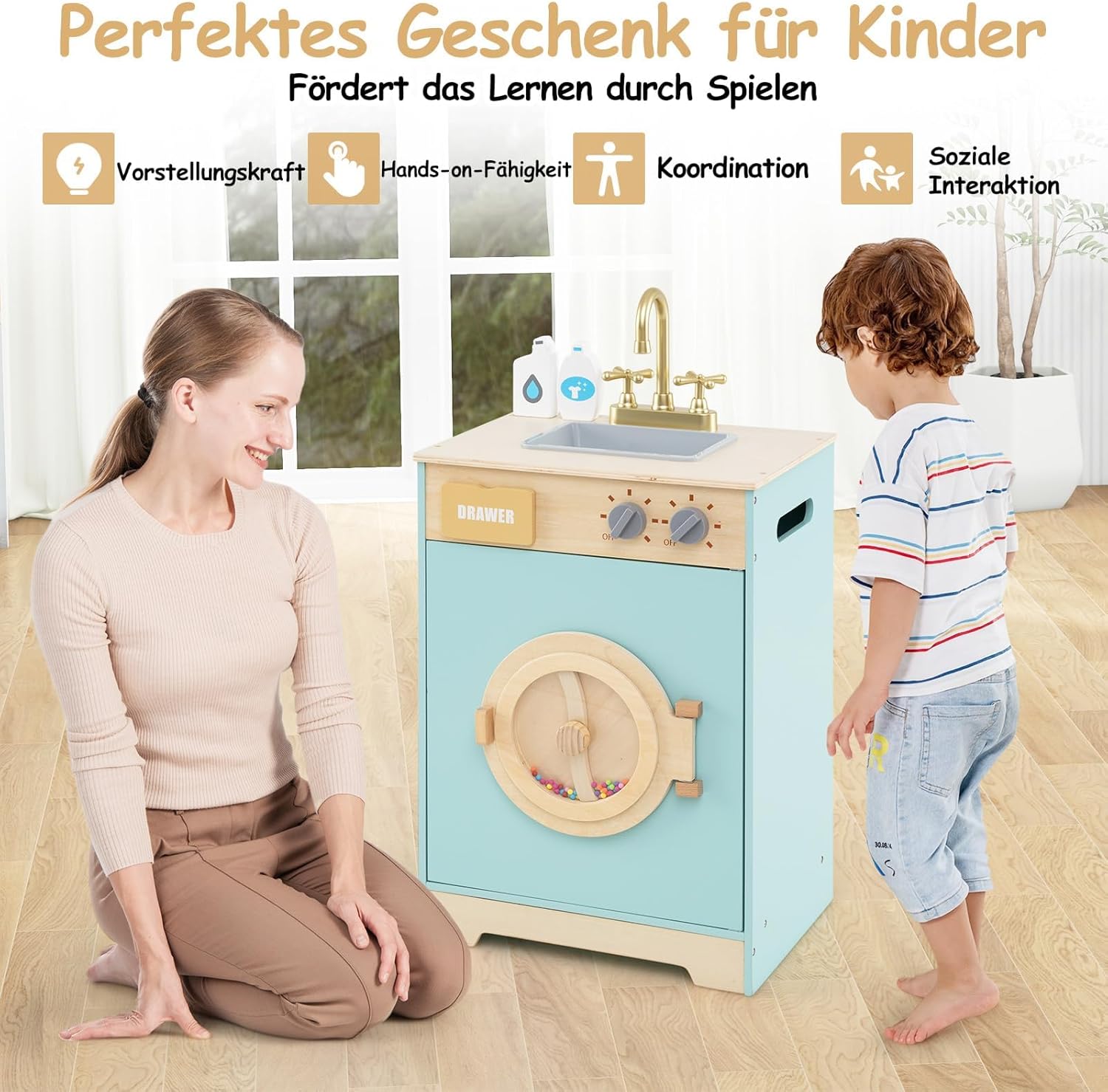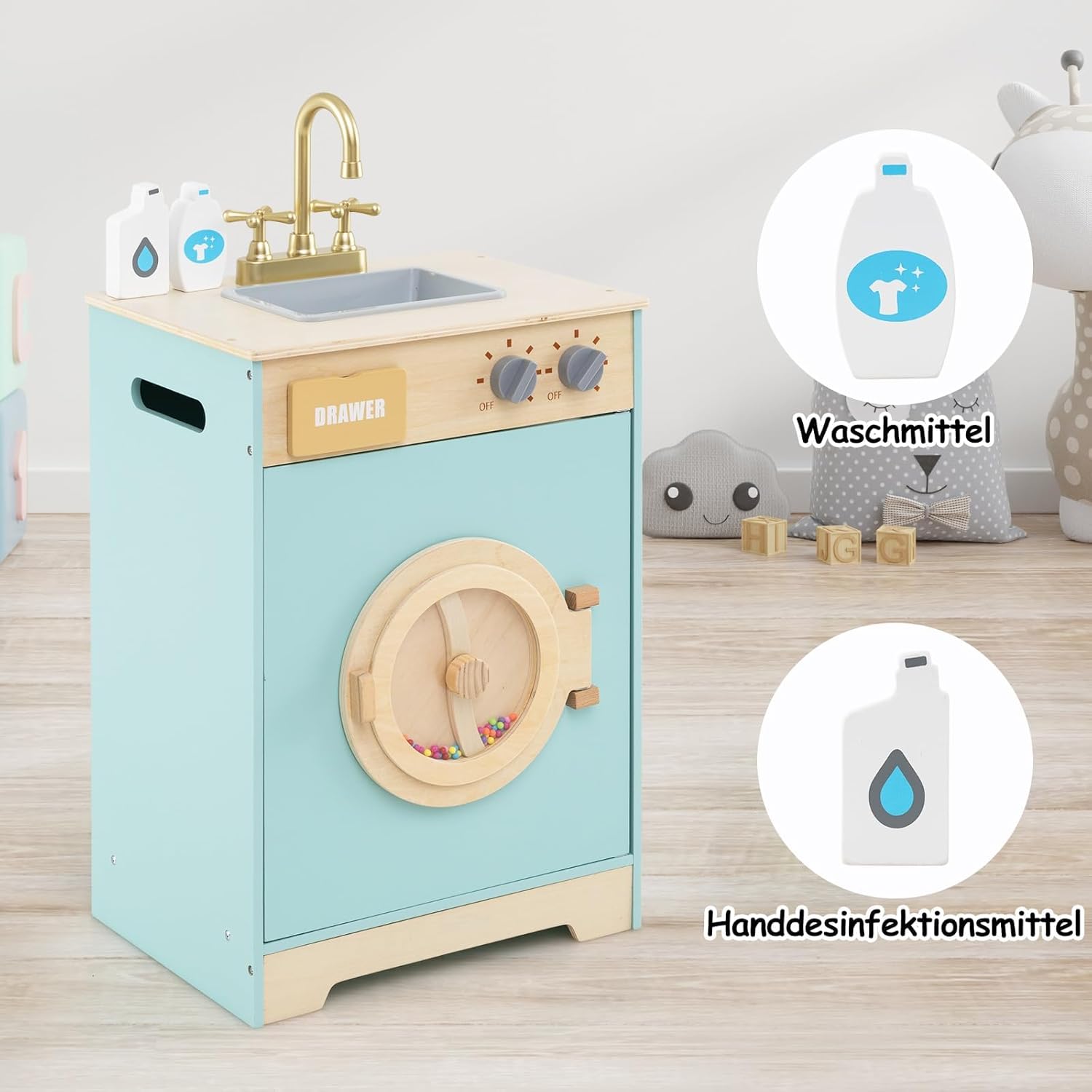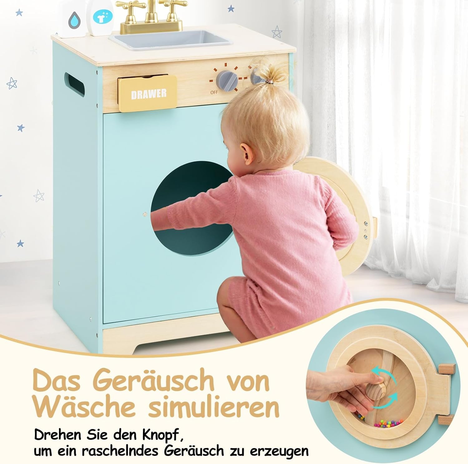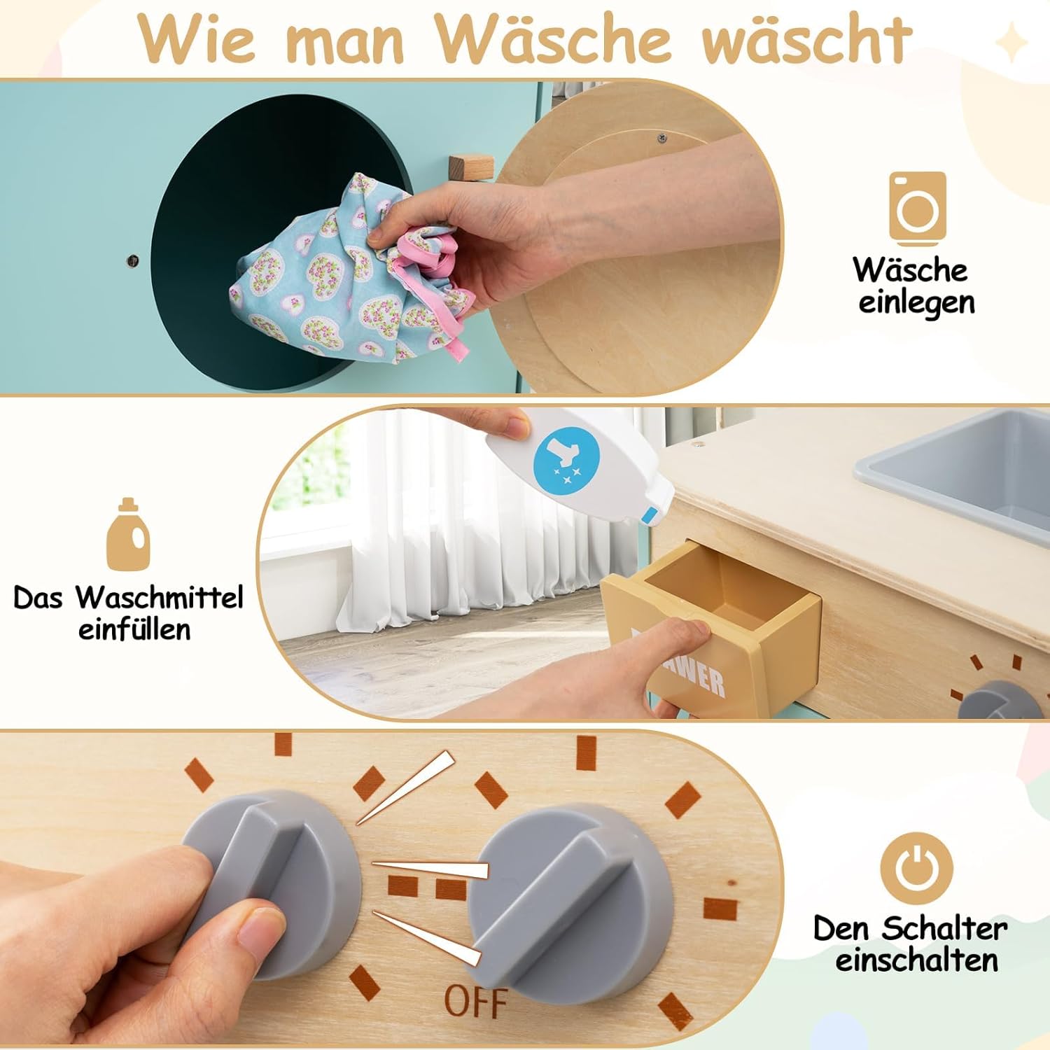 Design realistico per lavatrice: questo set da gioco per lavatrice dispone di una porta trasparente con una ruota girevole e perline che imitano i suoni della biancheria e offrono un'esperienza di gioco coinvolgente. Come con una vera macchina: mettere i vestiti, versare il detersivo e premere l'interruttore. Struttura sicura e affidabile: per garantire la sicurezza dei bambini, il set di biancheria dispone di una superficie in legno infrangibile e angoli arrotondati che proteggono le mani piccole. Crea un ambiente di gioco sicuro e dà ai genitori la pace di almeno Graziosi accessori per il lavaggio: insieme alla lavatrice giocattolo vengono forniti gli utensili da lavaggio: una bottiglia di detersivo e disinfettante per le mani che arricchiscono l'esperienza di lavaggio. Questi elementi carini rafforzano la realtà e insegnano l'importanza della pulizia e dell'igiene. Lavandino giocoso e rimovibile: questo set di lavaggio per bambini include un lavello rimovibile che favorisce le capacità di lavaggio delle mani attraverso simulazioni realistiche. Offre ulteriori possibilità di interazione e rafforza le capacità motorie. Ottimo regalo per bambini: la lavatrice per bambini è un regalo divertente ed educativo per bambini dai 3 anni in su, ideale per compleanni, feste o occasioni speciali. Incoraggia l'apprendimento attraverso il gioco, migliora l'immaginazione, le abilità pratiche e il coordinamento, così come il legame genitore-figlio.