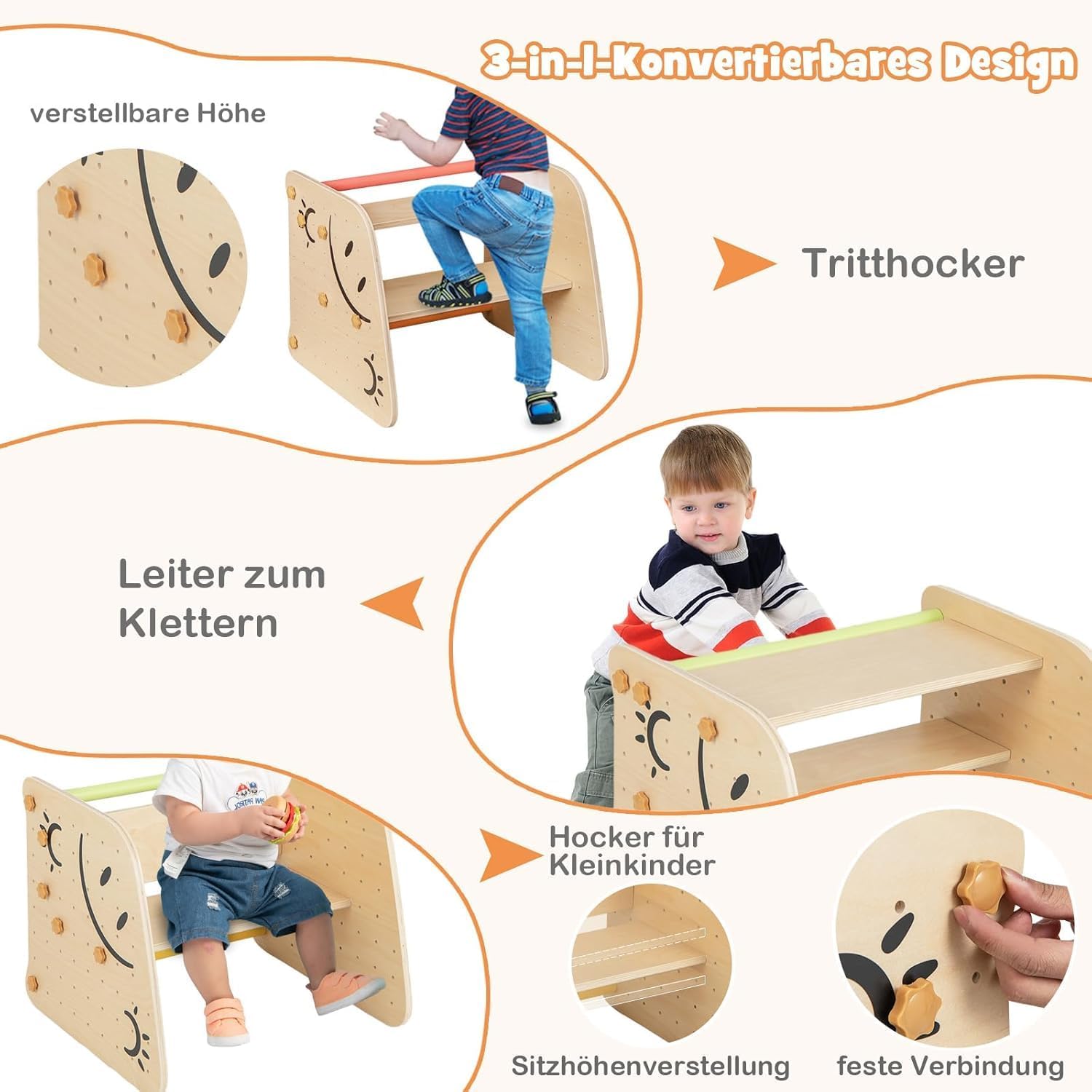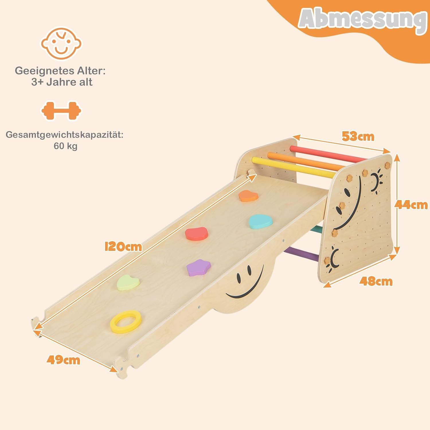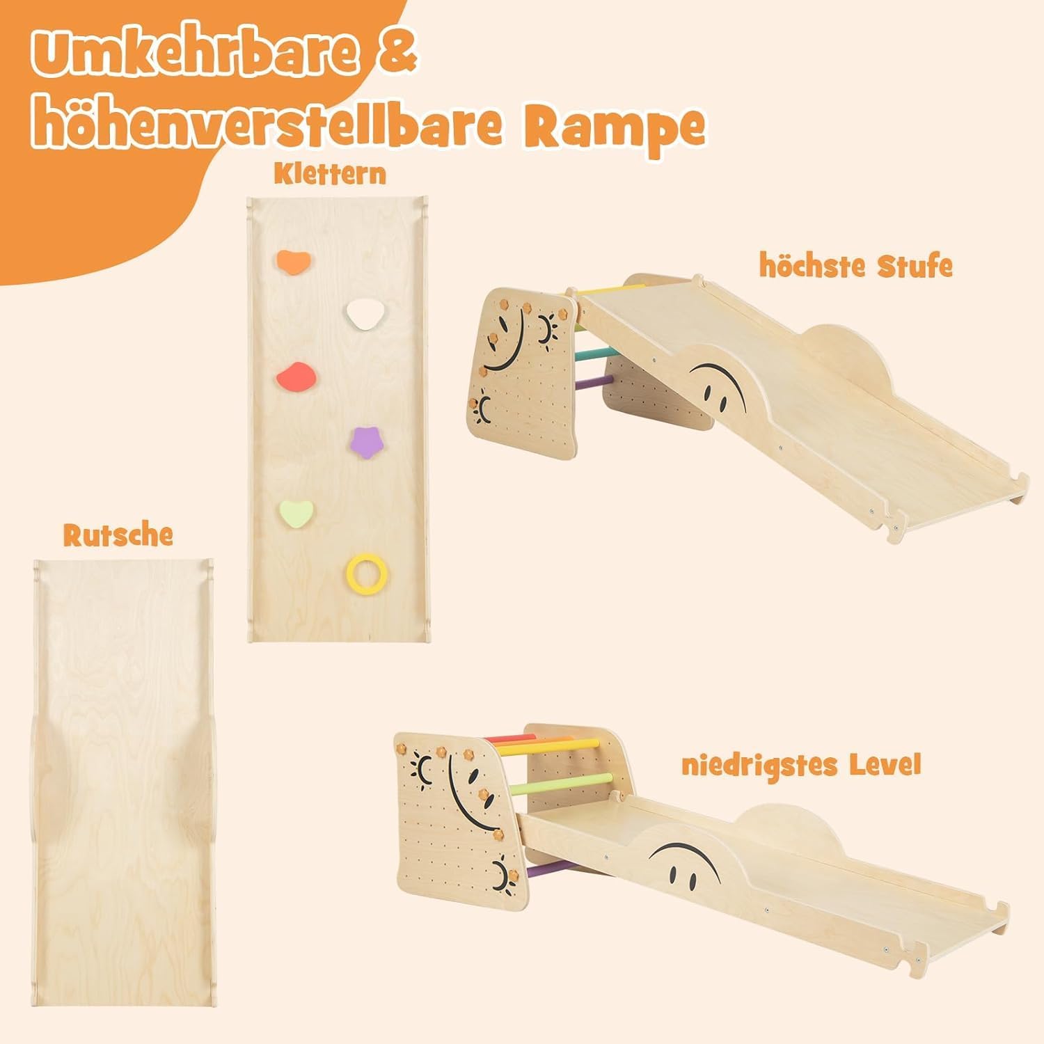 Struttura da arrampicata in 6 pezzi: il nostro versatile set da arrampicata offre numerose possibilità di gioco per i vostri bambini. Comprende uno scivolo, una rampa da arrampicata, un bilanciere, una scala da arrampicata, uno sgabello e una sedia per bambini con schienale. Soddisfa le diverse esigenze di attività dei bambini e può ospitare fino a 2 bambini che giocano. Sgabello trasformabile: grazie alla possibilità di trasformare la scala in uno sgabello, i bambini possono lavarsi le mani e lavarsi i denti in modo indipendente, oppure può essere utilizzato come sedia per bambini per un comodo angolo lettura. Con diversi fori di fissaggio sono disponibili diverse opzioni di altezza per bambini di età diverse. Rampa reversibile 3 in 1: la rampa ha lati a doppia faccia, un lato funge da scivolo e l'altro come tavola da arrampicata. L'altezza della rampa può essere regolata in modo flessibile per fornire diversi livelli di difficoltà per lo scivolamento e l'arrampicata. Inoltre, la rampa può essere utilizzata anche come altalena per aggiungere divertimento ai bambini. Struttura stabile e robusta: realizzata con barre di pino massiccio, la nostra struttura da arrampicata offre un'eccellente durata. La robusta struttura triangolare garantisce stabilità e impedisce una leggera oscillazione. La base allargata e robusta rende la struttura da arrampicata abbastanza forte da sostenere fino a 60 kg e accompagnerà i tuoi bambini a lungo. Regalo perfetto per i più piccoli: il set di giocattoli da arrampicata indoor è sicuro e affidabile per bambini dai 3 anni in su. I bordi arrotondati e privi di sbavature proteggono la pelle delicata dei bambini, mentre le pietre da arrampicata colorate garantiscono una presa sicura. I bambini possono giocare in stanze diverse, come soggiorno, camera dei bambini, asilo nido o asilo.