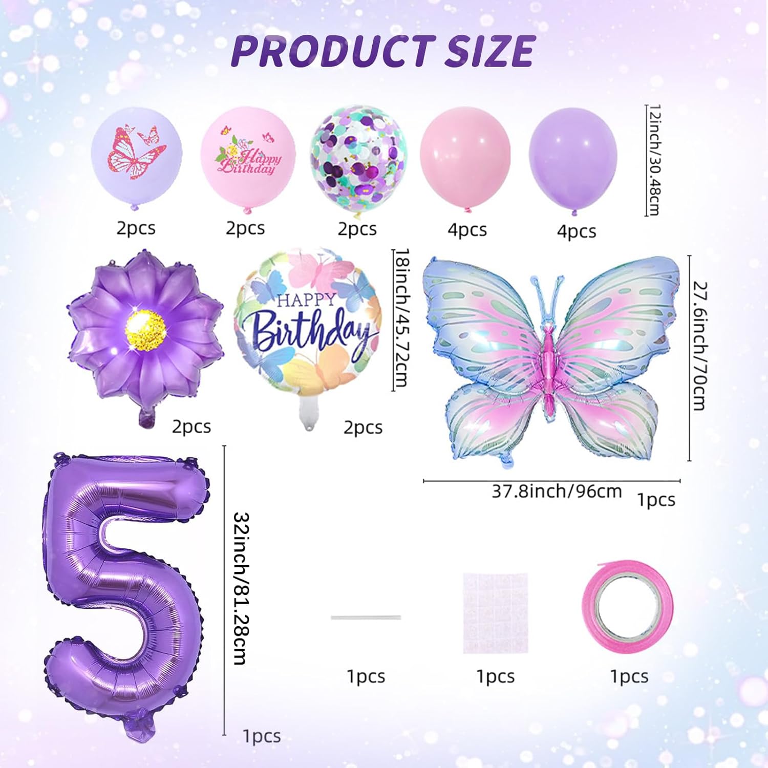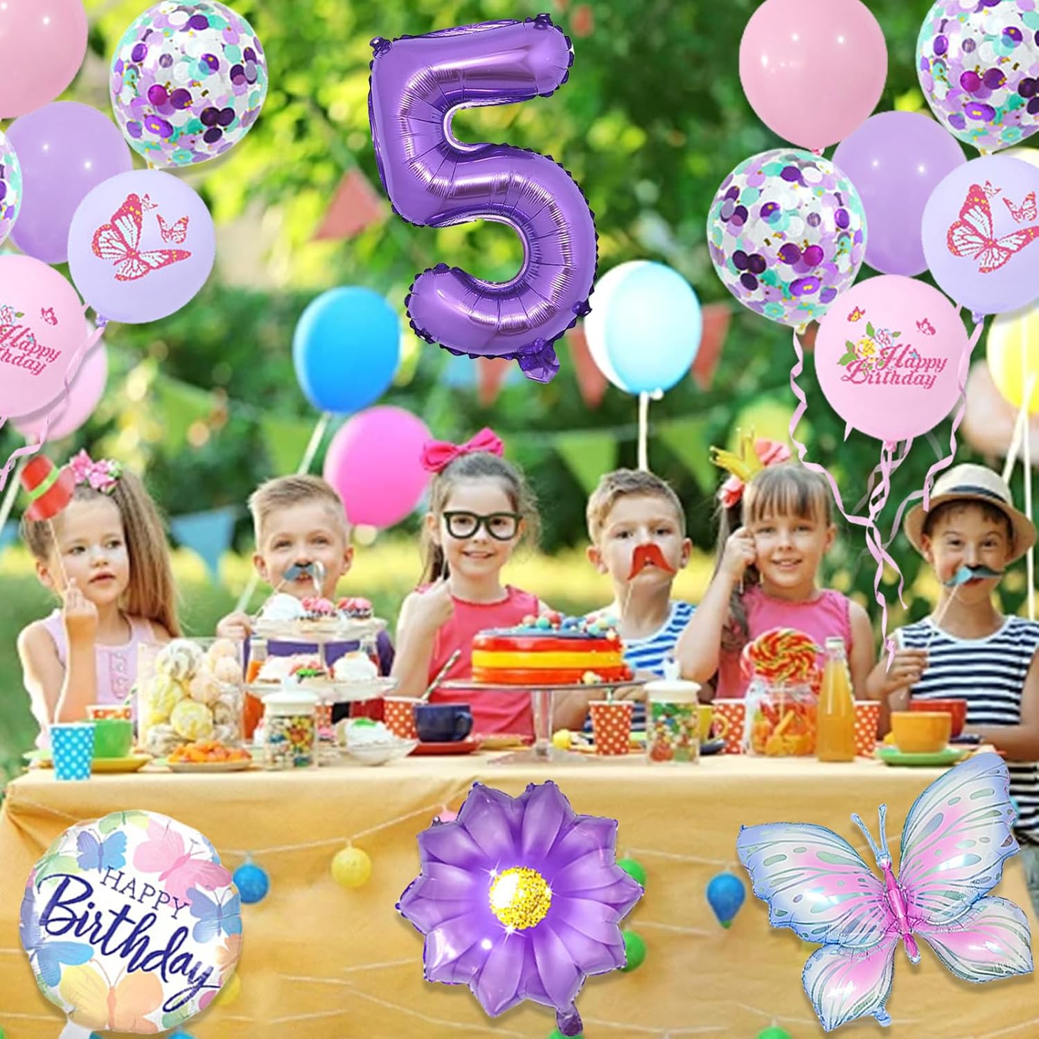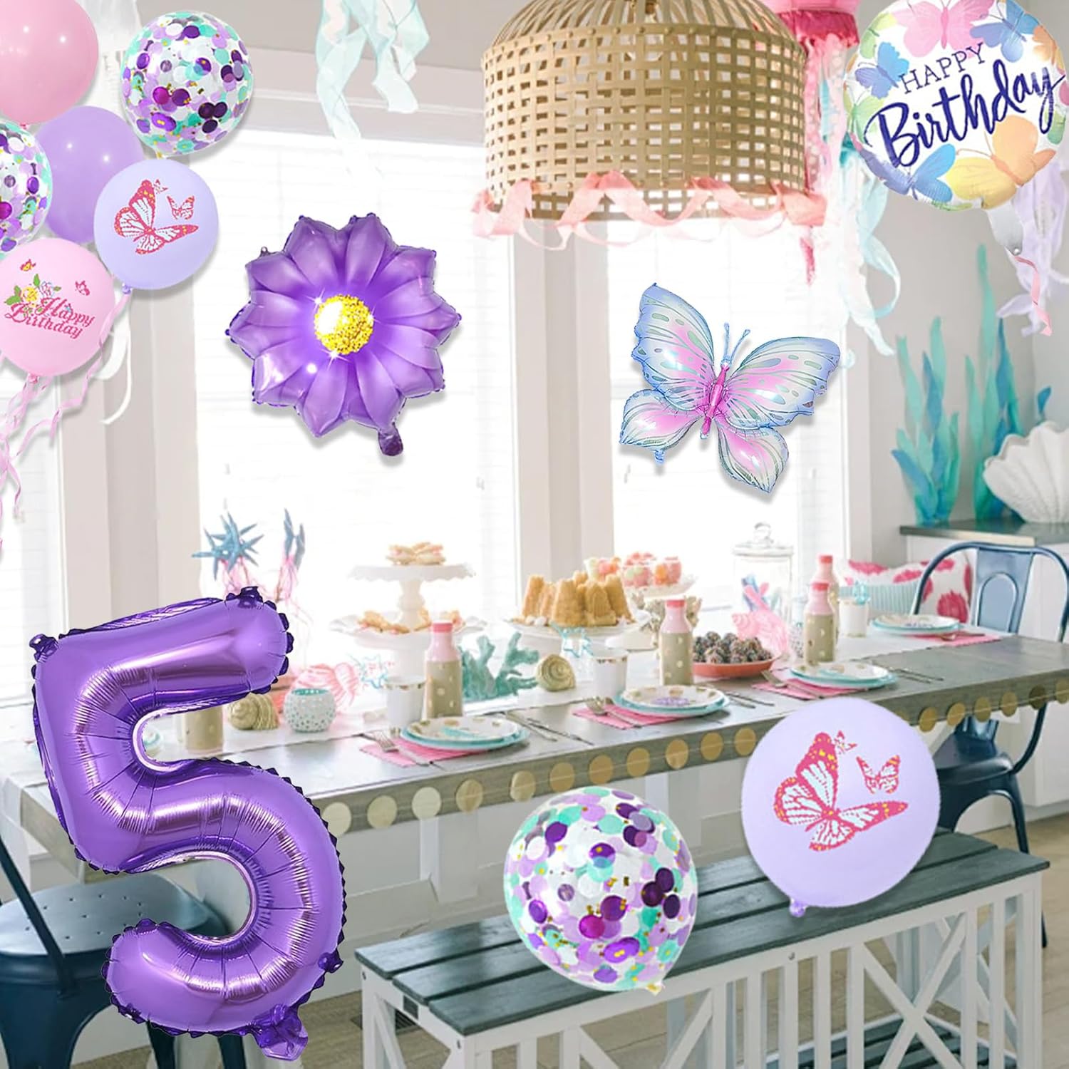 Farfalla decorativa per compleanno e bambine, 5 anni, decorazione di compleanno, palloncini a forma di farfalle, palloncini a forma di numeri, viola per feste di compleanno per bambini