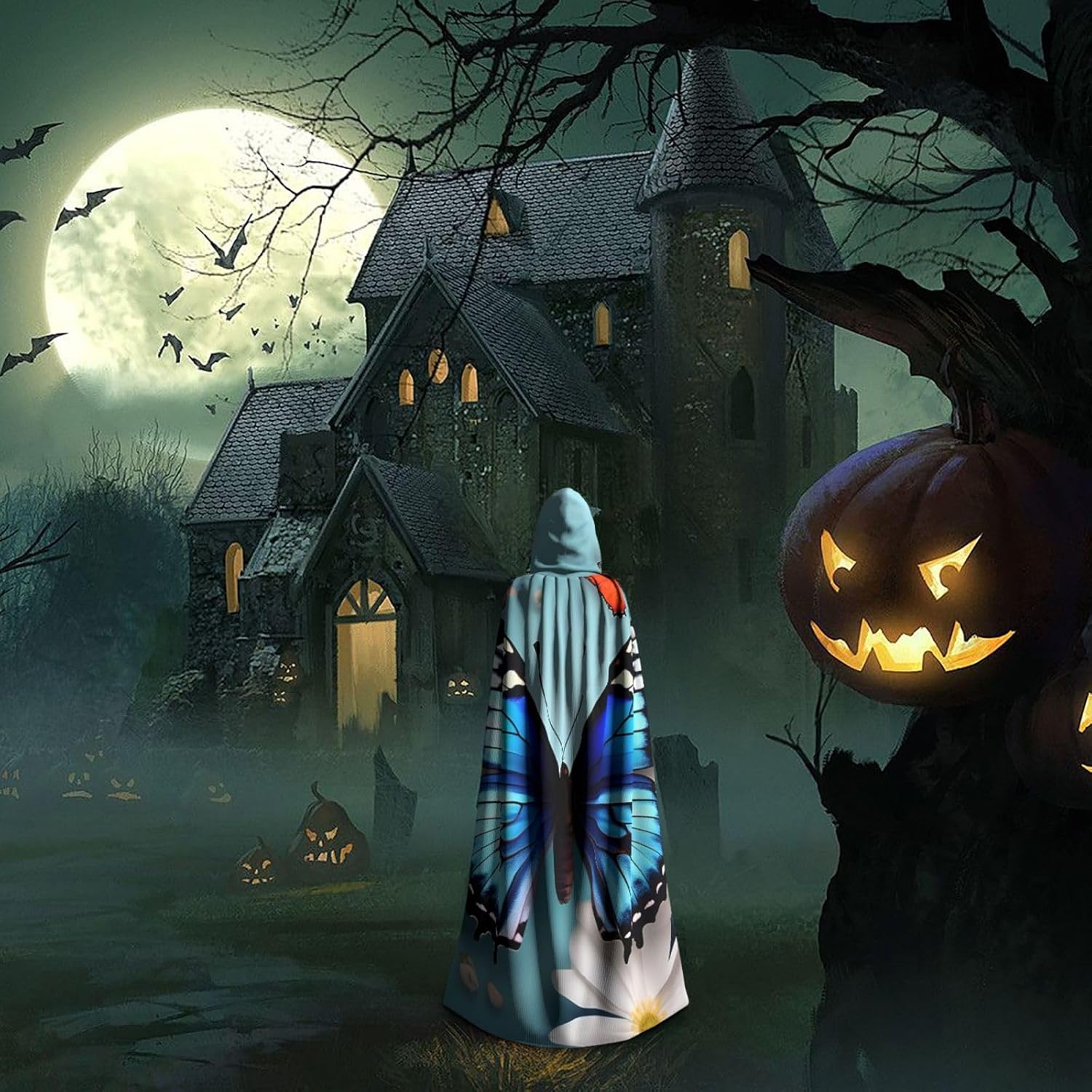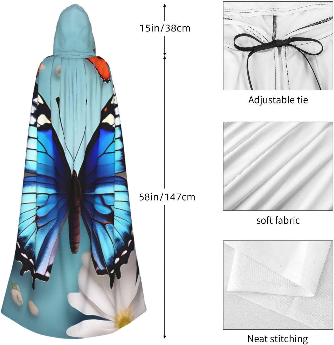 Ruba lo spettacolo a qualsiasi evento di Halloween o a tema con il nostro mantello con cappuccio. Realizzato con un tessuto confortevole, non pruriginoso, questo mantello con stampa di farfalle e fiori è progettato per assicurarti di distinguerti tra la folla. Il mantello è facile da indossare e togliere, grazie alla cravatta e all'assenza di una cerniera. Con un design facile da pulire, può essere lavato in lavatrice o a mano per garantire che sia sempre pronto per il tuo prossimo evento. Prova la perfetta miscela di comfort, stile e versatilità con il nostro mantello con cappuccio.