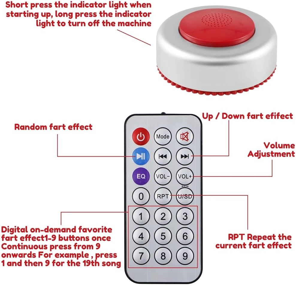 [Effetti sonori realistici] Questa macchina scoreggia può produrre suoni di scoreggia incredibilmente realistici e realistici. La vostra famiglia o i vostri colleghi saranno divertiti da questo giocattolo per macchina audio. [50 suoni realistici] Il dispositivo ha 50 diversi effetti sonori realistici che rendono gli scherzi più divertenti e arrivano alla maggior parte delle persone. [Compatto e portatile] La macchina scoreggia misura 6,8 x 2,6 cm ed è da 3 batterie AAA (non incluse). È compatto e portatile. Con il in dotazione, puoi scherzo a chiunque e in qualsiasi momento. [Facile da usare] Il rumore scoreggia telecomandato è facile da usare. Basta premere il pulsante sul e godersi il divertimento di strisciare. [Divertente regalo per scherzare] La nostra macchina da scoreggia telecomandata è un giocattolo molto divertente per feste, Natale, Halloween e altre feste, è anche un regalo ideale per .