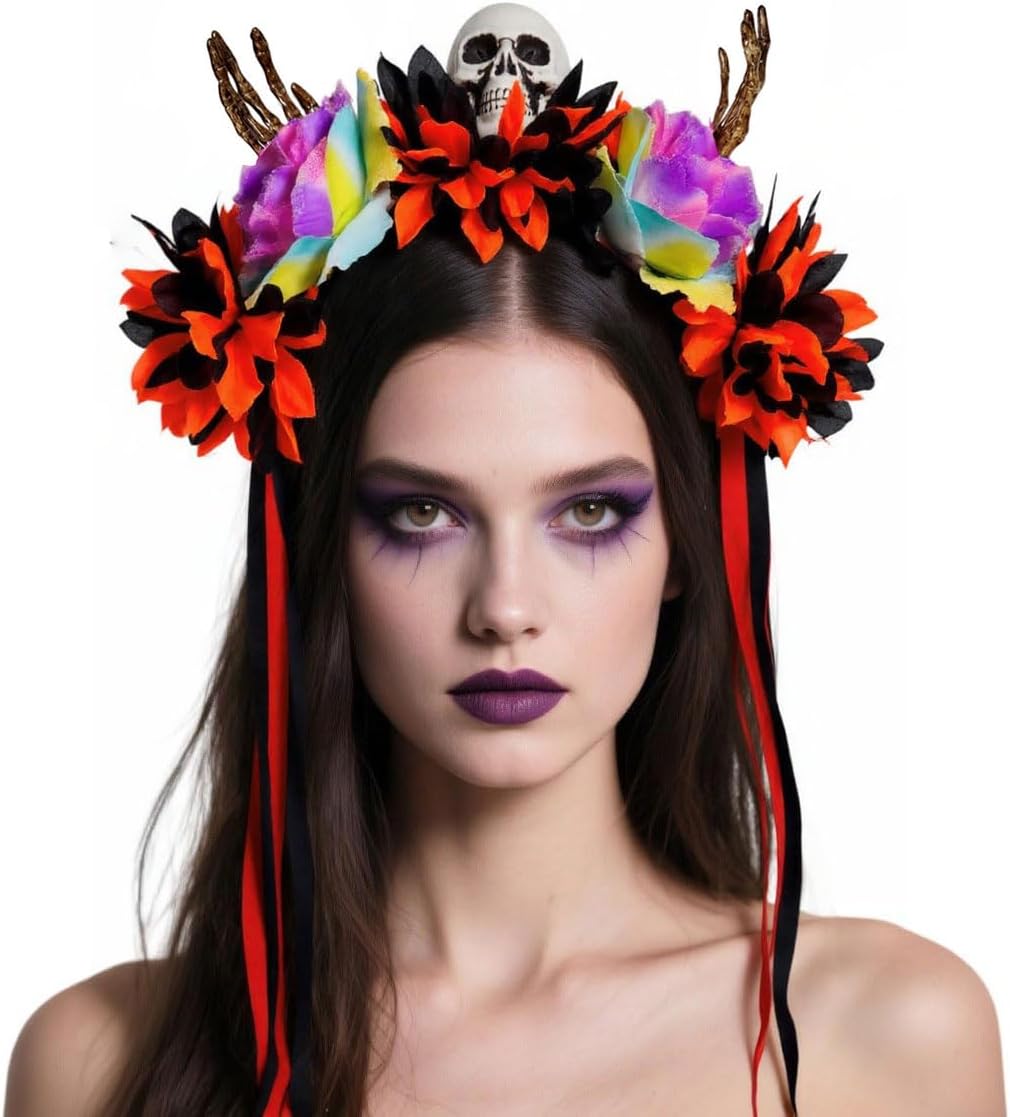 Fascia per capelli con teschio, accessorio per capelli di Halloween, fiori colorati e mani scheletriche, per adulti e bambini, feste in costume, fasce per capelli per adulti e bambini