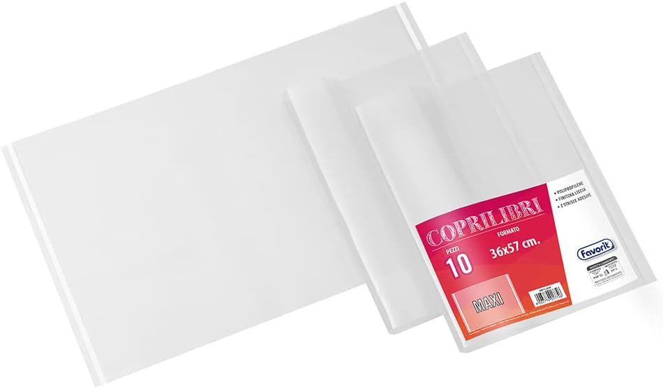 Coprilibri trasparenti con finitura liscia, realizzati in polipropilene con 2 strisce adesive permanenti. Formato Maxi 36 x 57 cm Estrema protezione per i libri, elevata resistenza, leggeri e pratici I coprilibri sono adatti per utilizzo intensivo Confezione da 10 pezzi