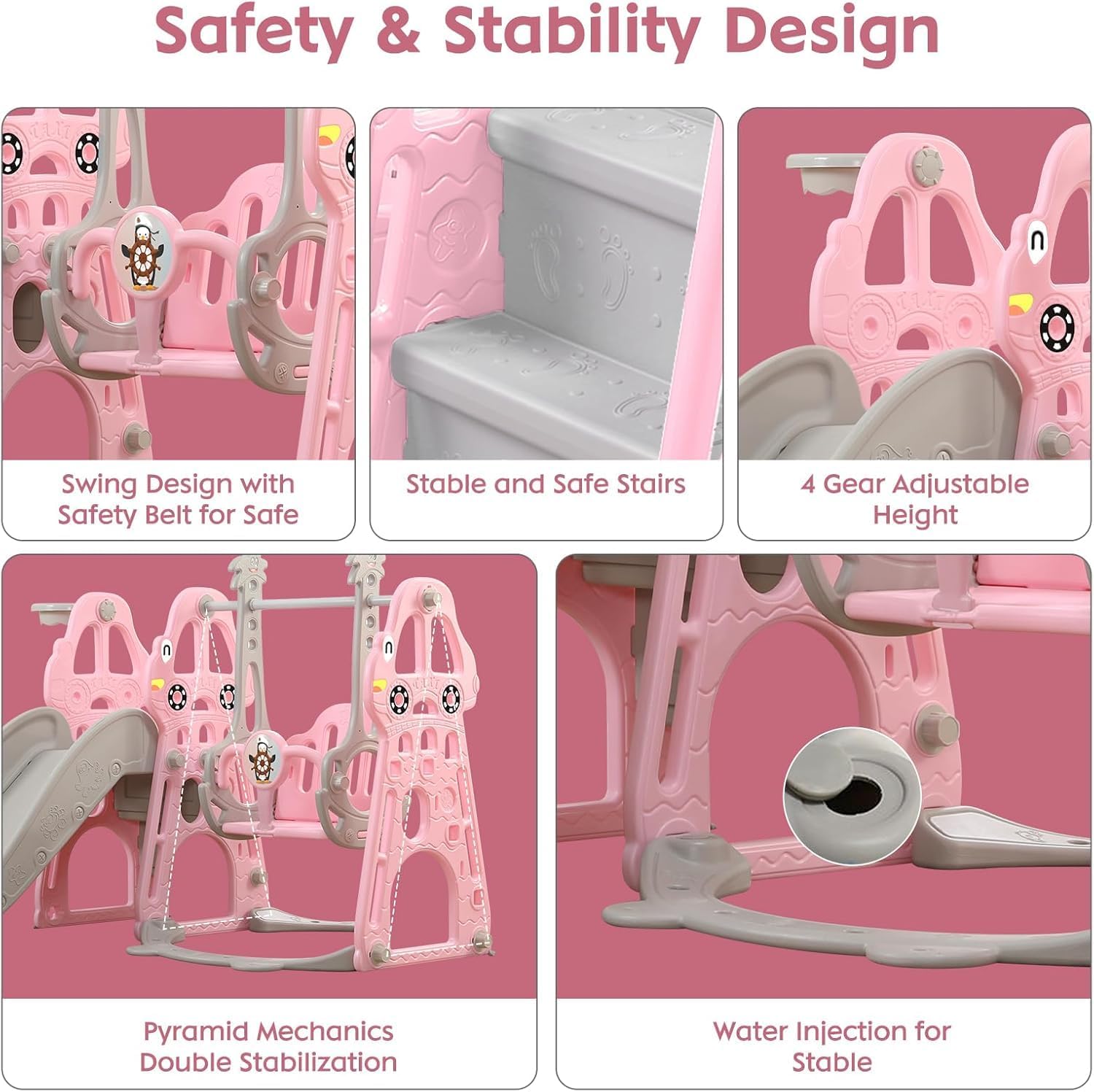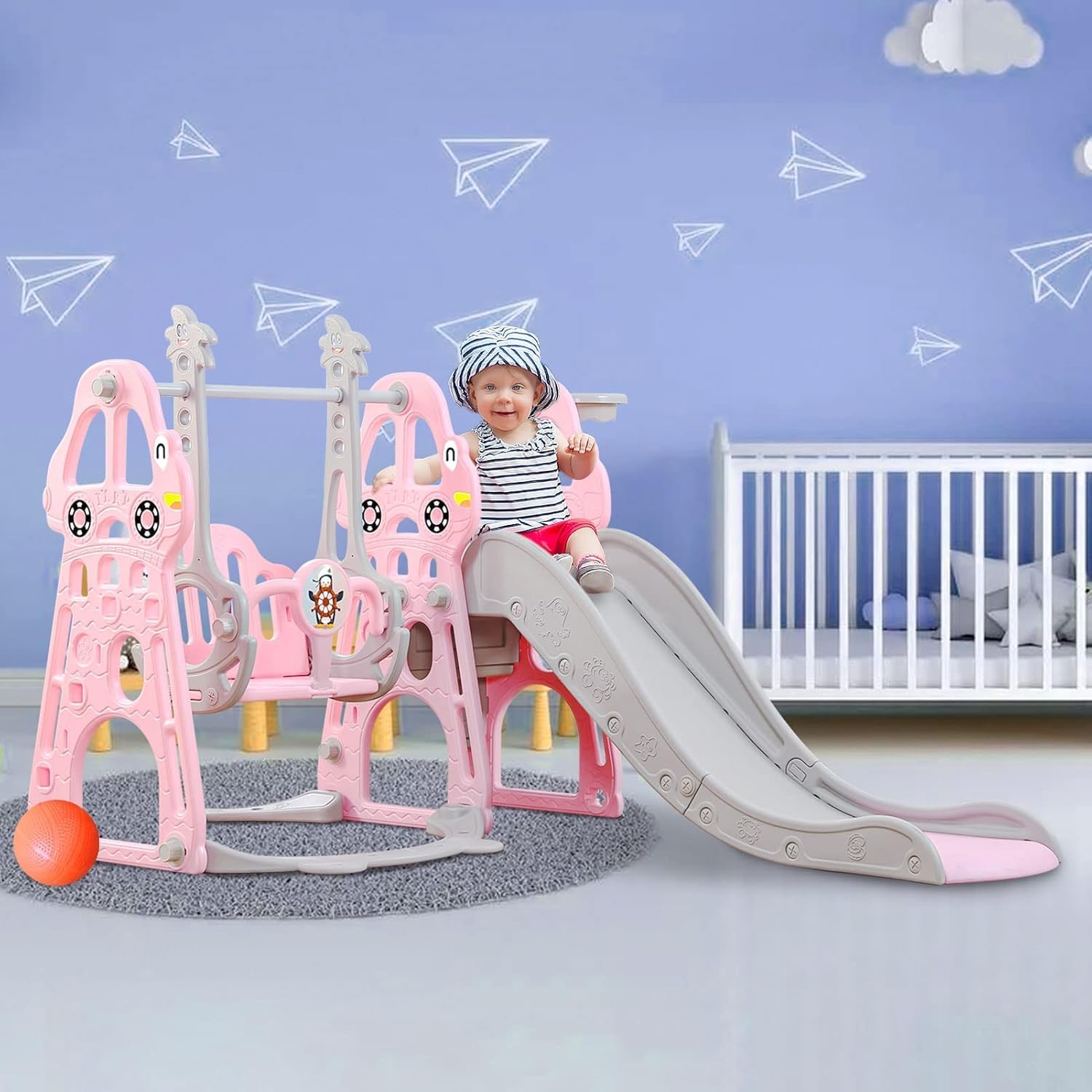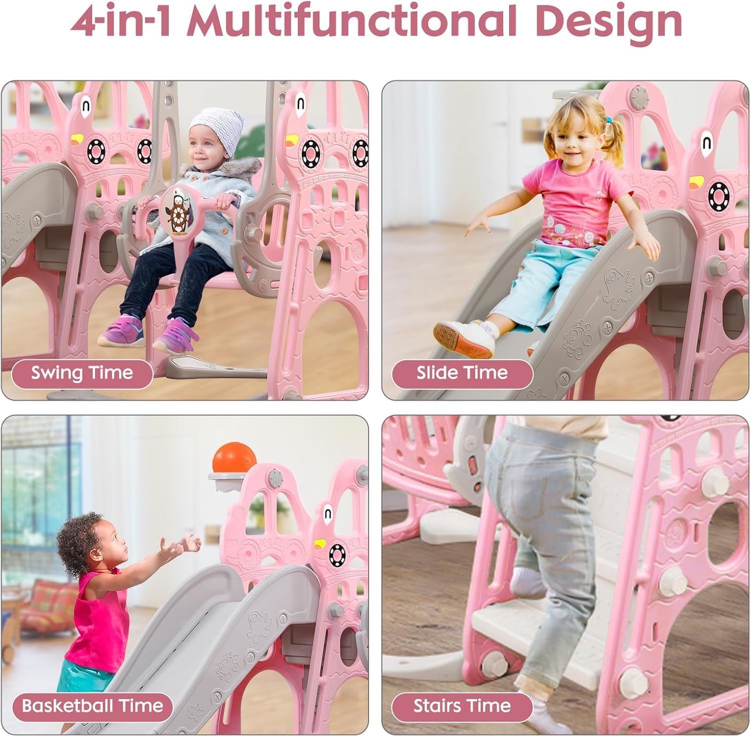 Set 4 in 1 Todder Slide & Swing Set: questo adorabile scivolo viene fornito in una vivace forma di dinosauro. Con braccioli progettati in modo intelligente, i bambini sono più sicuri quando salgono sulle scale prima di iniziare il viaggio di scorrimento. Il nostro set di gioco per bambini offre anche una varietà di attività per i bambini. È dotato di un anello da basket, gioco di arrampicata e dispositivo swing incluso per un maggiore divertimento. 【 Design del pedale anti-skid】 Il pedale ha una struttura antiscivolo che aumenta l'attrito, è esteticamente piacevole e può garantire la sicurezza dei bambini. L'estremità dello scivolo presenta una pendenza scivolosa extra lunga con un buffer che garantisce un'esperienza di scorrimento sicura e controllata. I bambini si fermeranno nell'area buffer invece di scivolare sul pavimento. Scivolo per bambini sicuro e stabile: questo set di scivoli e altalene è realizzato in HDPE di alta qualità + materiali PP, atossico, inodore e uniformemente rinforzato, rigorosamente testato e certificato per garantire stabilità e durata della rutch e dell'altalena. L'altezza dell'altalena può essere regolata per ospitare una gamma più ampia di età, e l'altalena viene fornita con uno schienale e una protezione intermedia, ringhiera protettiva ispessita e un telaio stabile. La distanza tra i pedali di 13 cm offre ai bambini un maggiore senso di sicurezza. Facile da assemblare: nessun attrezzo professionale, basta seguire le istruzioni chiare e precise, collegare ogni parte con viti piccole o grandi, quindi stringere, risparmiando tempo e fatica. Se avete domande durante il montaggio di questa pellicola, vi preghiamo di contattarci e risponderemo immediatamente al vostro messaggio entro 24 ore. Scivolo per bambini per interni ed esterni: utilizzato all'interno o nel cortile, questo set da gioco offre un parco giochi divertente e sicuro per il vostro piccolo. Molteplici possibilità di gioco: swing, scivolo, anello da basket (compreso il basket) per liberare la natura atletica dei bambini, rafforzare il loro entusiasmo per lo sport e godersi un'infanzia felice.