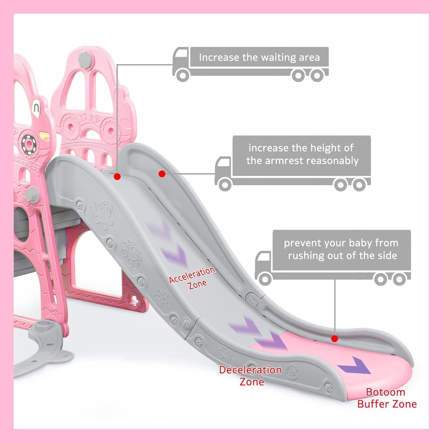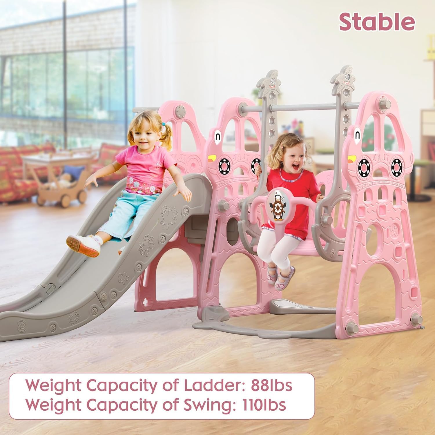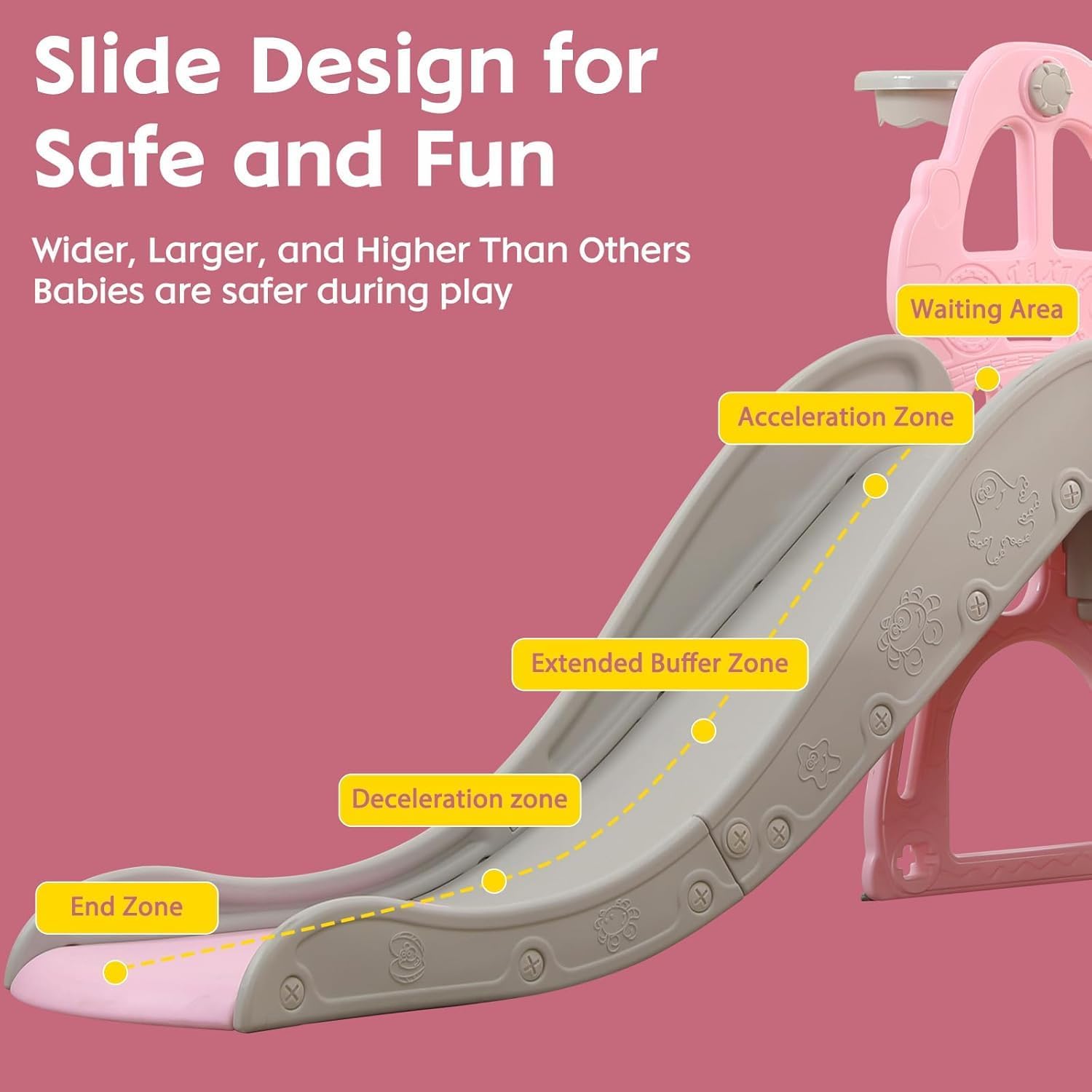 Set 4 in 1 Todder Slide & Swing Set: questo adorabile scivolo viene fornito in una vivace forma di dinosauro. Con braccioli progettati in modo intelligente, i bambini sono più sicuri quando salgono sulle scale prima di iniziare il viaggio di scorrimento. Il nostro set di gioco per bambini offre anche una varietà di attività per i bambini. È dotato di un anello da basket, gioco di arrampicata e dispositivo swing incluso per un maggiore divertimento. 【 Design del pedale anti-skid】 Il pedale ha una struttura antiscivolo che aumenta l'attrito, è esteticamente piacevole e può garantire la sicurezza dei bambini. L'estremità dello scivolo presenta una pendenza scivolosa extra lunga con un buffer che garantisce un'esperienza di scorrimento sicura e controllata. I bambini si fermeranno nell'area buffer invece di scivolare sul pavimento. Scivolo per bambini sicuro e stabile: questo set di scivoli e altalene è realizzato in HDPE di alta qualità + materiali PP, atossico, inodore e uniformemente rinforzato, rigorosamente testato e certificato per garantire stabilità e durata della rutch e dell'altalena. L'altezza dell'altalena può essere regolata per ospitare una gamma più ampia di età, e l'altalena viene fornita con uno schienale e una protezione intermedia, ringhiera protettiva ispessita e un telaio stabile. La distanza tra i pedali di 13 cm offre ai bambini un maggiore senso di sicurezza. Facile da assemblare: nessun attrezzo professionale, basta seguire le istruzioni chiare e precise, collegare ogni parte con viti piccole o grandi, quindi stringere, risparmiando tempo e fatica. Se avete domande durante il montaggio di questa pellicola, vi preghiamo di contattarci e risponderemo immediatamente al vostro messaggio entro 24 ore. Scivolo per bambini per interni ed esterni: utilizzato all'interno o nel cortile, questo set da gioco offre un parco giochi divertente e sicuro per il vostro piccolo. Molteplici possibilità di gioco: swing, scivolo, anello da basket (compreso il basket) per liberare la natura atletica dei bambini, rafforzare il loro entusiasmo per lo sport e godersi un'infanzia felice.
