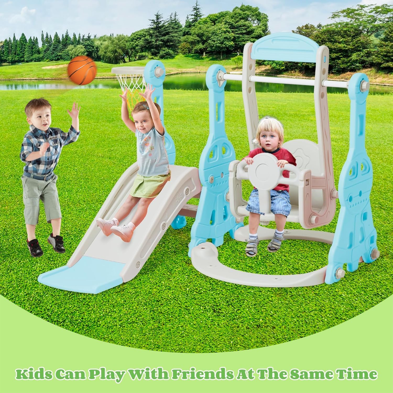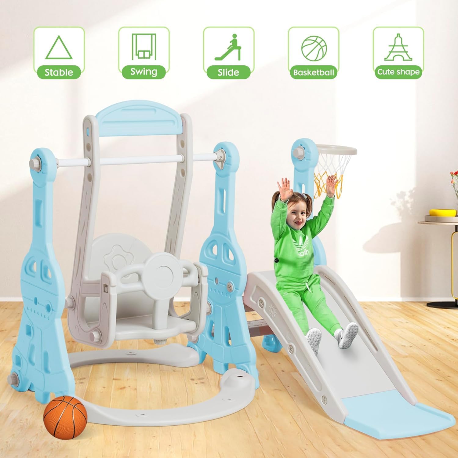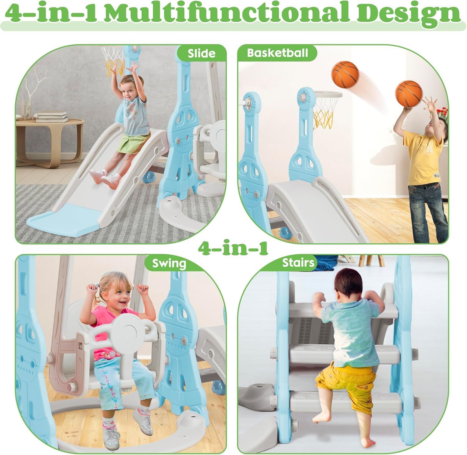 Set 4 in 1 Todder Slide & Swing Set: questo adorabile scivolo viene fornito in una vivace forma di dinosauro. Con braccioli progettati in modo intelligente, i bambini sono più sicuri quando salgono sulle scale prima di iniziare il viaggio di scorrimento. Il nostro set di gioco per bambini offre anche una varietà di attività per i bambini. È dotato di un anello da basket, gioco di arrampicata e dispositivo swing incluso per un maggiore divertimento. 【 Design del pedale anti-skid】 Il pedale ha una struttura antiscivolo che aumenta l'attrito, è esteticamente piacevole e può garantire la sicurezza dei bambini. L'estremità dello scivolo presenta una pendenza scivolosa extra lunga con un buffer che garantisce un'esperienza di scorrimento sicura e controllata. I bambini si fermeranno nell'area buffer invece di scivolare sul pavimento. Scivolo per bambini sicuro e stabile: questo set di scivoli e altalene è realizzato in HDPE di alta qualità + materiali PP, atossico, inodore e uniformemente rinforzato, rigorosamente testato e certificato per garantire stabilità e durata della rutch e dell'altalena. L'altezza dell'altalena può essere regolata per ospitare una gamma più ampia di età, e l'altalena viene fornita con uno schienale e una protezione intermedia, ringhiera protettiva ispessita e un telaio stabile. La distanza tra i pedali di 13 cm offre ai bambini un maggiore senso di sicurezza. Facile da assemblare: nessun attrezzo professionale, basta seguire le istruzioni chiare e precise, collegare ogni parte con viti piccole o grandi, quindi stringere, risparmiando tempo e fatica. Se avete domande durante il montaggio di questa pellicola, vi preghiamo di contattarci e risponderemo immediatamente al vostro messaggio entro 24 ore. Scivolo per bambini per interni ed esterni: utilizzato all'interno o nel cortile, questo set da gioco offre un parco giochi divertente e sicuro per il vostro piccolo. Molteplici possibilità di gioco: swing, scivolo, anello da basket (compreso il basket) per liberare la natura atletica dei bambini, rafforzare il loro entusiasmo per lo sport e godersi un'infanzia felice.
