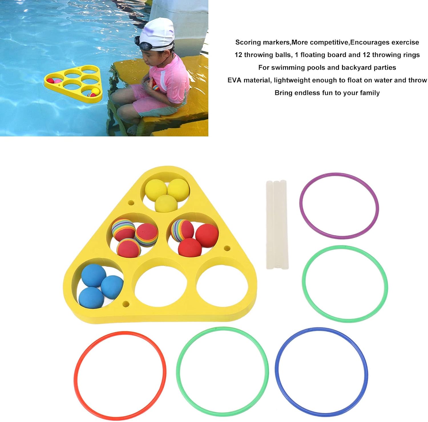 COMPAGNI DI PISCINA: i divertenti giochi di biliardo sono giochi giocattolo ideali per le piscine di famiglia, questo set include 12 palline da lancio (colore casuale) e 1 tavola galleggiante e 12 anelli da lancio (colore casuale) ed è un grande giocattolo galleggiante per piscine e feste in giardino PORTATILE PER LE VACANZE: i giocattoli per sport acquatici di squadra hanno una confezione leggera e sono facili da trasportare, adatti per l'estate e le vacanze, esplora più divertimento con il giocattolo estivo Oggetti di scena per il gioco in piscina: progettato con elementi di gioco da lancio, questo gioco galleggiante ha anche marcatori di punteggio per rendere più competitivo il tuo gioco in piscina, questo è un grande gioco in piscina che incoraggia l'esercizio PER TUTTE LE ETÀ: Questo non è solo un gioco divertente per bambini, ideale anche per tutta la famiglia, e un ottimo accessorio per giochi di squadra, il design preilluminato a triangolo o schiuma rotonda lo rende facile da trasportare e giocare MATERIALE EVA DUREVOLE: la schiuma galleggiante in materiale EVA è abbastanza leggera da galleggiare sull'acqua e lanciarla, il materiale di grandi dimensioni mantiene in condizioni i giocattoli galleggianti della piscina e porta un divertimento senza fine alla tua famiglia