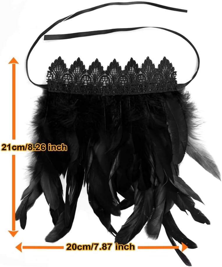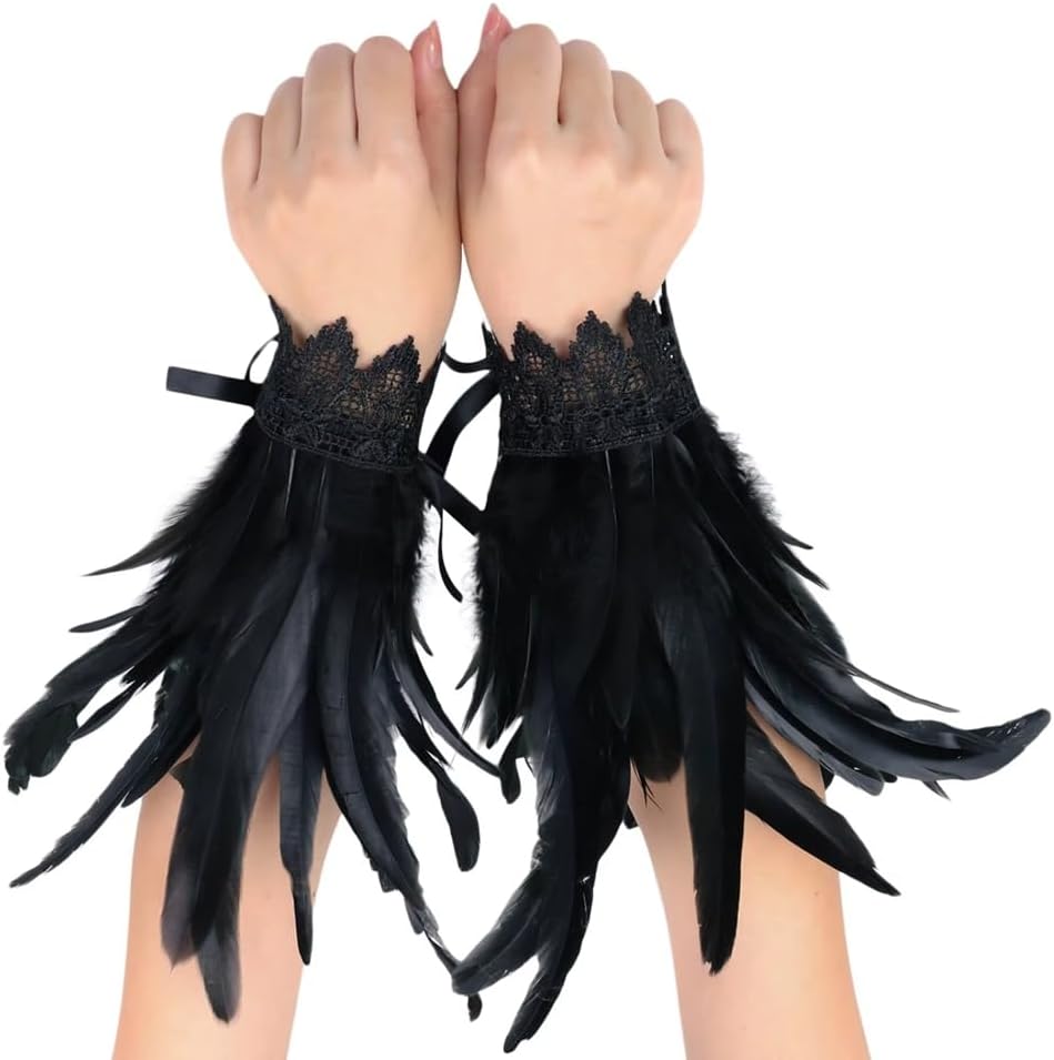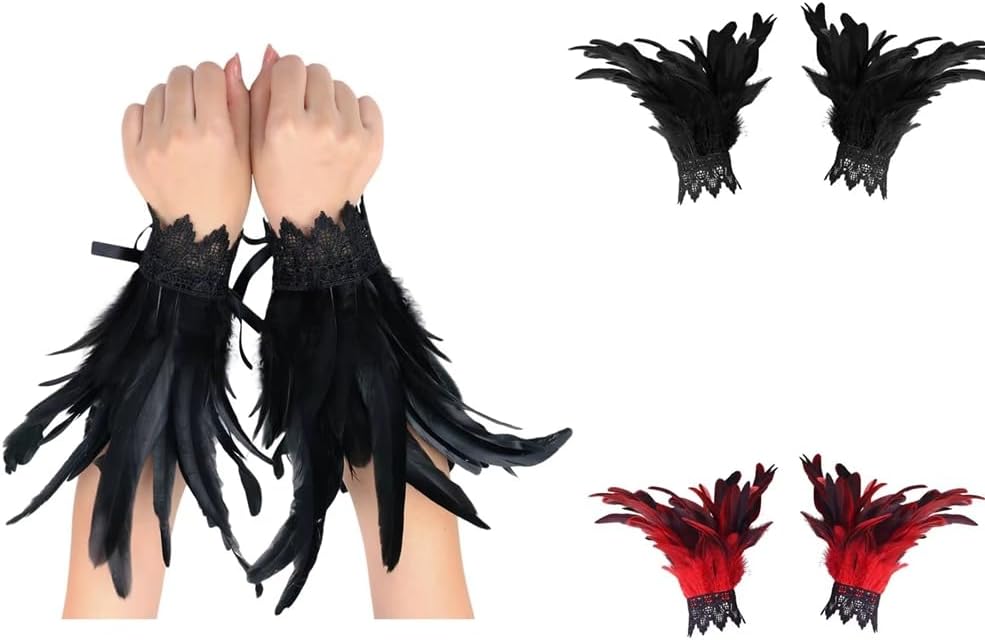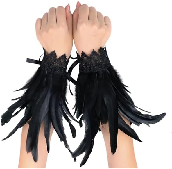 Dimensione: universale. Larghezza: 17 cm. Lunghezza : 18 cm. I polsini sono realizzati con i seguenti materiali: piume, pizzo e nastro. Un'ottima aggiunta a un costume storico.