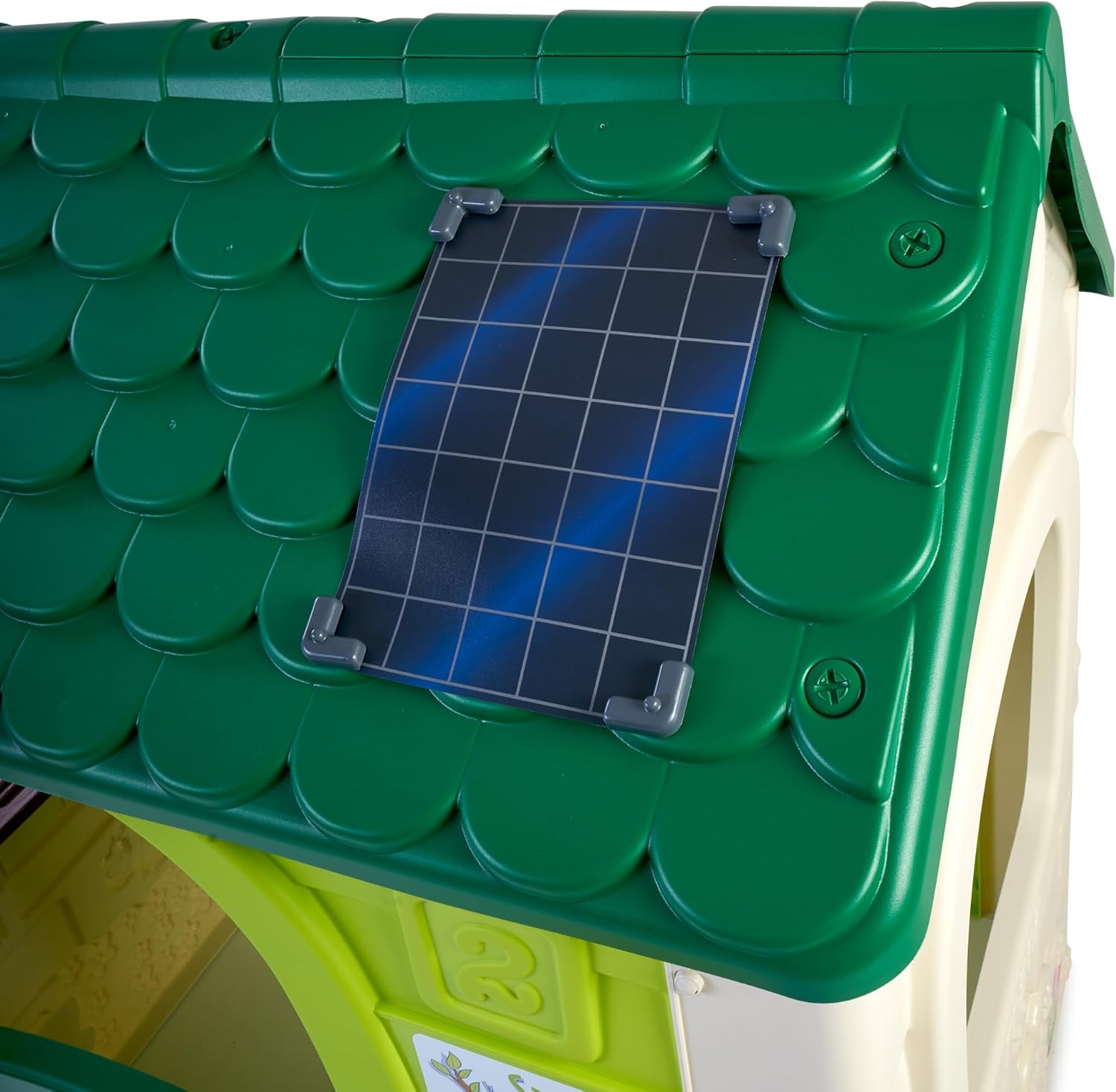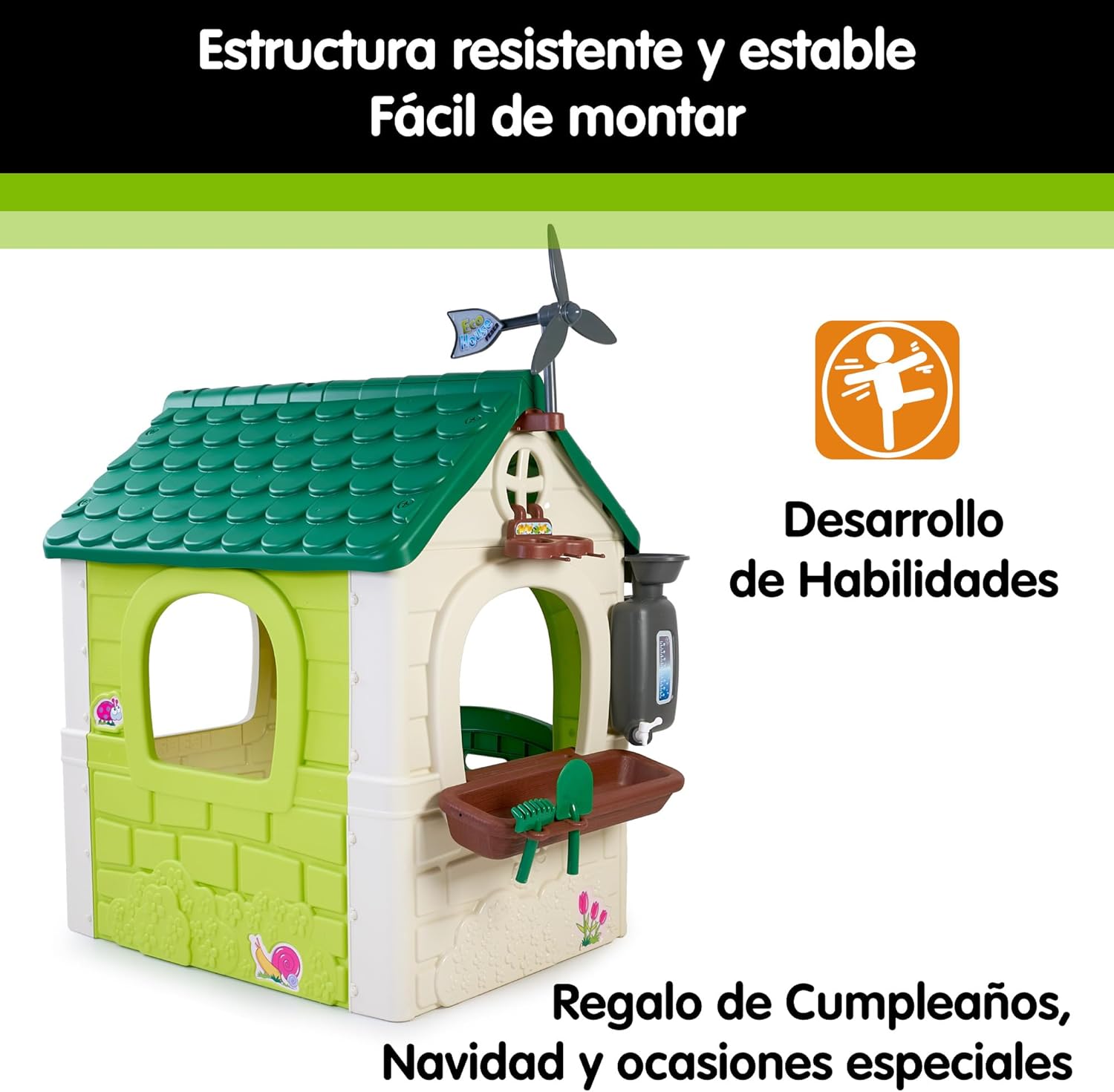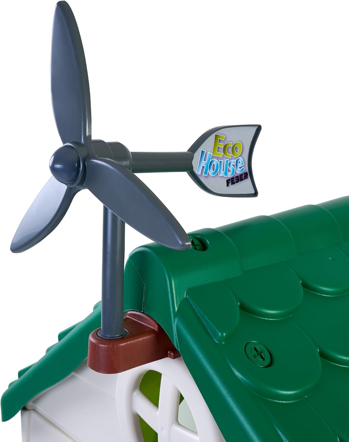 FEBER Eco House è una casa dei giochi per bambini da interno e da esterno, per giocare da soli, in famiglia o con gli amici, grazie al suo interno spazioso Una casetta che include attività di apprendimento sulla natura e l'ecologia; il giocattolo include 2 cestini per il riciclaggio, una fioriera urbana e attrezzi per le piante, un contenitore per l'acqua piovana, un mulino a vento, un finto pannello solare e una mangiatoia per uccelli La casetta ha una porta a soffietto e 4 finestre aperte, è verde e bianca; colori vivaci e resistenti alla luce del sole, agli sbalzi di temperatura e a fenomeni temporanei come la pioggia struttura robusta per la sicurezza dei bambini; per bambini dai 2 ai 6 anni il montaggio di questa casetta da giardino è semplice; il tempo approssimativo con i materiali, gli attrezzi e le istruzioni incluse è di 30 minuti