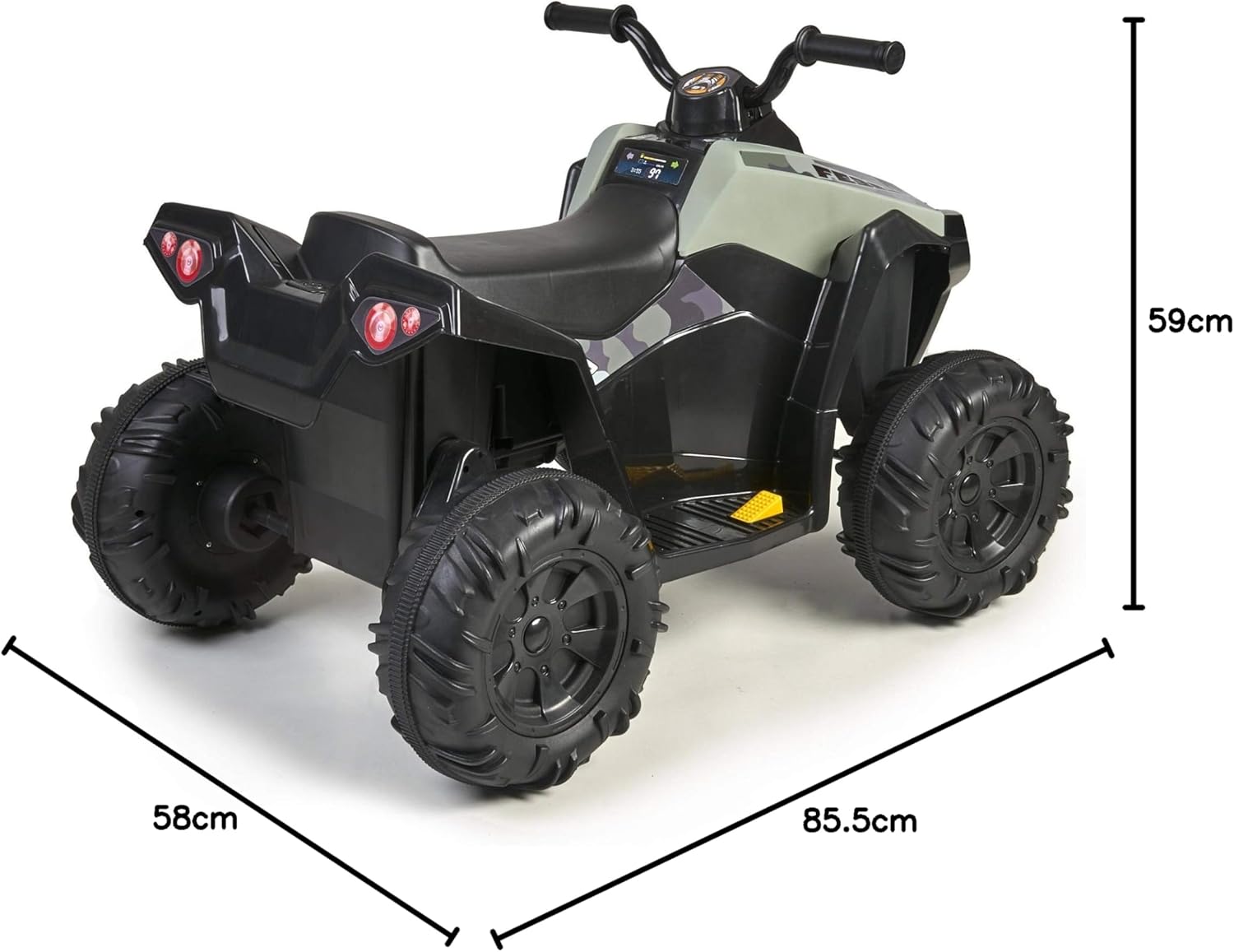 Quad 12V Boxer è dotato di marcia avanti, retromarcia e freno a pedale Le sue robuste ruote aiutano a migliorare la stabilità e raggiunge fino a 5 km/h Per ragazzi e ragazze da 3 a 5 anni peso massimo 30 kg batteria consigliata per veicolo elettrico 12V per ravvivarsi! Batteria da 12 V e caricabatterie inclusi. E anche 45 minuti di gioco non-stop! Come prodotto 85 5 (L) x 58 (L) x 59 (A) cm Peso del prodotto 10 3Kg