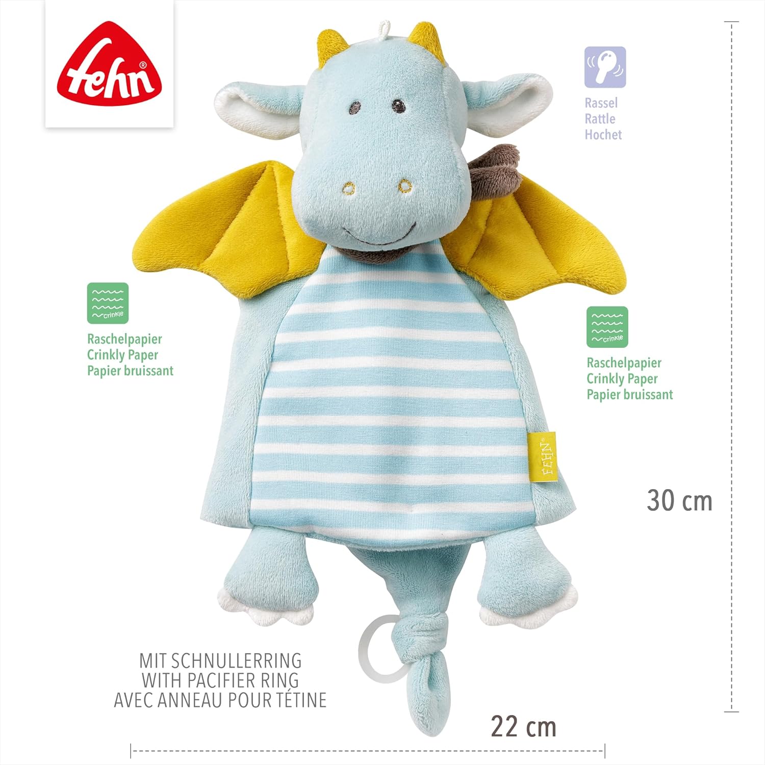 Soffici ore di carezze con la copertina per le coccole della Fehn: La piccola coperta con la simpatica testa di drago invita a sognare e scoprire, per piccoli esploratori stanchi La forma speciale, un sonaglio nascosto e l'eccitante carta frusciante supportano i primi esercizi di tocco e presa, il giocattolo adatte per esplorare e imparare da soli Il pratico anello di fissaggio lo rende facile da appendere ovunque, così tutto rimane al suo posto, anche durante le esperienze particolarmente avventurose La copertina è fatta di morbido velluto, e jersey e deve essere lavata a 30°C; dopo il lavaggio, lasciare asciugare completamente all'aria Contenuto della confezione. 1 Coperta de luxe Drago con anello per il ciuccio della collezione Little Castle; il perfetto supporto per dormire, per fare le coccole e da abbracciare; dimensioni: 30 cm / articolo numero: 065077