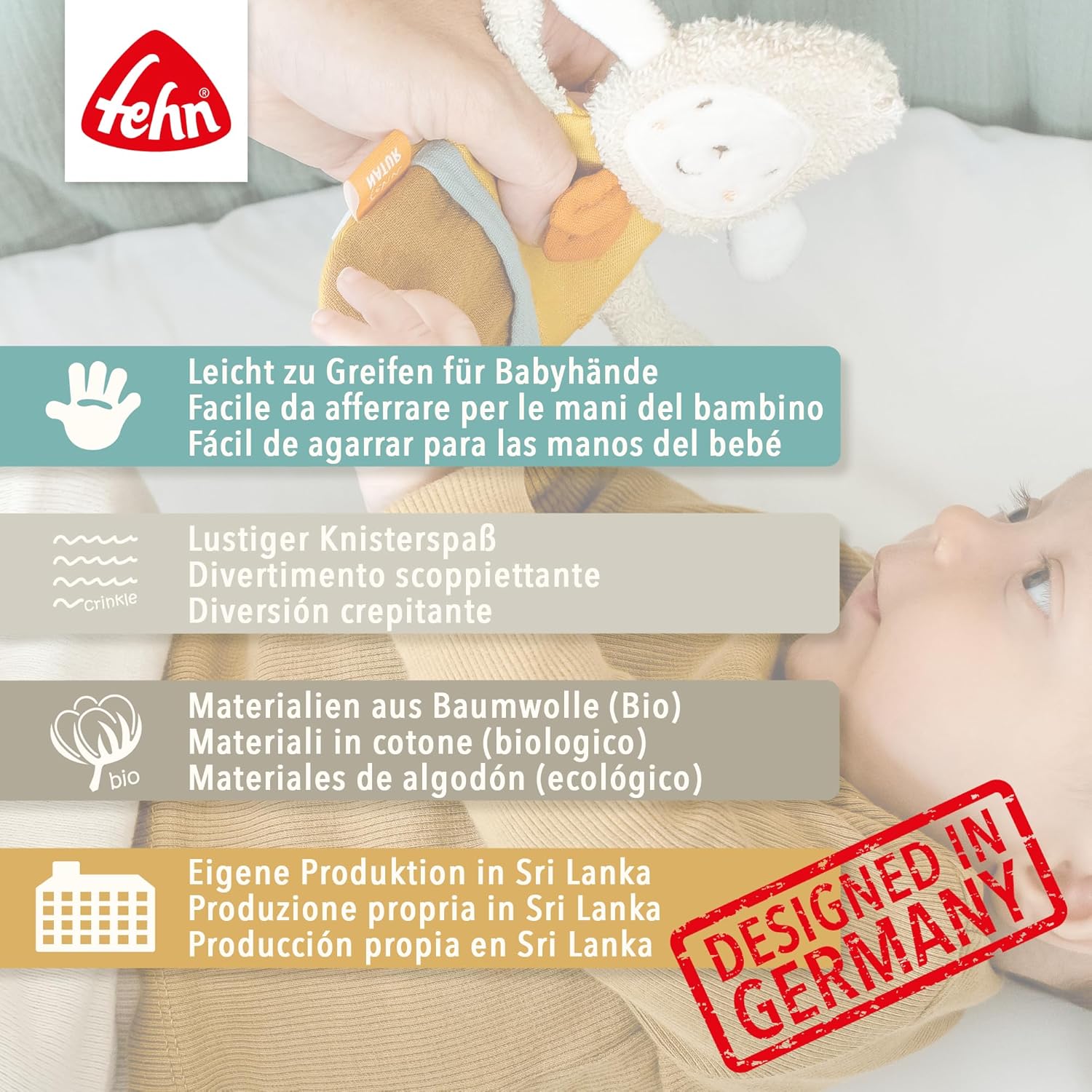 Giocattolo per bambini – Questo morbido giocattolo scoppiettante di Fehn è il giocattolo che nessun bambino mette più di mano: la pecora invita a scoprire, sentire e giocare senza annoiarsi Pecore accogliente: la forma incantevole della morbida pecora in tessuto invita a succhiare e affascina con i materiali esterni di alta qualità jersey, spugna, mussola e Nicki in cotone biologico Compagno pratico – I piccoli esploratori ameranno la pecora coccolosa e, grazie alle sue dimensioni maneggevoli, vorranno portarla ovunque, sia a casa, in viaggio, nell'ovetto o in auto Imparare giocosamente: il peluche stimola giocosamente l'udito, la presa e il senso del tatto e le capacità motorie del bambino. È quindi un regalo ideale per nascita, battesimo o compleanno Contenuto della confezione: 1 x pecora crepitosa con carta raschel/con cotone biologico (kbA) / dimensioni circa 17 cm/30 °C delicati/Art. n. 048155