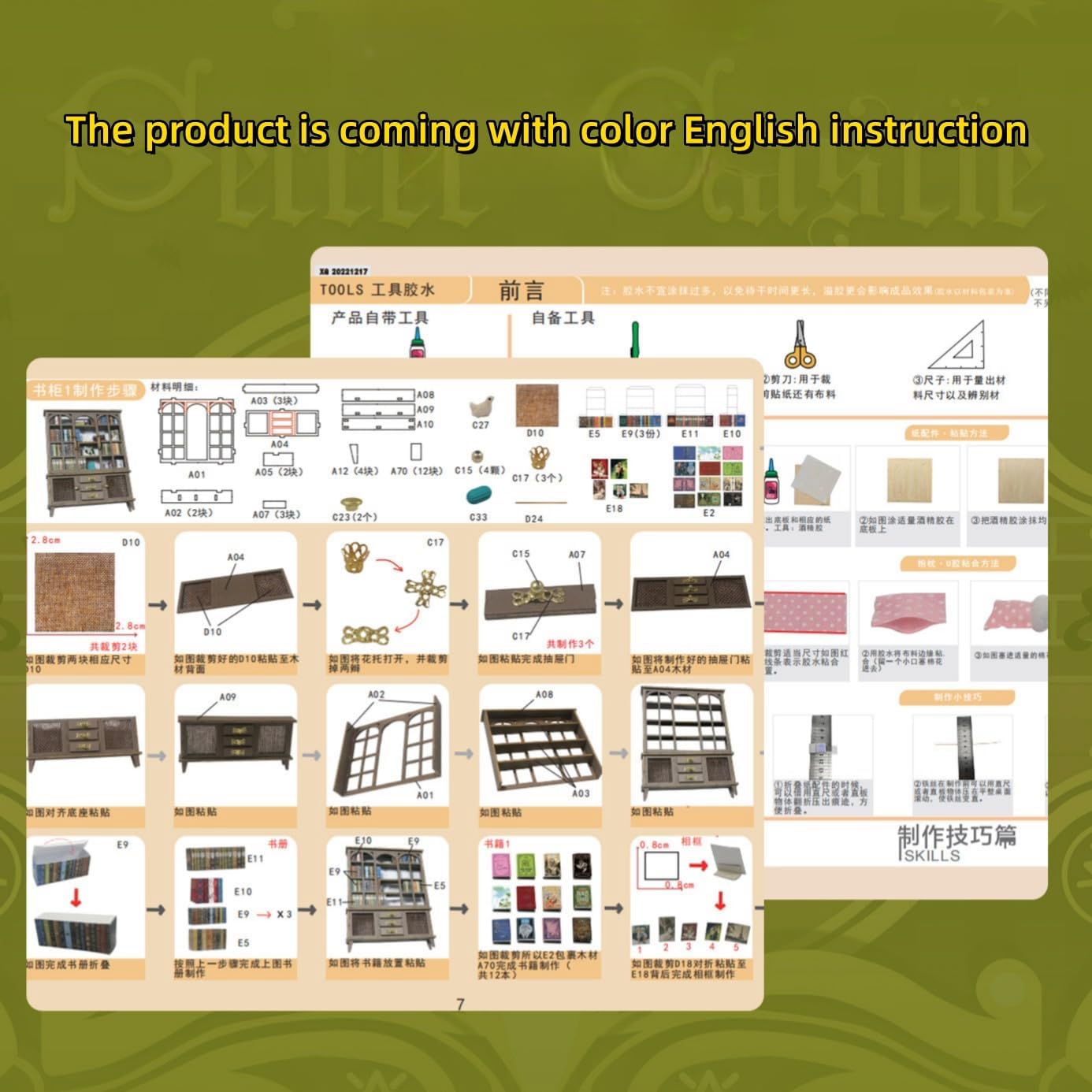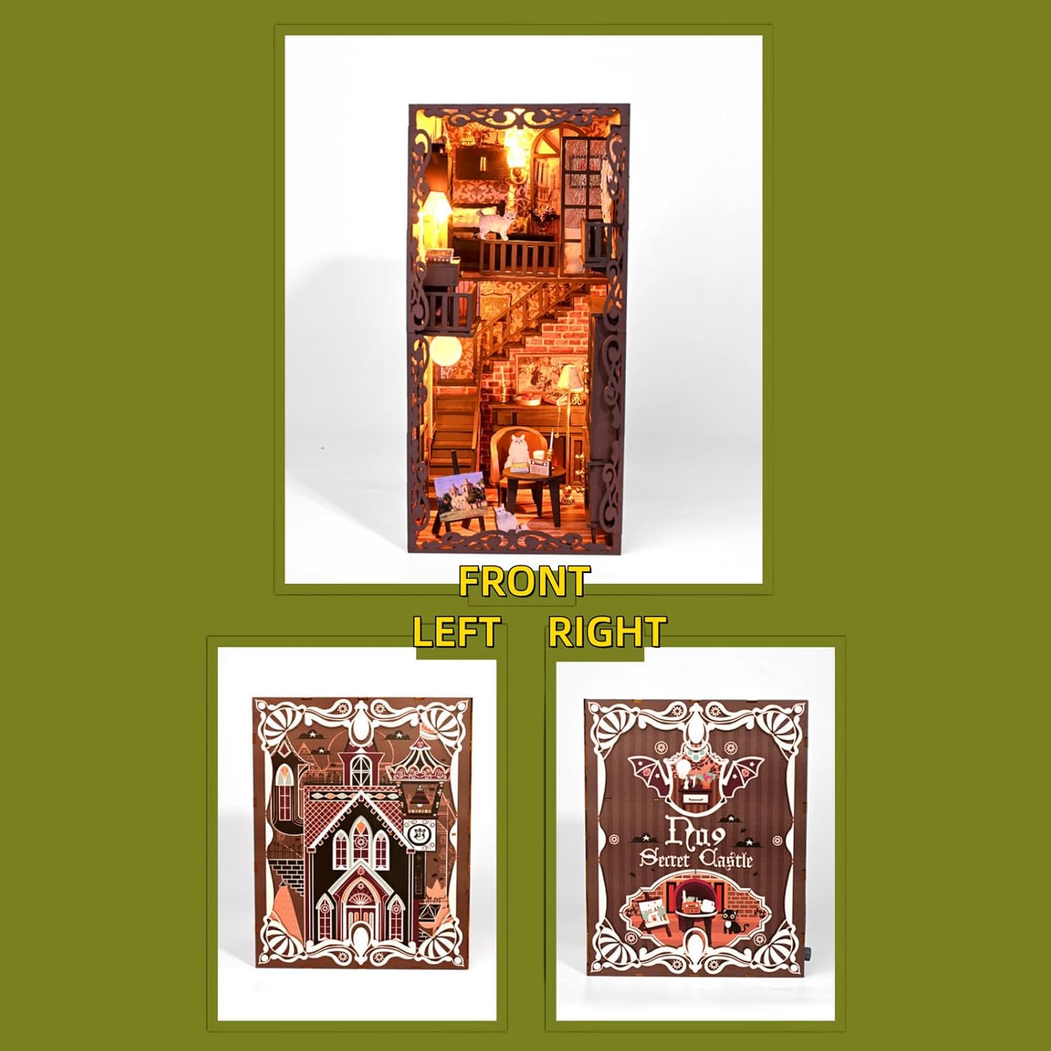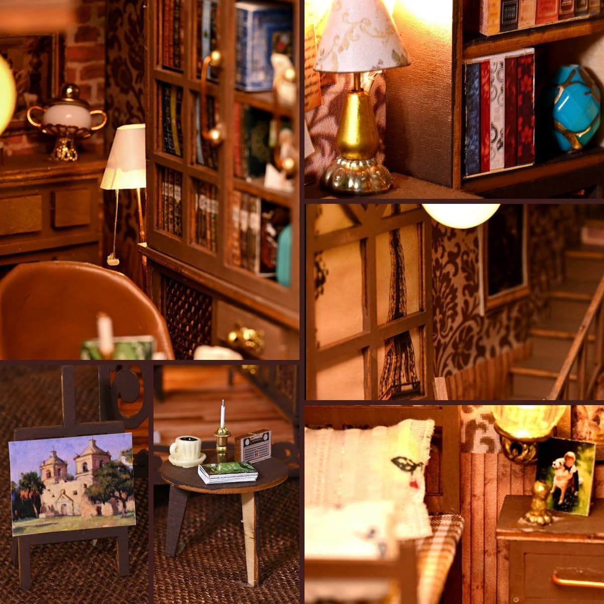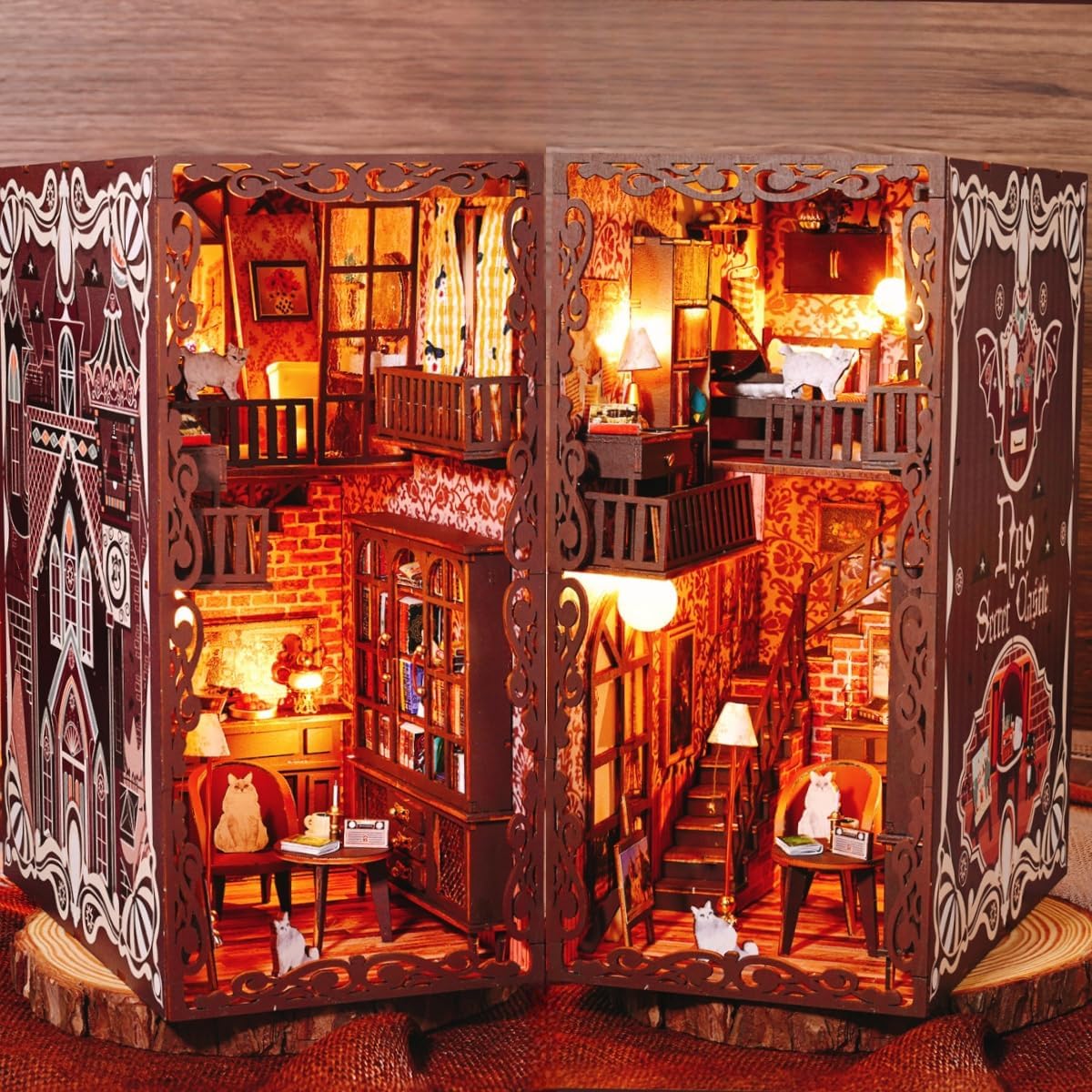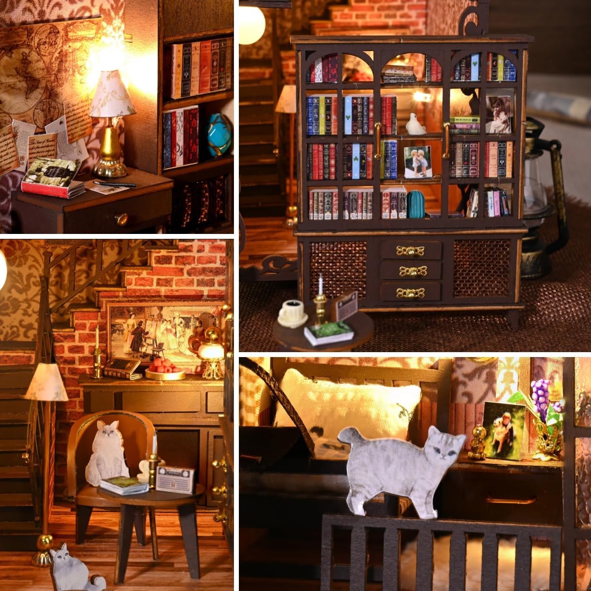 Questo è un kit fai-da-te per bambini dai 14 anni in su. Il kit deve essere assemblato; l'ornamento finito non è incluso. La luce ambientale a LED integrata fornisce un effetto luminoso caldo e morbido e crea un'atmosfera accogliente e invitante in casa. Realizzato in legno di alta qualità, presenta una struttura robusta e dettagli squisiti, aggiungendo un fascino unico alle decorazioni di Halloween. Il design dello slot rende il montaggio facile e conveniente. Il kit contiene gli strumenti necessari; Tutto ciò che serve per il montaggio è colla e batterie. Design in stile retrò ricco di dettagli: personaggi misteriosi sono abbinati a elementi come gatti, tazze di caffè e candele. Gli scaffali sono pieni di libri e il secondo piano dispone anche di un letto in legno e di cornici per quadri, creando una scena di vita unica per gli amanti dei libri.