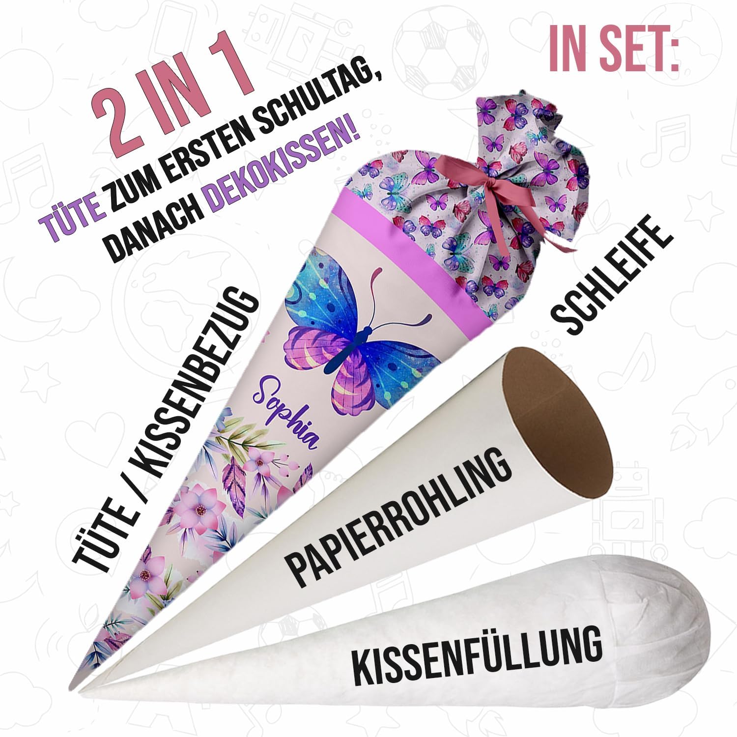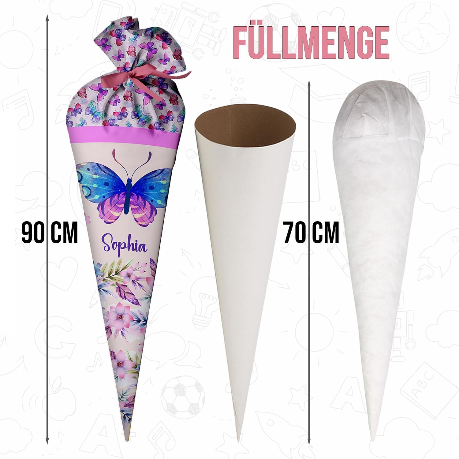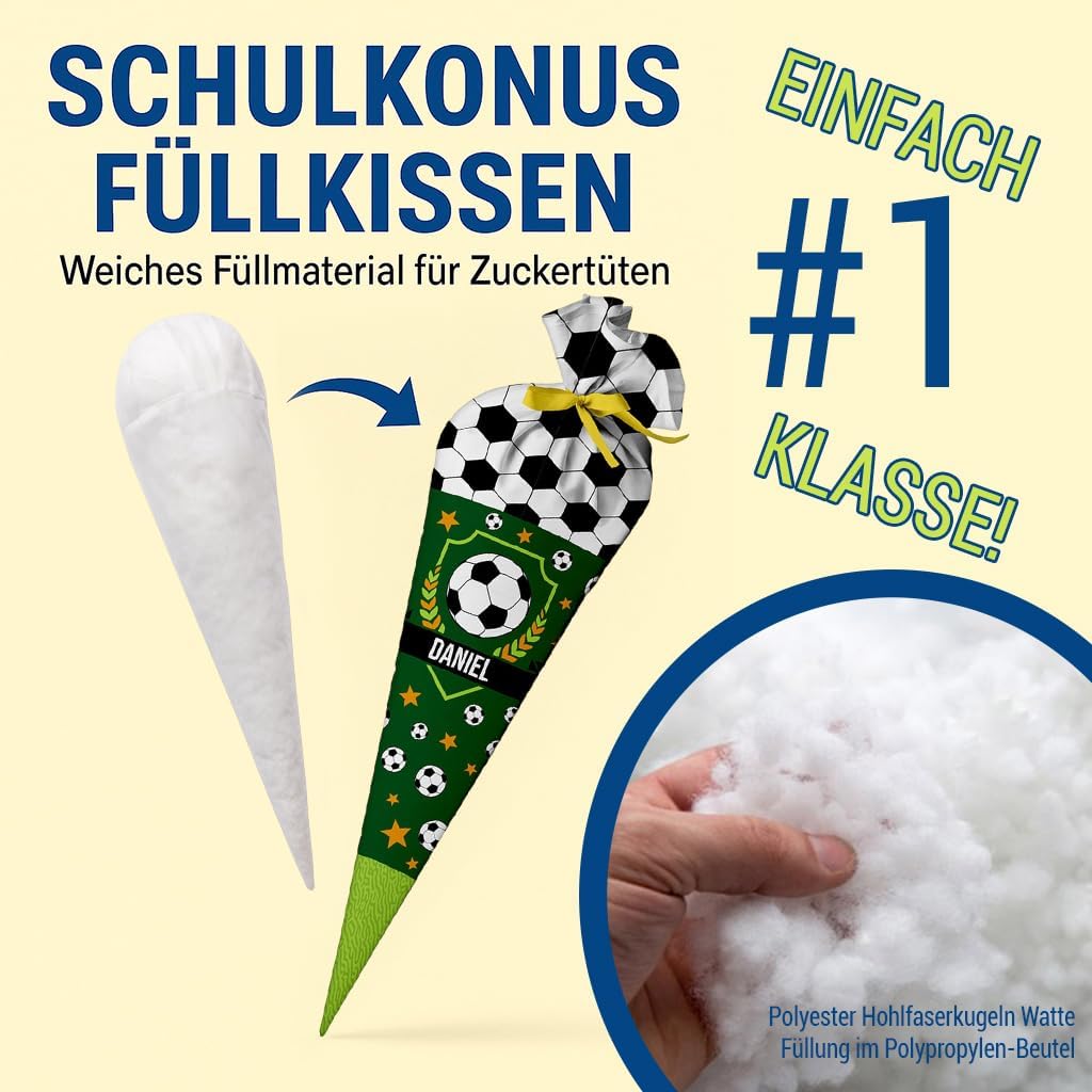 Il cono della scuola è realizzato in tessuto 100% poliestere. All'interno è presente un cartone tondo e un'imbottitura a sfera in fibra cava di poliestere removibile. Il tuo bambino potrà poi utilizzare la borsa come cuscino! Rimetti semplicemente le palline di fibra cava, fai un fiocco e il gioco è fatto. La borsa ha 70 cm da riempire (questa è anche la dimensione del cartoncino) + tessuto in alto che si può annodare con un fiocco. Il cinturino fa parte del kit. Il colore dell'arco verrà inviato a caso. Il sacchetto di caramelle è personalizzato con il nome del bambino. Basta fare clic su "Personalizza ora", inserire il nome e aggiungere al carrello! Nel nostro negozio troverai gli accessori scolastici adatti per l'inizio della scuola del tuo bambino, ad es. valigette, borse sportive e molto altro.