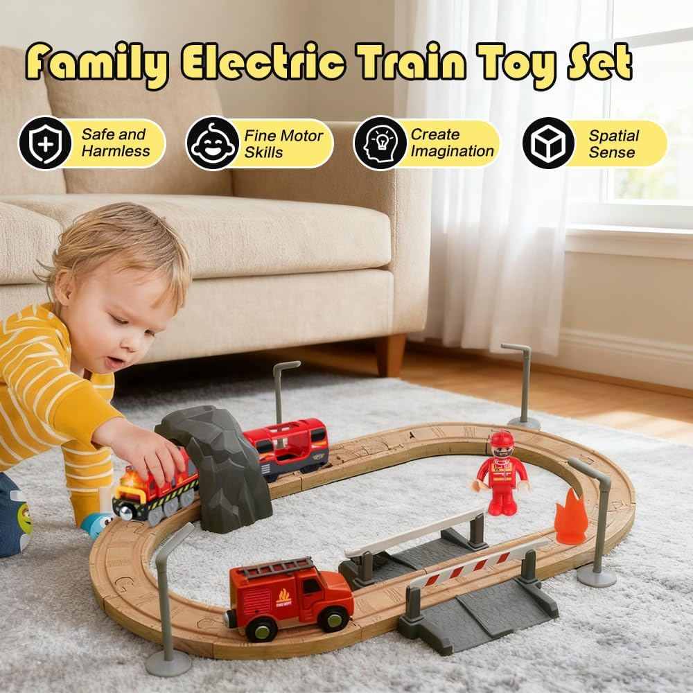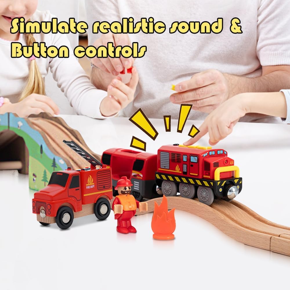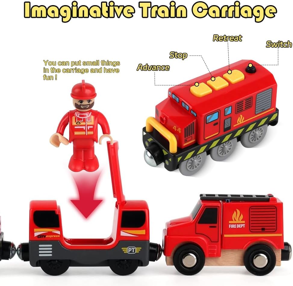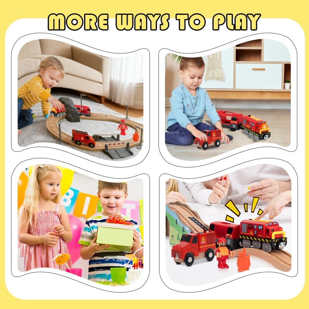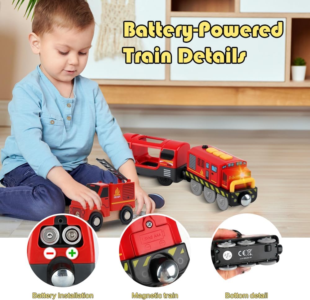 Set da gioco elettrico per bambini: l'estintore dei vigili del fuoco è composto da 3 carrelli. La combinazione realistica di modello di auto e colori vivaci lo rendono il giocattolo perfetto per gli appassionati dei vigili del fuoco. Locomotiva a batteria: il treno in legno è dotato di 2 batterie AAA e può andare avanti, fermarsi e tornare indietro (il prodotto non contiene batterie). Quando il treno viene avviato e si mette in movimento, i carri fanno un rumore. Compatibilità: il treno in legno può funzionare nella ferrovia universale in legno. Compatibile con altri grandi set di treni di marca. La locomotiva elettrica e il carrello sono collegati magneticamente. Materiale sicuro: l'estintore dei vigili del fuoco è realizzato in plastica resistente e sicura per i bambini, può entrare in contatto con altri veicoli simili con i giunti magnetici. La bassa forza magnetica è sicura per i bambini. Regalo perfetto per i bambini: sia come regalo di compleanno o come regalo per Natale, Capodanno o altre festività speciali, il treno in legno porterà ai bambini una gioia infinita e sorprese.