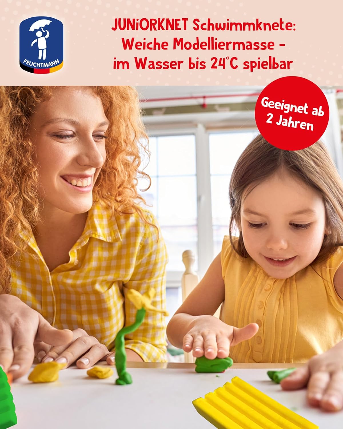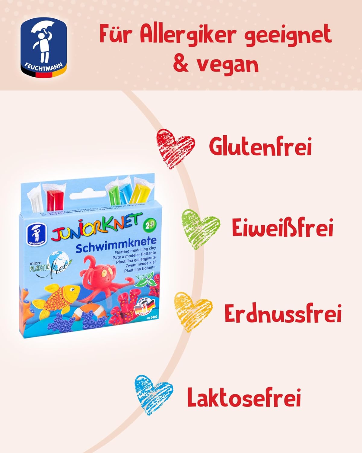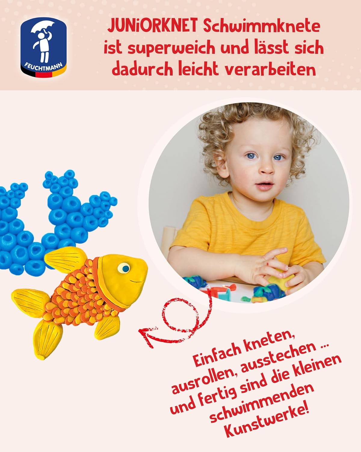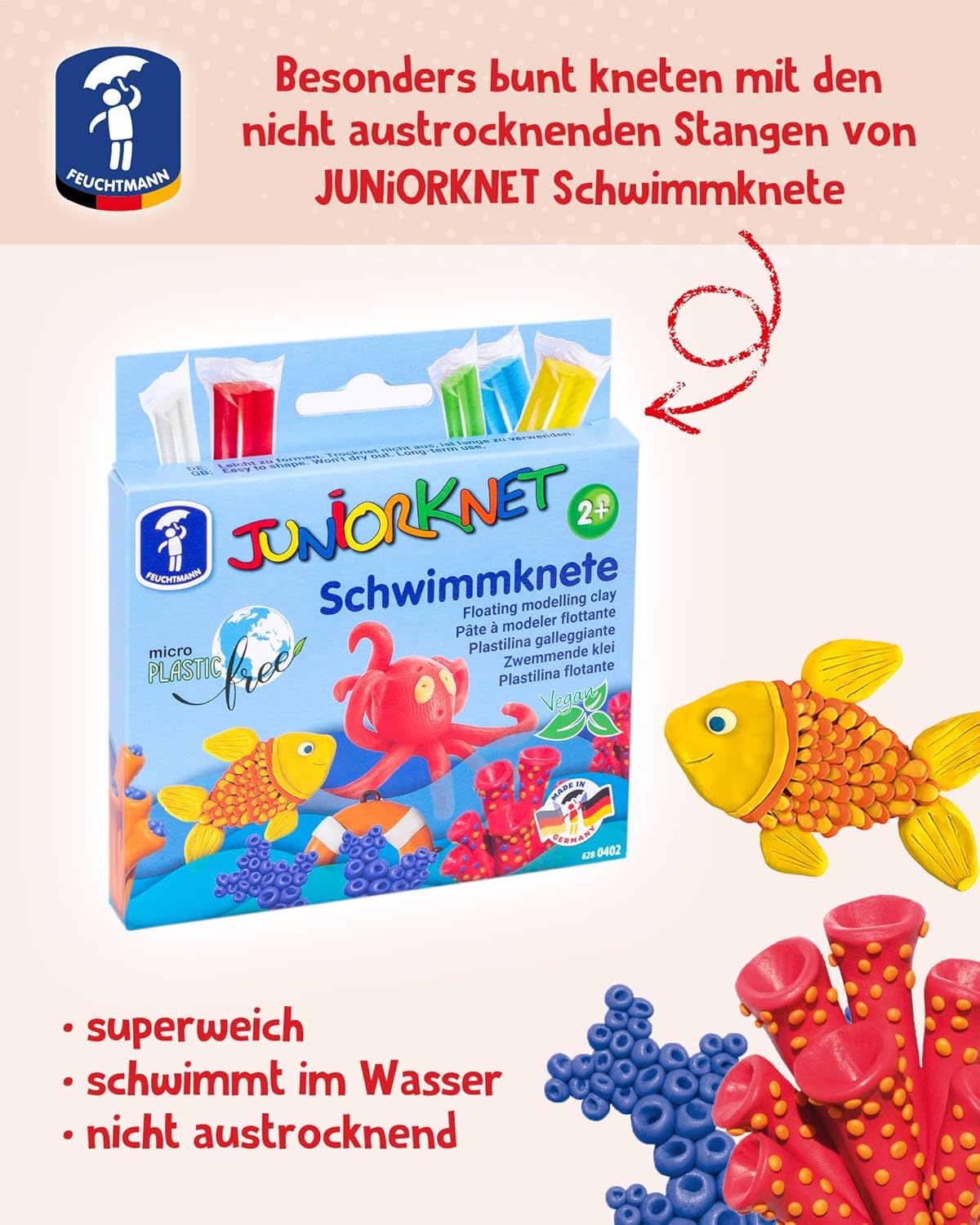 Pasta da modellare Juniorknet per bambini dai 2 anni in su L'impasto è incluso nei colori bianco, verde, giallo, blu e rosso Con creatività e tanto divertimento si creano tanti personaggi diversi L'impasto è vegano e privo di microplastica Produzione tedesca di qualità