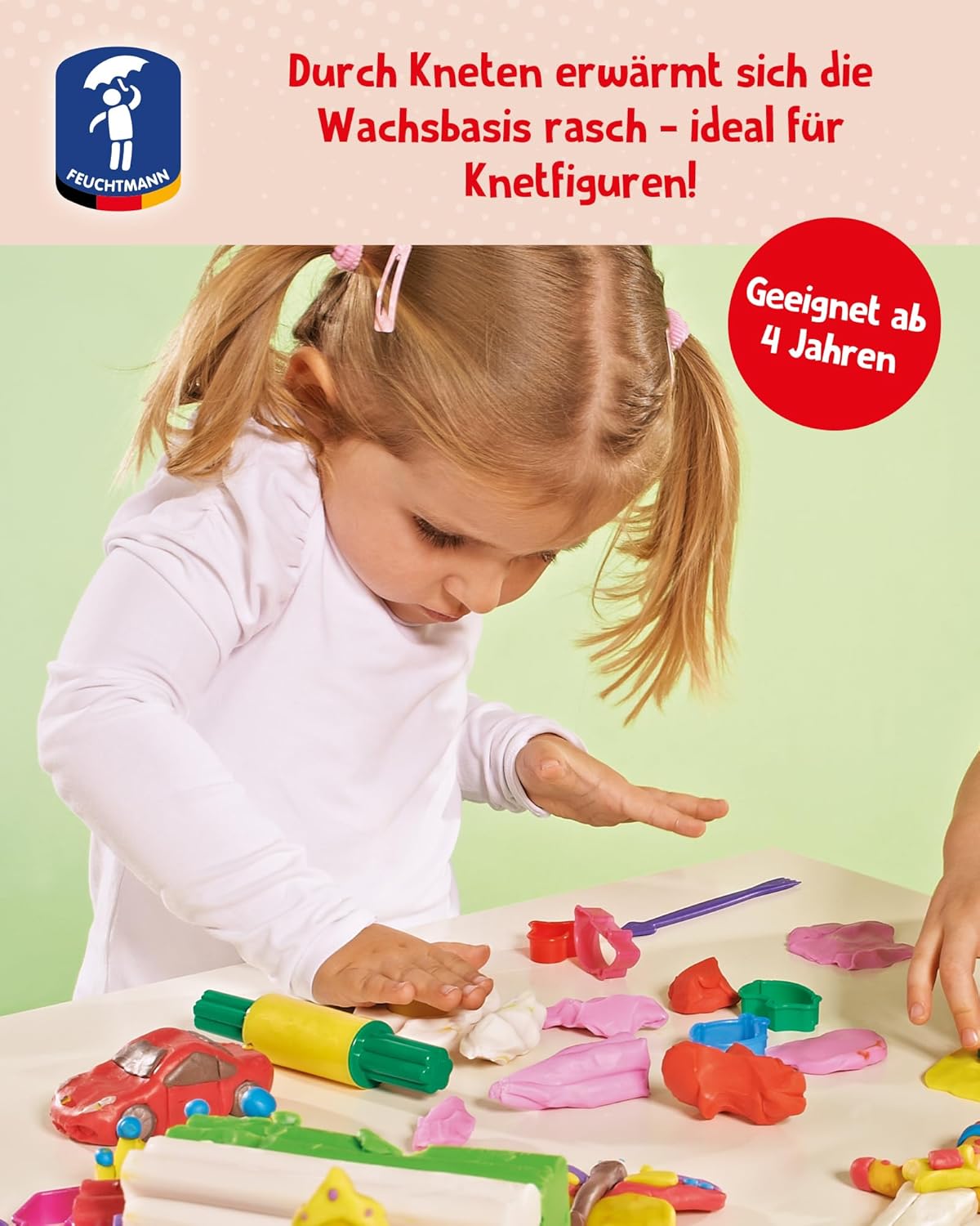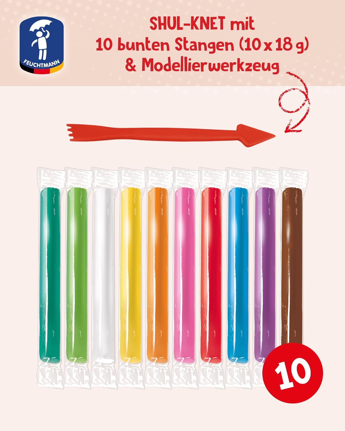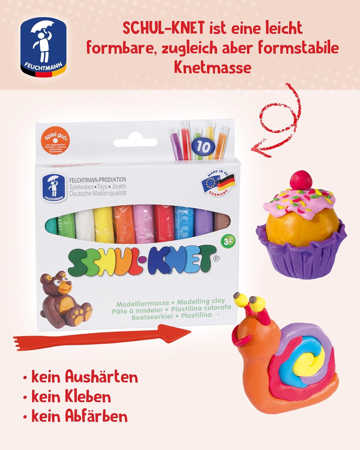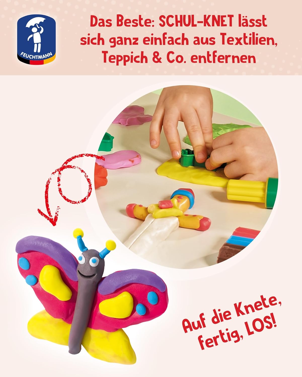 CLASSICO: Feuchtmann SCHUL-KNET è una plastilina facilmente modellabile e dimensionalmente stabile e con la sua ricetta collaudata è da 40 anni un classico nelle scuole e nelle camerette dei bambini. Non indurisce, non appiccica e non si sfrega! CREATIVO: Impastando, la base di cera di Feuchtmann SCHUL-KNET si riscalda in brevissimo tempo e consente le figure di argilla più sorprendenti. I colori espressivi e lo strumento di modellazione incluso garantiscono ancora più creatività ai bambini! SICURO: Feuchtmann SCHUL-KNET è realizzato con le migliori materie prime in Germania e soddisfa i più alti standard di qualità. PULITO: SCHUL-KNET non solo può essere lavorato in modo pulito ma può anche essere facilmente rimosso da tessuti, tappeti, ecc.! SICURO: l'impasto vegano SCHUL-KNET è privo di glutine, proteine, arachidi e lattosio! Quindi assolutamente sicuro per chi soffre di allergie! Adatto dai 4 anni in su.