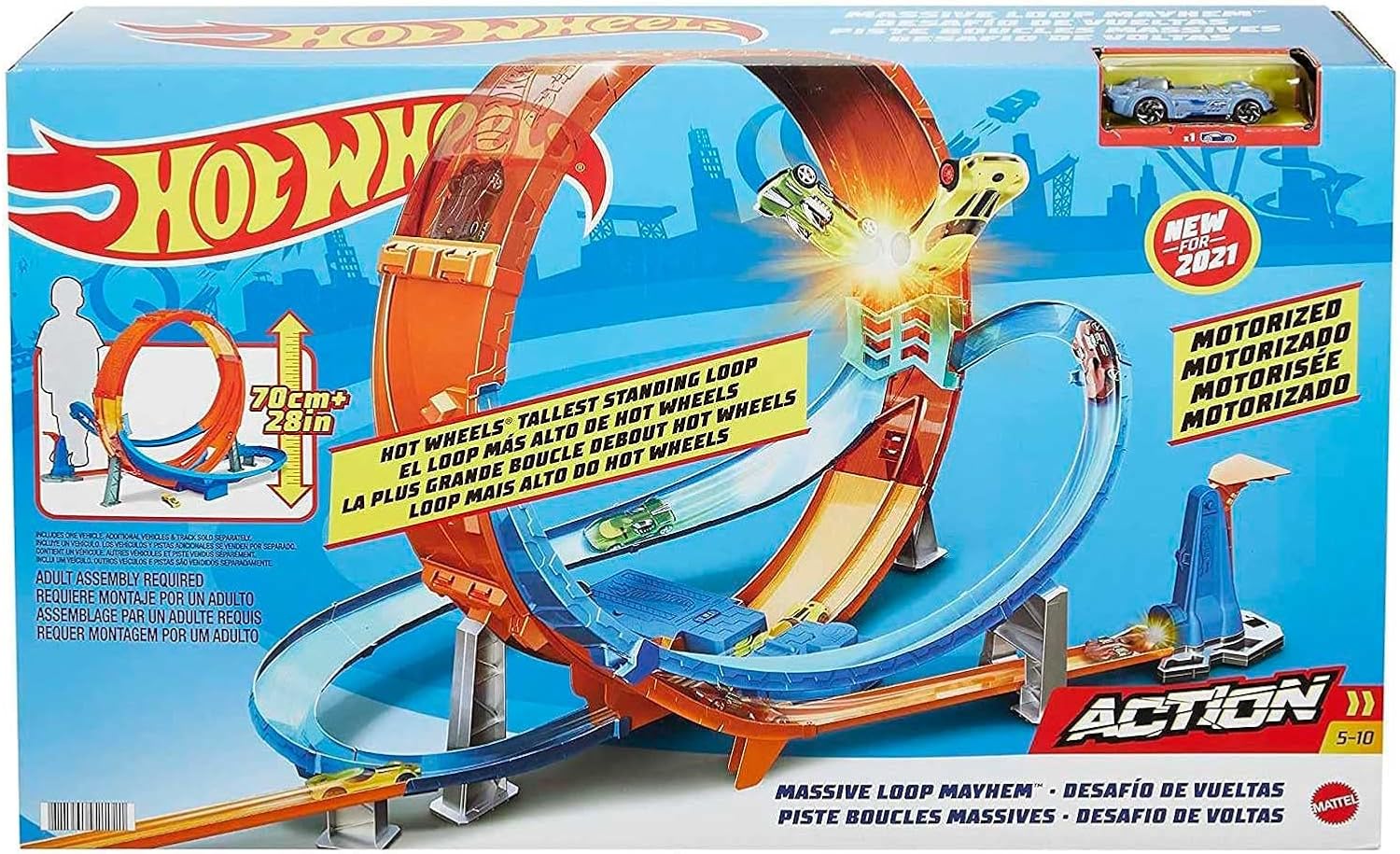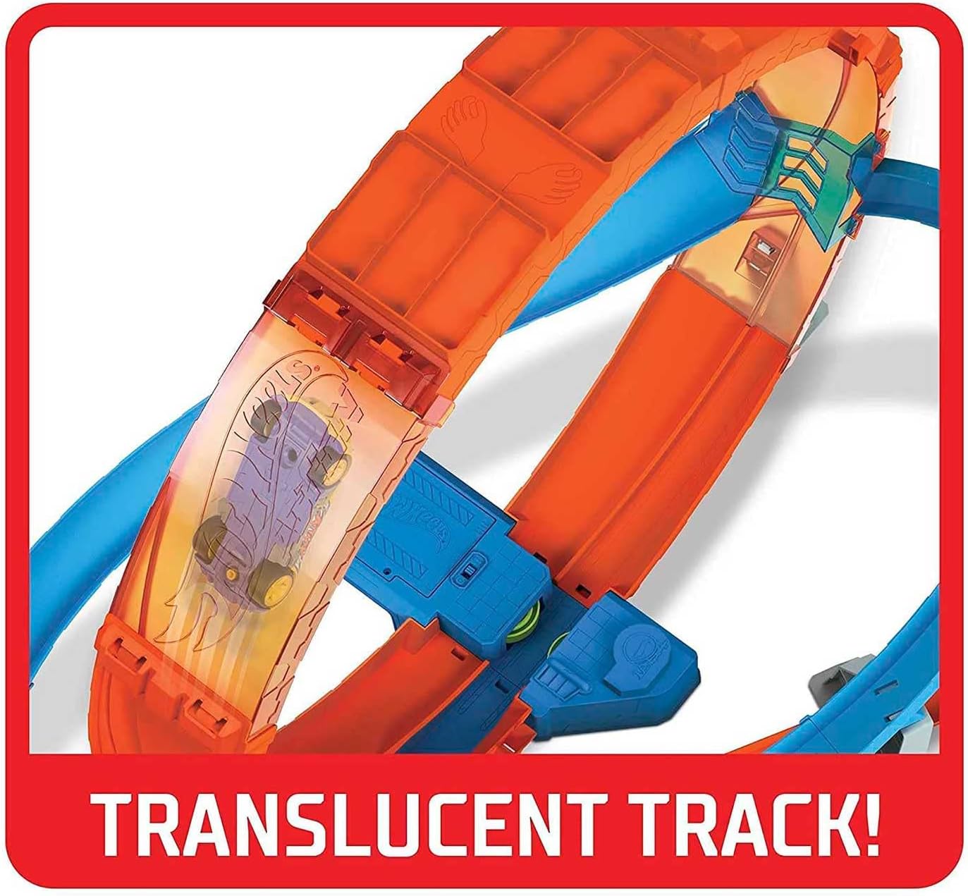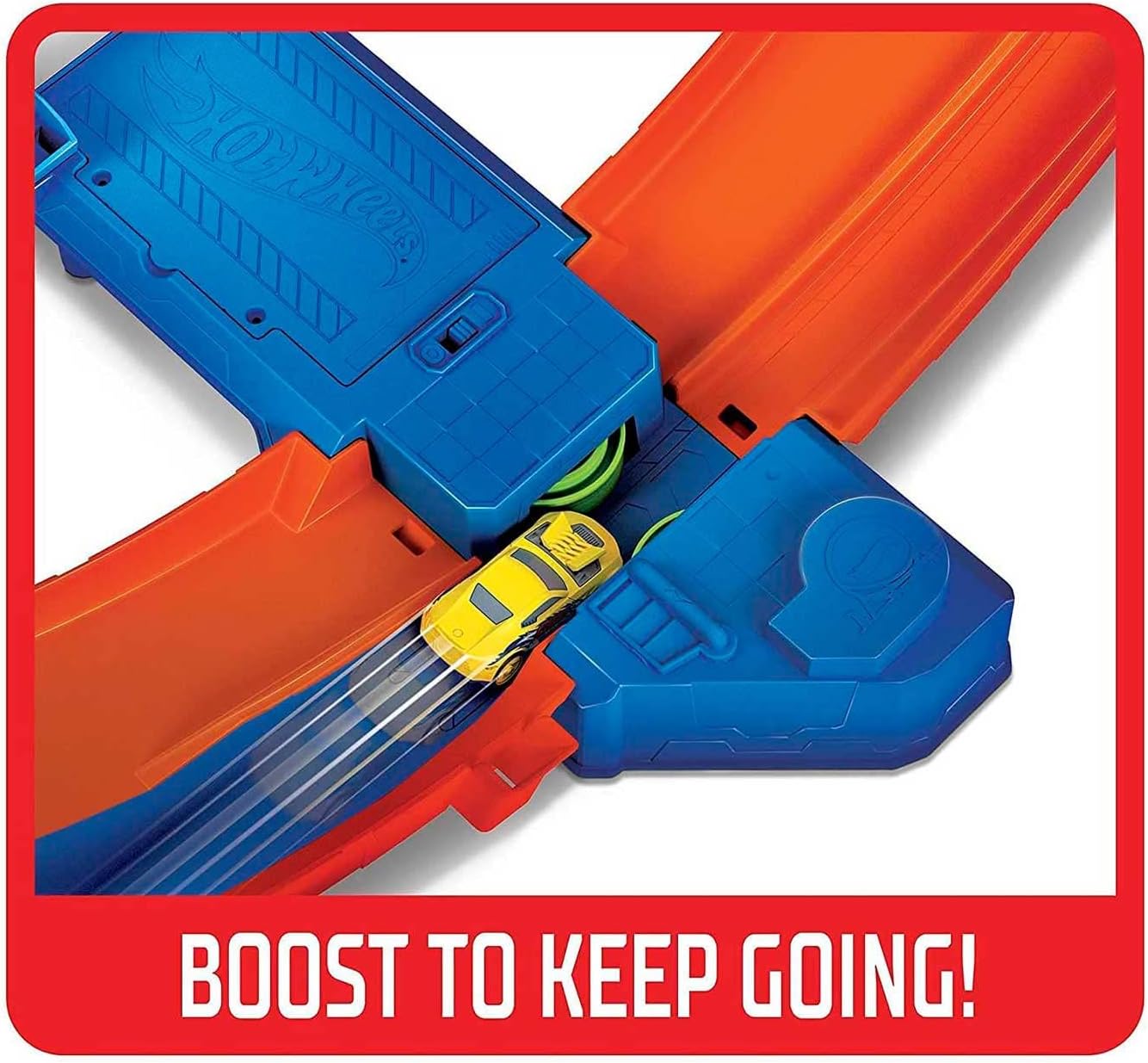 Include un enorme anello largo 70 cm con scatola batteria lanciatore Slam e scatola batteria booster per veicoli Hot Wheels in scala 1:64 che mantiene le auto in movimento continuo