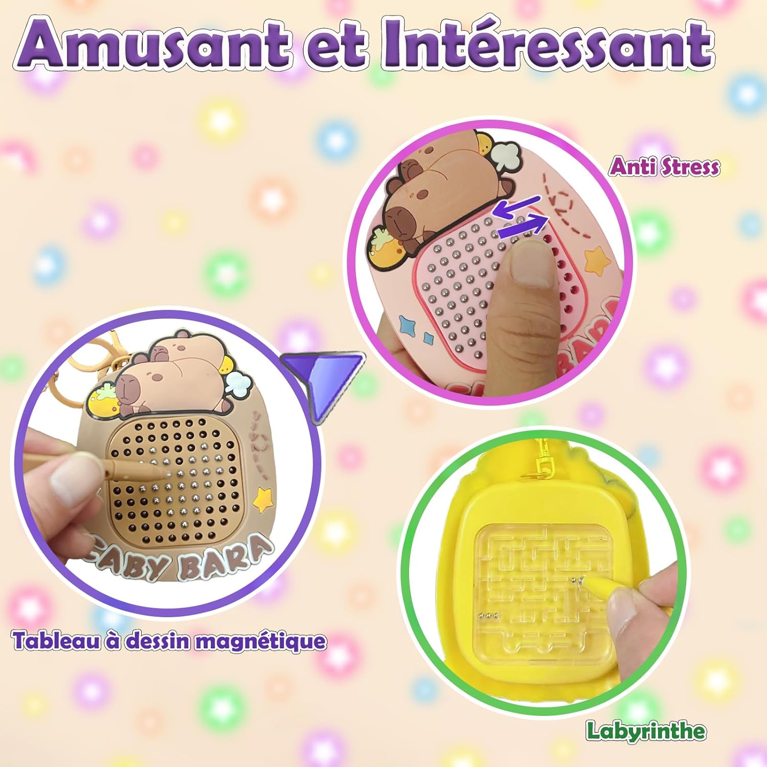 Design 2 in 1: la parte anteriore dei giocattoli fidget è un tavolo da disegno magnetico. Lascia che i tuoi bambini scatenino la loro creatività puntando la punta magnetica dello stilo su ciascun foro per spostare le perline magnetiche. Resetta con un semplice tocco, senza bisogno di pulire! La parte posteriore contiene un labirinto divertente, che offre intrattenimento e sfide senza fine. Metodo di decompressione unico: succhia delicatamente le sfere magnetiche, quindi premi le sfere d'acciaio con le mani. Le sfere d'acciaio emetteranno un suono gradevole, regalandoti in un istante un'esperienza sensoriale unica e stimolante. Divertente gioco di puzzle: questo oggetto antistress migliora la concentrazione e la coordinazione occhio-mano. Può aiutare i bambini a ridurre il tempo trascorso davanti allo schermo, a sviluppare capacità di pensiero e ad alleviare lo stress e l'ansia! Un giocattolo ideale per persone irrequiete, ansia, concentrazione, ADHD e autismo! Portatile e facile da trasportare: questo piccolo giocattolo sensoriale tascabile si adatta facilmente a una tasca, a un portafoglio o può essere utilizzato come portachiavi. Che sia per un lungo viaggio in macchina, in aereo o in treno, è facile da trasportare e ti permette di divertirti dove e quando vuoi! Regalo ideale: questi portachiavi giocattolo antistress sono molto apprezzati da un vasto pubblico, in particolare adolescenti e impiegati. È un regalo ideale per compleanni, Natale, Ringraziamento, Pasqua, San Valentino e altre festività!