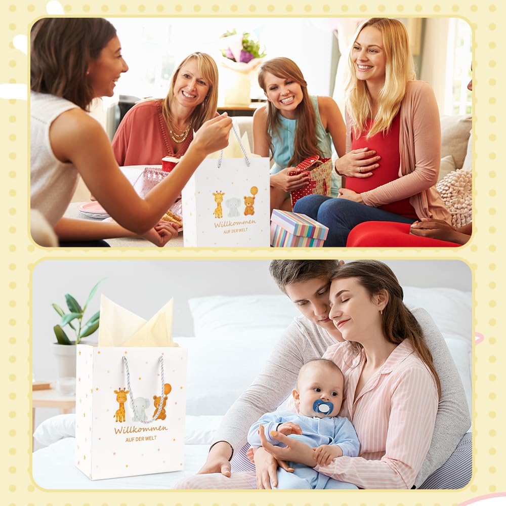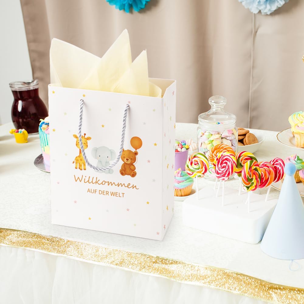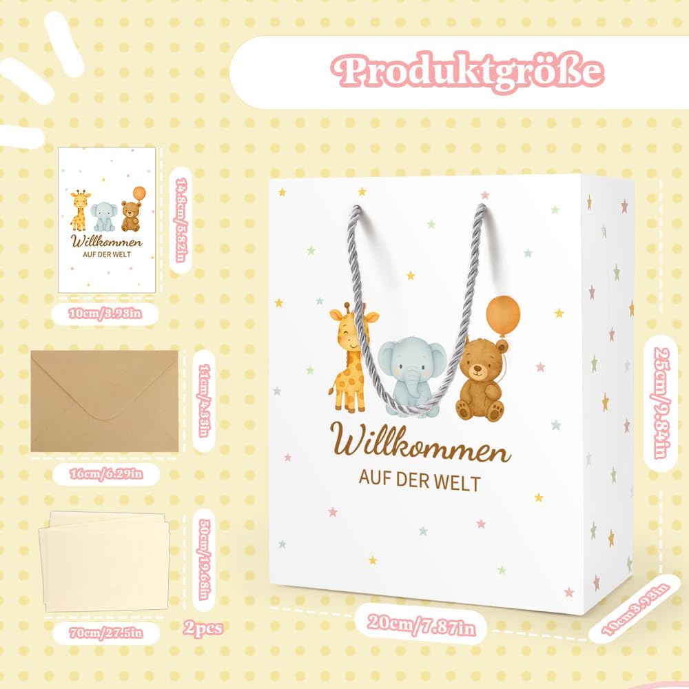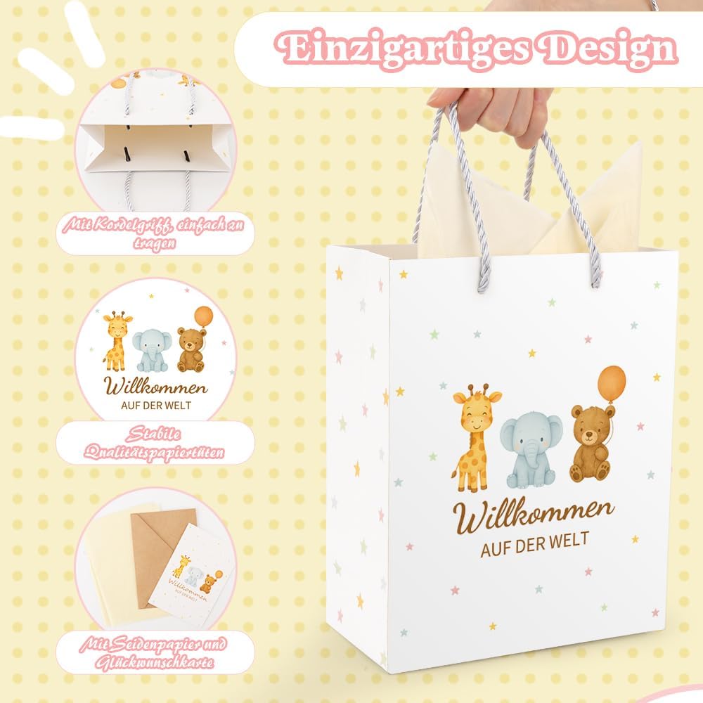 【Regali di nascita】 Bellissimo sacchetto regalo per la nascita di un bambino, un baby shower o un baby shower - ideale come regalo di nascita per genitori, famiglia, amici e colleghi. Offre spazio sufficiente per confezionare con amore sorprese speciali, regali in denaro o piccole bomboniere. 【Taglia】 Ogni sacchetto regalo è di ca. 25×20×10 cm, ogni carta velina misura 70×50 cm. I 2 fogli di carta velina gialla possono essere utilizzati per decorare il sacchetto regalo o per incartare piccoli regali. Con robusta maniglia in corda per un trasporto confortevole. 【Regalo per la nascita di un bambino e di una bambina】 I sacchetti regalo con carta velina gialla, biglietto di auguri abbinato e busta sono perfetti come regalo per la nascita di un bambino o come regalo per la nascita di una bambina. Con graziosi motivi di animali e la scritta "Welcome to the World" sulla borsa, ogni regalo viene presentato in modo particolarmente caloroso e amorevole. 【Qualità Premium】 Il sacchetto di carta è realizzato in robusto cartone bianco da 300 g, durevole e dimensionalmente stabile. Il nostro prodotto è ecologico, inodore e sicuro per l'uso quotidiano: una scelta sostenibile e di alta qualità per i tuoi regali per il baby shower. 【Servizio al 100%】 Riceverai 1 sacchetto regalo con motivi di animali, 2 fogli di carta velina gialla e 1 biglietto di auguri con busta abbinata. Se non sei soddisfatto del nostro prodotto, contattaci tempestivamente tramite Amazon: rimborseremo o sostituiremo immediatamente l'articolo.