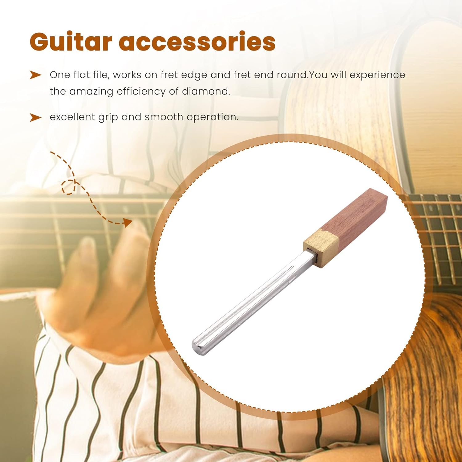 4. È realizzato in acciaio al carbonio di alta qualità e saldamente rivestito con simili al diamante. Ciò garantisce il servizio di lunga durata di questo file. 1. Sono forniti slot per calibri in 1 mm, 2 mm, 3 mm, 4 mm. Lo slot da 1 mm funziona per extra stretti, come gli ukulele; Lo slot da 2 mm funziona per tutte le chitarre standard, basso, banjo, mandolino, chitarre per sigari; Lo slot da 3 mm, 4 mm funziona per jumbo. Ciò significa che funzionerà maggior parte degli strumenti a corda. 2. Una piatta, funziona sul bordo del tasto e sul bordo del tasto rotondo. Sperimenterai l'incredibile efficienza del diamante. Il gambo della mano è in legno massello: ottima presa e scorrevolezza. 3. Modo abrasivo diamantato a grana grossa per questa applicazione, utilizzare gomme per che rendono i lisci come burrosi. 5. Alta all'usura ed eccellente durata