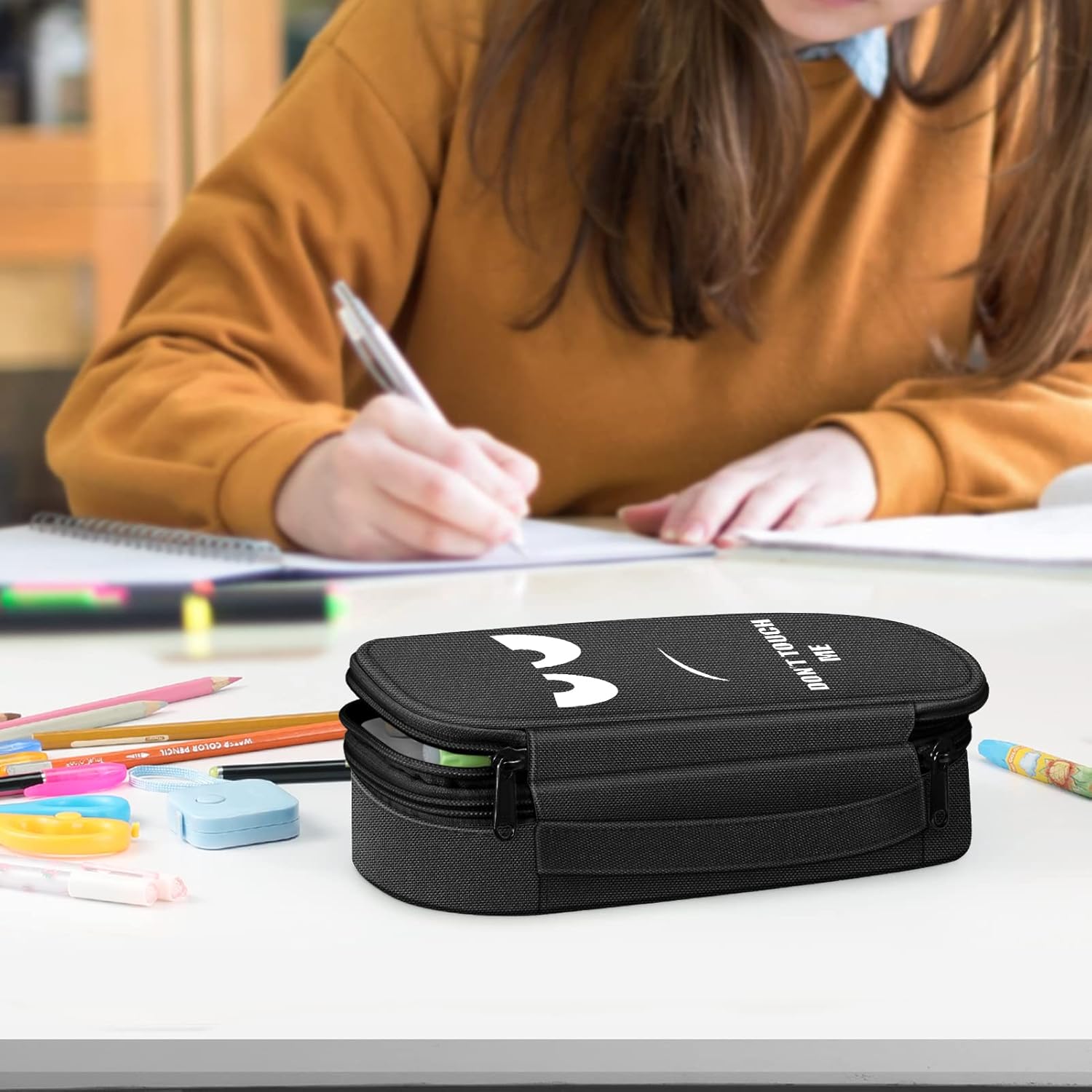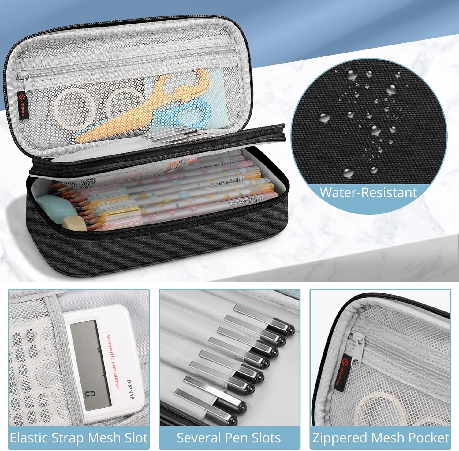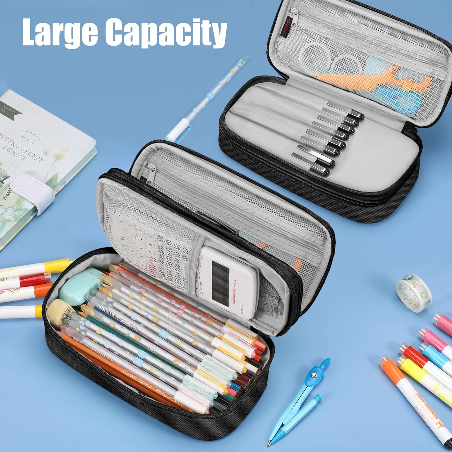 [Grande capacità] Dimensioni: 21,8 x 10,9 x 7,6 cm, l'astuccio può contenere fino a 50 penne o 100 matite, può anche contenere la Apple Pencil e la maggior parte delle calcolatrici grafiche. Questo astuccio soddisfa le esigenze di archiviazione delle cancellerie degli studenti. DISEGNI UNICI: Lo spazio di archiviazione con 2 scomparti può contenere righelli da 7,8 pollici, calcolatrici, gomme, nastro adesivo, ecc. Gli scomparti con tasche a rete con cerniera offrono spazio spazioso per conservare piccoli oggetti o accessori. MATERIALE PREMIUM: utilizza materiali di rivestimento in poliestere 272T e nylon resistenti all'acqua, comodi, compatti e facili da pulire. Le cerniere lisce e resistenti sono facili da chiudere e aprire. MULTIUSO: può essere utilizzato come astuccio per penne per ufficio e scuola, lavoratore per l'organizzazione dell'ufficio, astuccio da viaggio o per trucchi, astuccio per acquerelli per artisti e designer. REGALO PRATICO: è un regalo carino per amici, colleghi o compagni di classe; perfetto regalo di compleanno o regalo di Natale per gli studenti. (Solo caso, altre forniture non sono incluse)