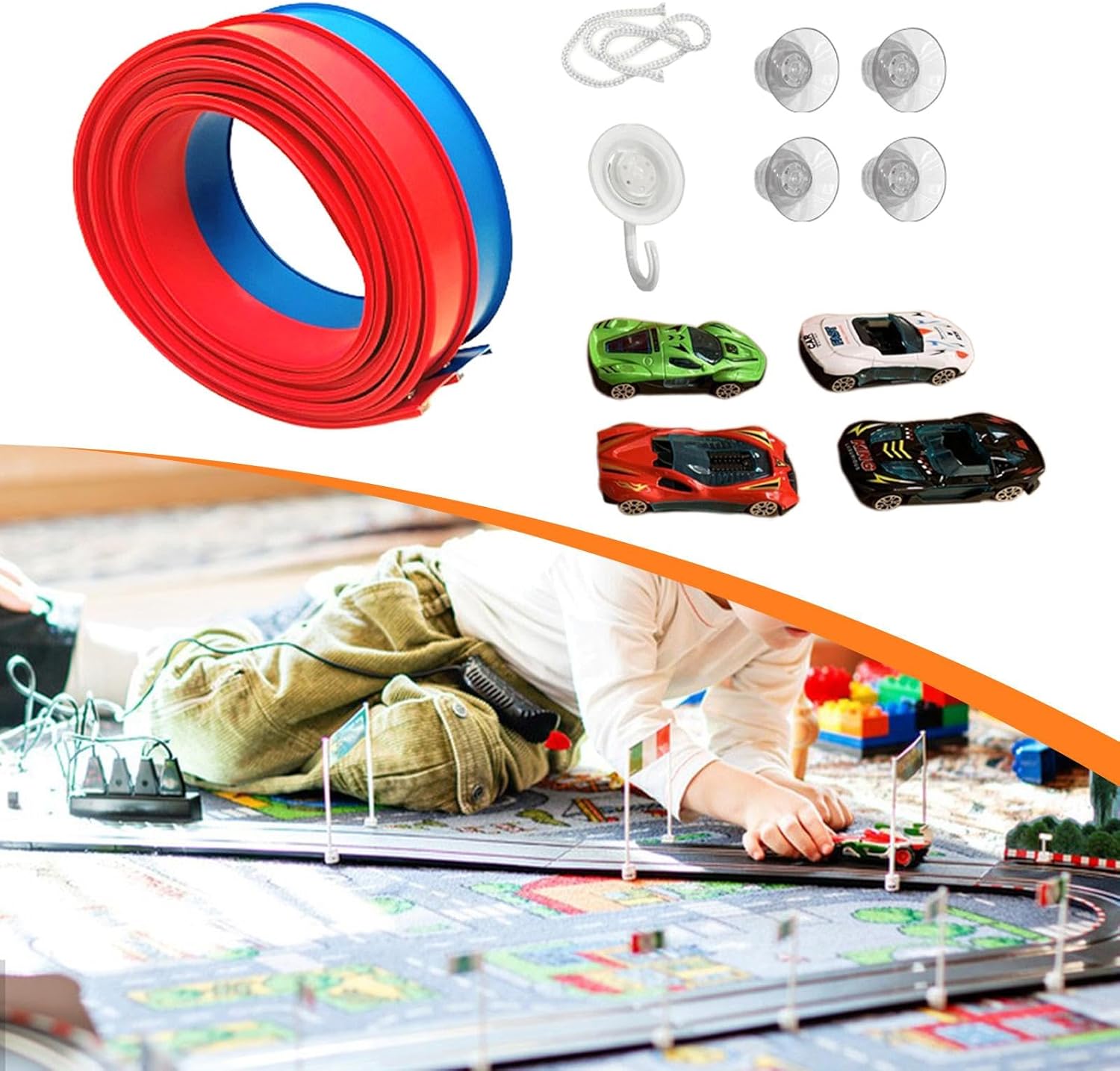 【REGALO PER GIOVANI CORRIDORI】: Questo versatile set di piste è la scelta ideale per compleanni e festività. Realizzato in polipropilene, è progettato per offrire ore di intrattenimento coinvolgente per bambini dai 3 anni in su. 【DIVERTIMENTO FAI DA TE】: Questa enorme pista flessibile può essere piegata, curvata e modellata in innumerevoli configurazioni. I bambini possono costruire emozionanti, curve strette e persino loop impegnativi, stimolando la loro immaginazione e capacità di problem solving. 【AZIONE EMOZIONANTE AD ALTA VELOCITÀ】: L'esclusivo design flessibile consente al modello di auto incluso di accelerare, sfrecciare attraverso curve strette e spiccare dai . È un'esperienza di gioco dinamica che dà vita ai concetti di velocità in modo divertente e pratico. 【INSTALLAZIONE IMMEDIATA e FACILE DA CONSERVARE】: Grazie all'innovativo design a ventosa, questa pista flessibile per auto da corsa si fissa saldamente a tutte le superfici: pareti, porte, pavimenti o mobili. Al termine della gara, flessibile si arrotola semplicemente per un facile e compatto stoccaggio. Ideale per il divertimento in viaggio e nelle sale giochi. 【SET DA CORSA】: Questo kit completo include auto pressofuse pronte per l'azione. Abbinato alla lunga pista da 4,5 metri, questo set fornisce tutto il necessario